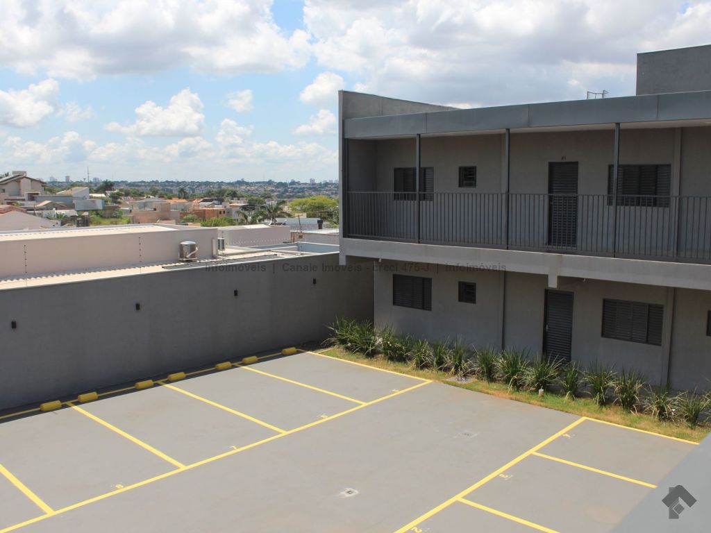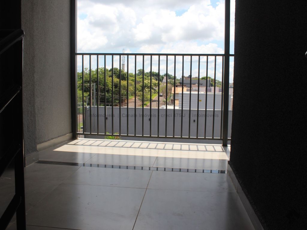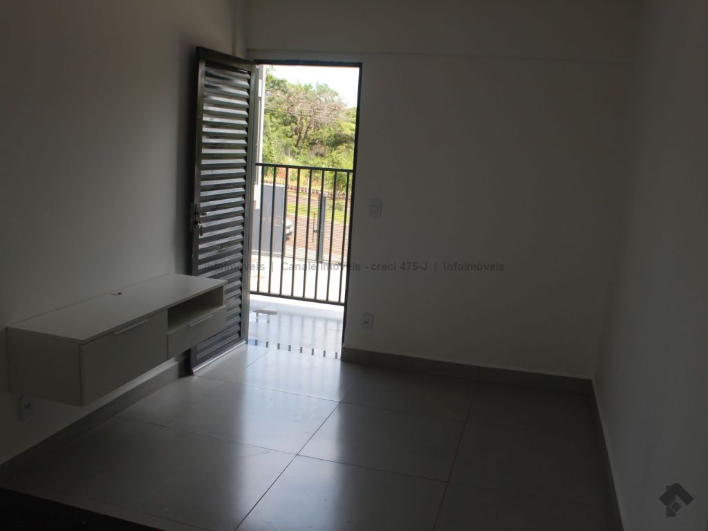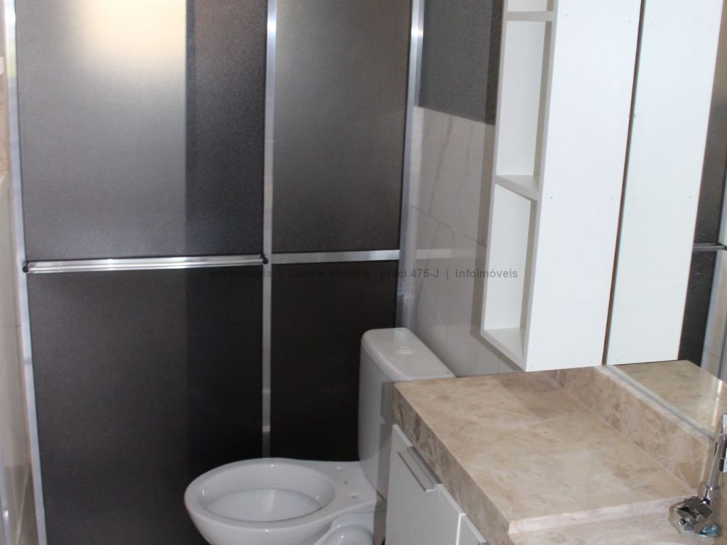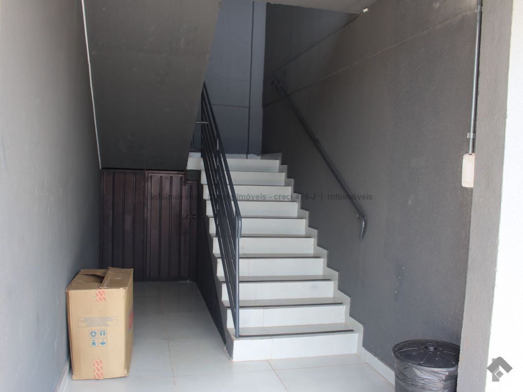 Flat no piso superior com sala de estar com rack, cozinha com armários, lavanderia, 1 quarto com armário, 1 suíte com armário, banheiro social e vaga de garagem.