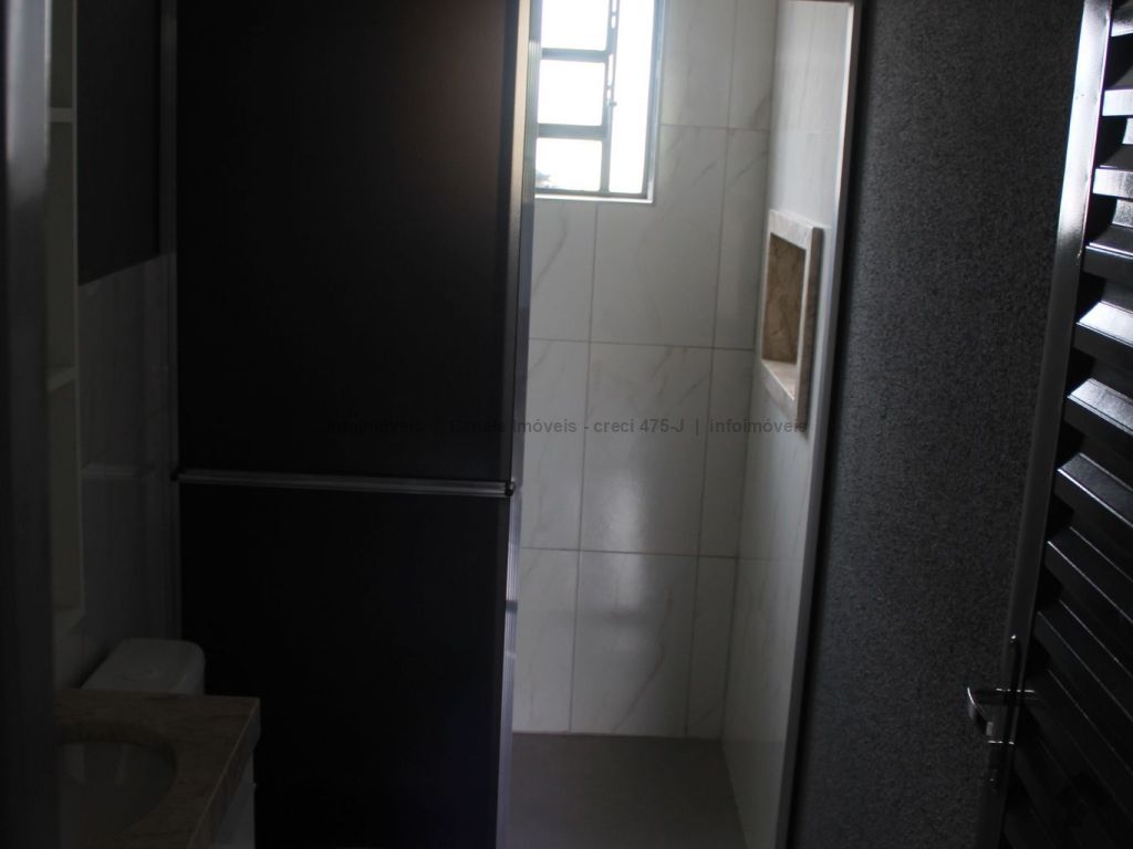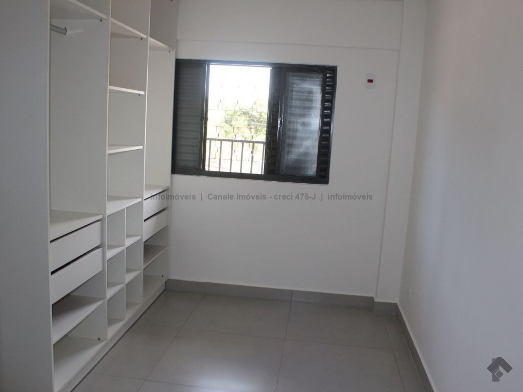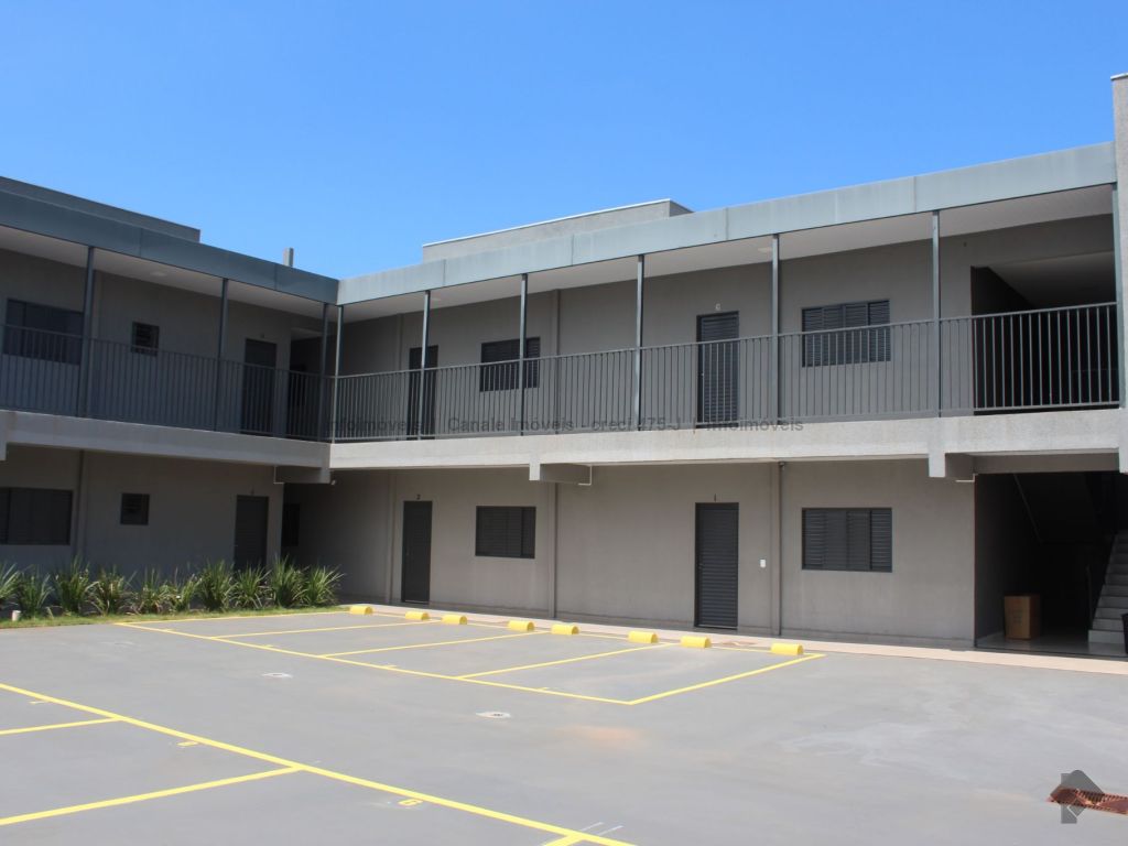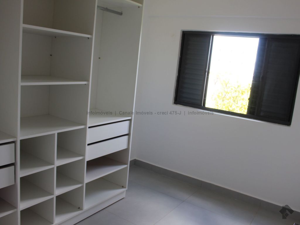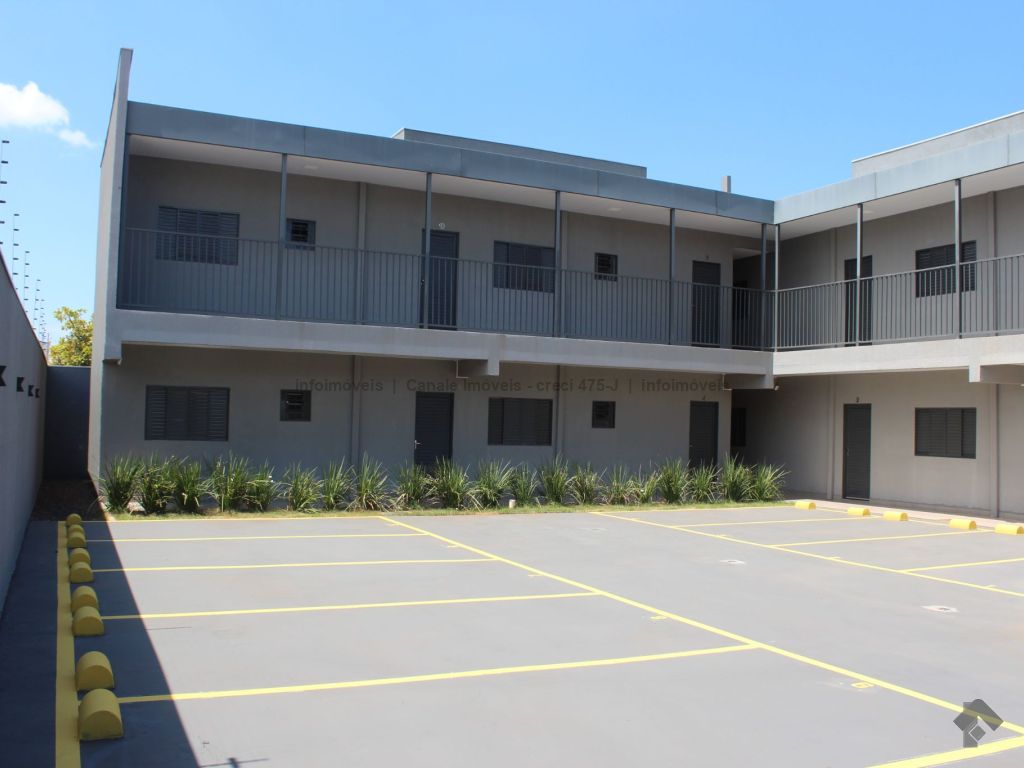 Flat no piso superior com sala de estar com rack, cozinha com armários, lavanderia, 1 quarto com armário, 1 suíte com armário, banheiro social e vaga de garagem.