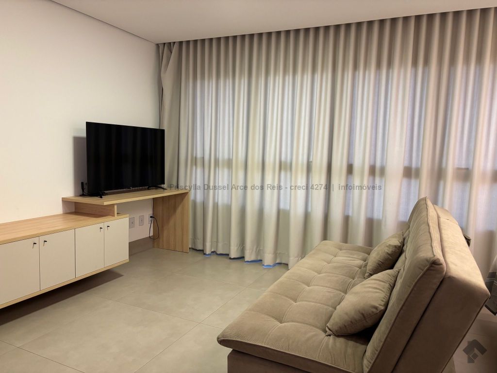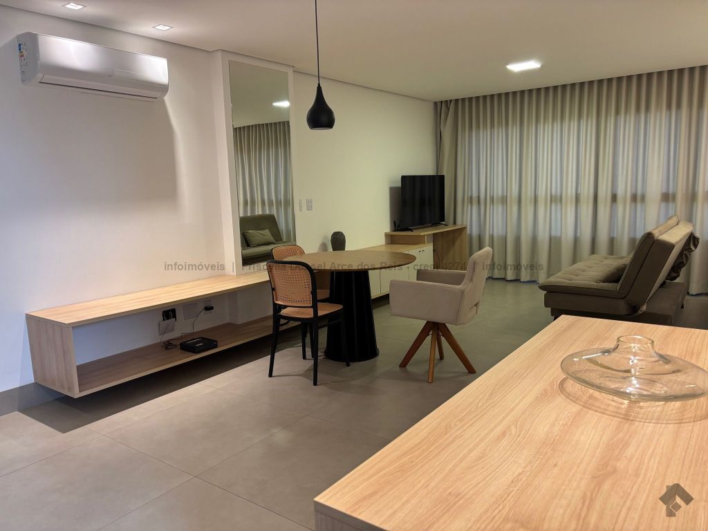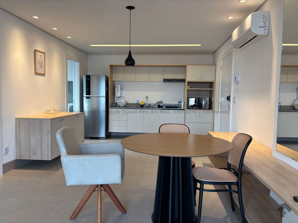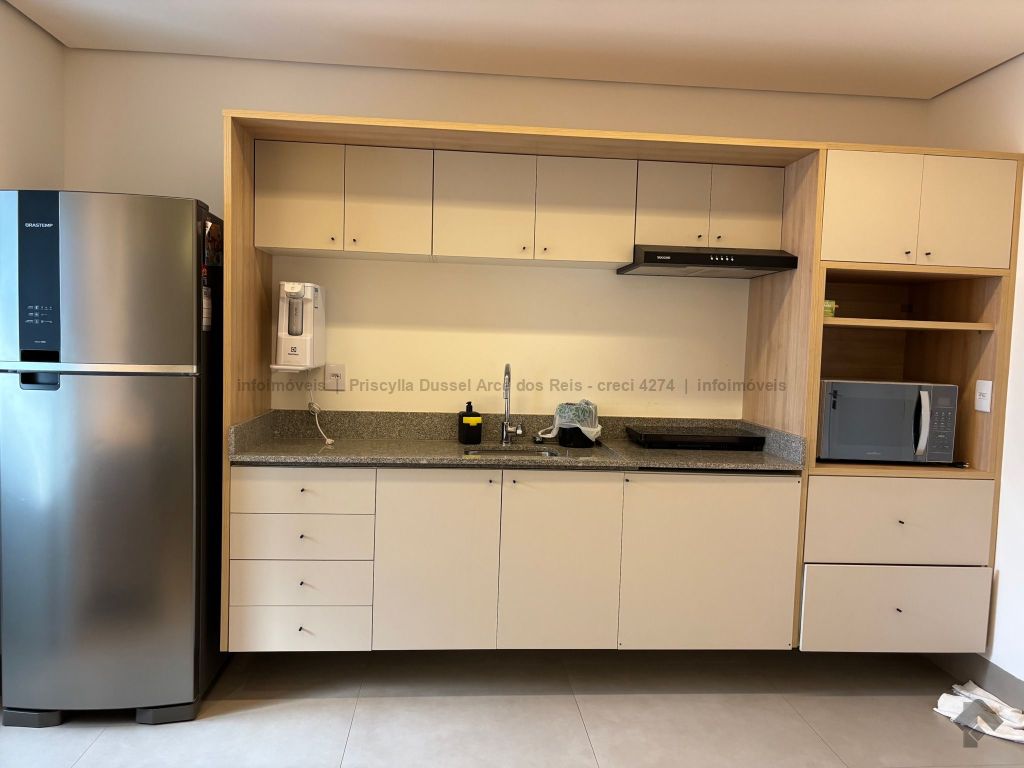 Apartamento mobiliado com móveis, eletrodomésticos e utensílios de cozinha. Possui sala climatizada, quarto com armários e ar condicionado, cozinha planejada, banheiro social e área de serviço equipada. Tem uma vaga de garagem. O condomínio possui academia, coworking, terraço com piscina, espaço de piscina e espaço gourmet.