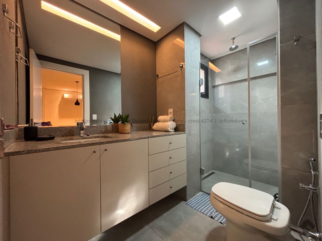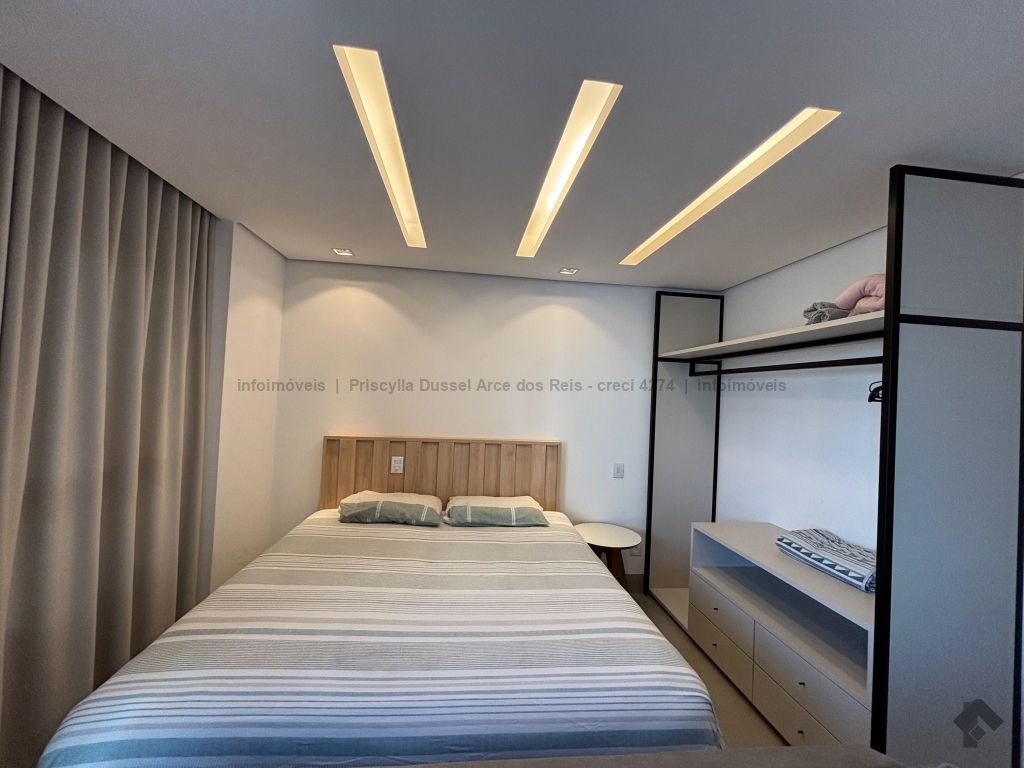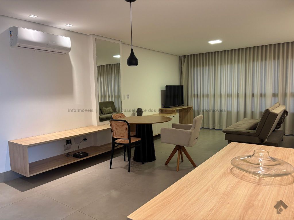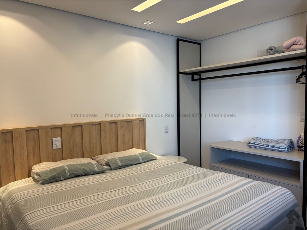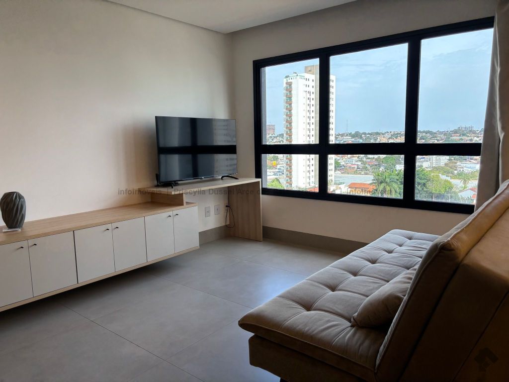 Apartamento mobiliado com móveis, eletrodomésticos e utensílios de cozinha. Possui sala climatizada, quarto com armários e ar condicionado, cozinha planejada, banheiro social e área de serviço equipada. Tem uma vaga de garagem. O condomínio possui academia, coworking, terraço com piscina, espaço de piscina e espaço gourmet.