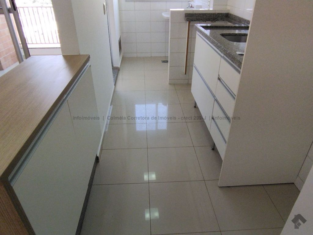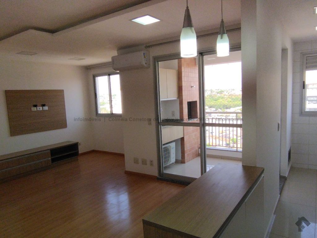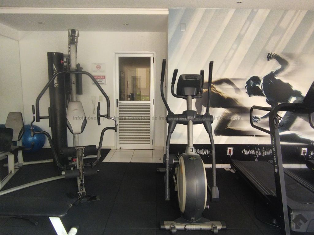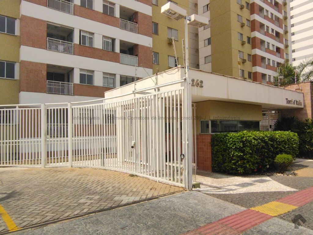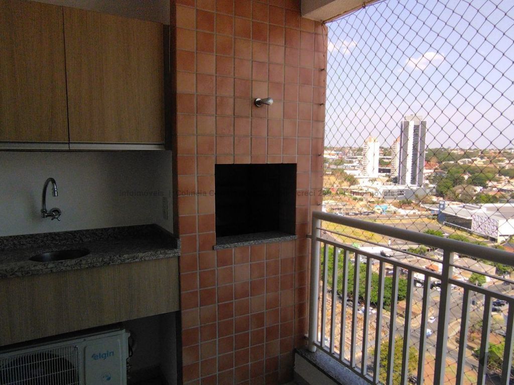 Sala de estar ampla com ar condicionado, sacada com churrasqueira privativa e área externa, banheiro social com box de vidro e armário na pia, uma suíte com armário embutido e ar condicionado, banheiro da suíte com box blindex e gabinete na pia, um quarto com armário embutido e ar condicionado, cozinha com armário embutido, área de serviço com armário embutido, garagem coberta para um veículo.