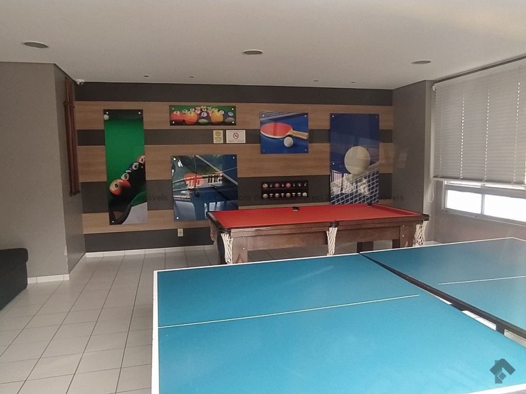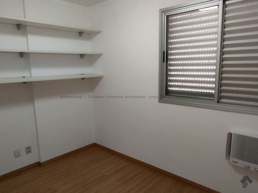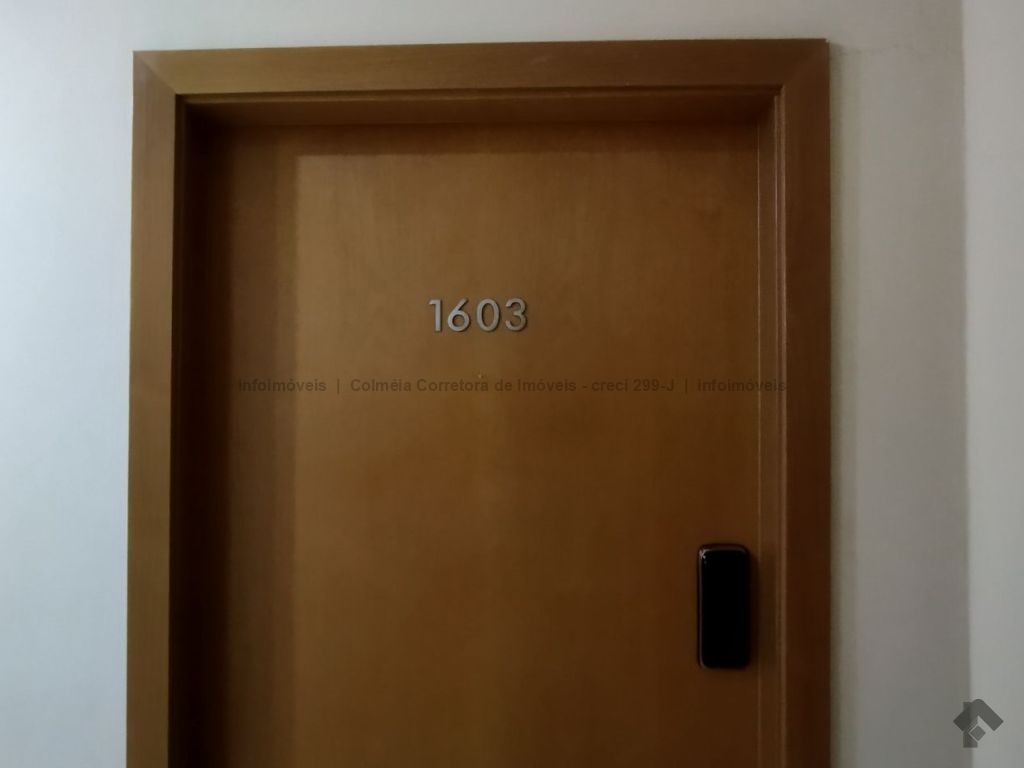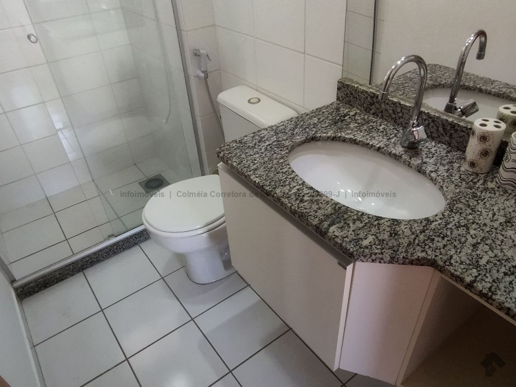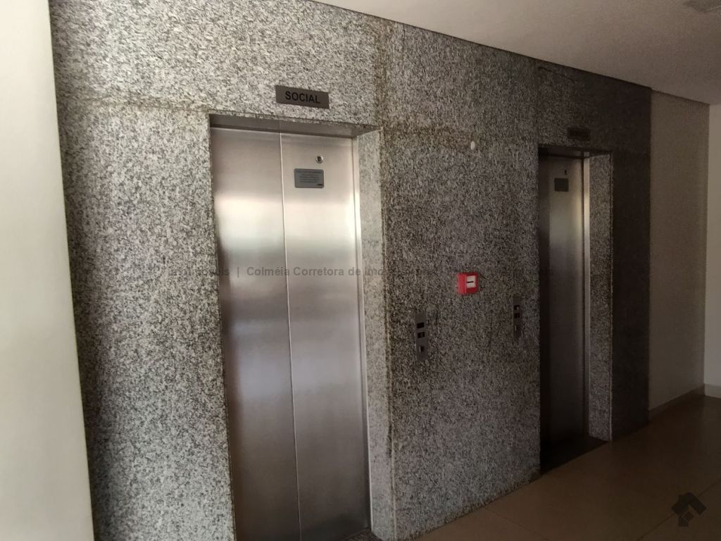 Sala de estar ampla com ar condicionado, sacada com churrasqueira privativa e área externa, banheiro social com box de vidro e armário na pia, uma suíte com armário embutido e ar condicionado, banheiro da suíte com box blindex e gabinete na pia, um quarto com armário embutido e ar condicionado, cozinha com armário embutido, área de serviço com armário embutido, garagem coberta para um veículo.