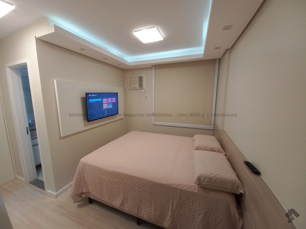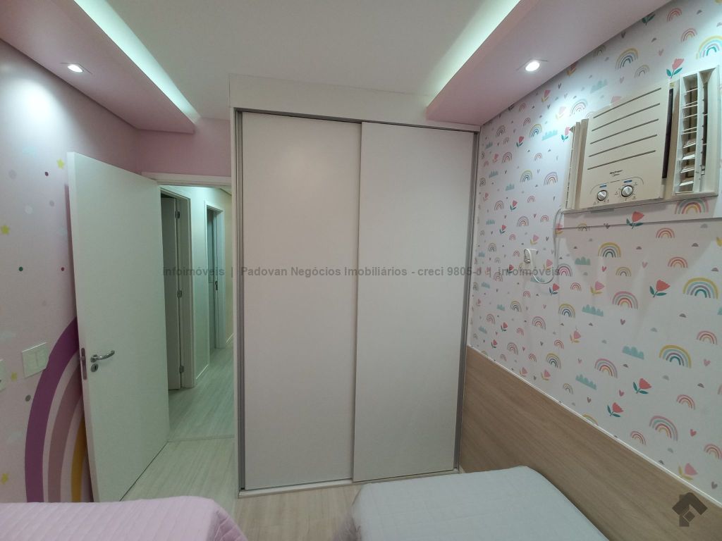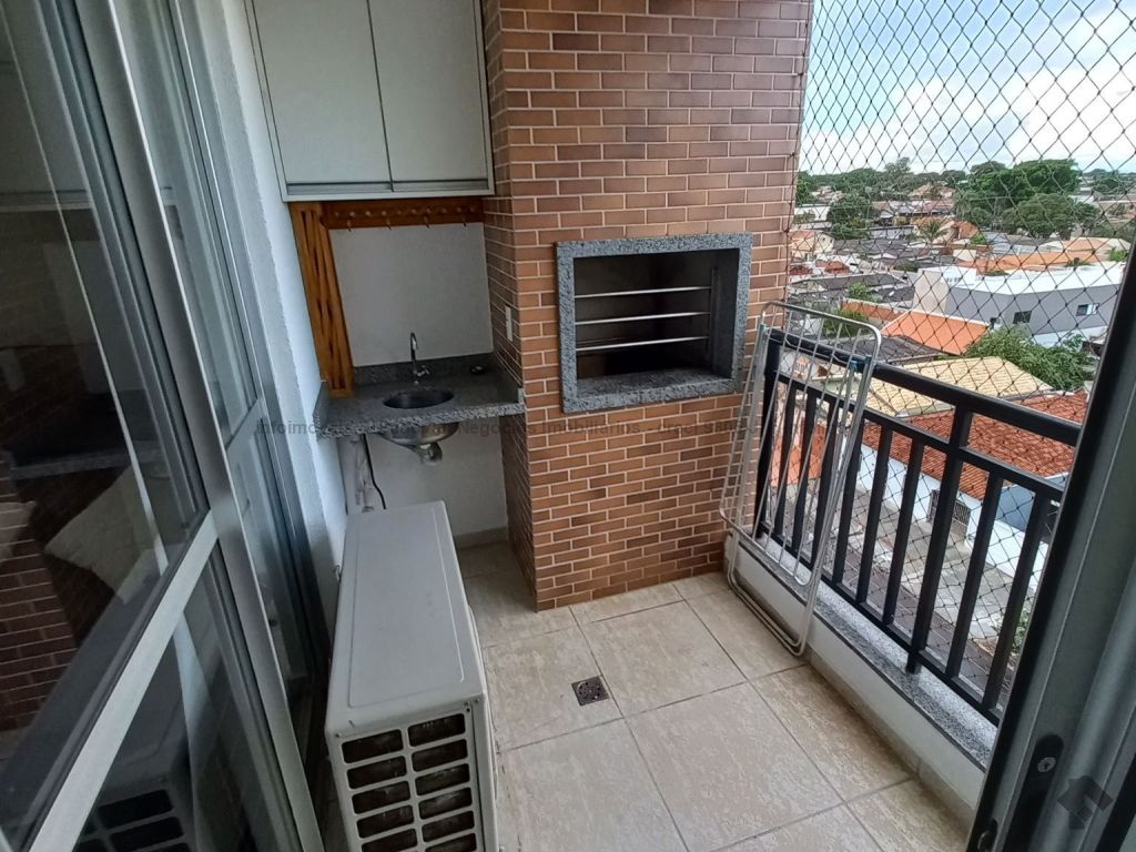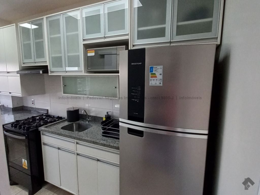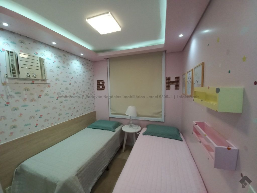 Imóvel possui sala de estar com sofá retrátil, carpete, persiana, TV 50" e ar-condicionado, sala de jantar com mesa de vidro, cadeiras e armário vintage, cozinha com armários planejados, geladeira, forno micro-ondas, fogão 4 bocas, coifa, área de serviço com lavadora lava e seca 11 kg, área gourmet com pia, armário planejado e churrasqueira, banheiro social com armário planejado, box de vidro temperado, 1 suíte com cama box, armários planejados, persiana, painel com TV 48" e ar-condicionado, banheiro da suíte com armários planejados, box de vidro temperado, 1 quarto com cama de casal box e armário planejado, e 1 quarto com 2 camas box solteiros, persiana e ar-condicionado. O condomínio oferece academia.
