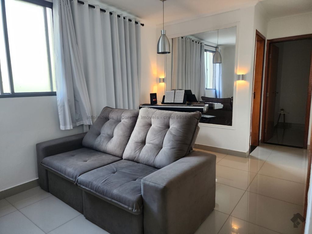Apartamento compacto e charmoso. Conta com sala, cozinha, dois quartos, sendo um deles com armário planejado e o outro com ar condicionado, além de banheiro social com armário e box de vidro temperado. O condomínio possui área de churrasqueira e parquinho.