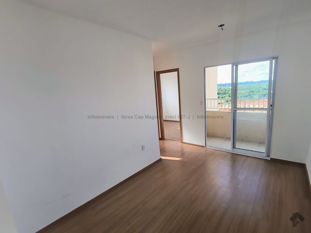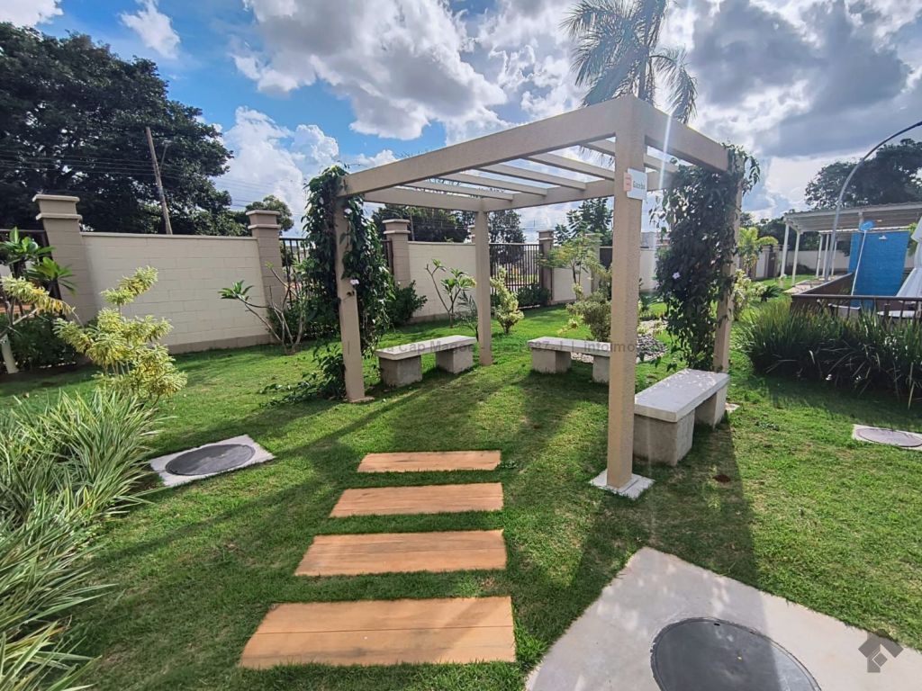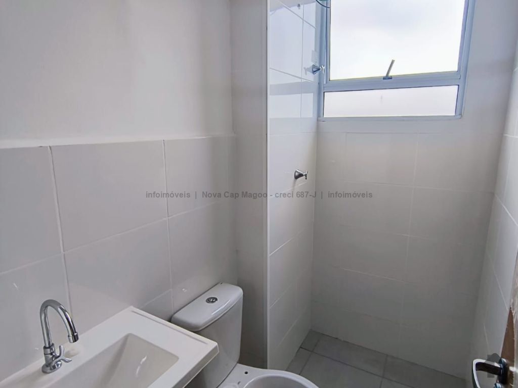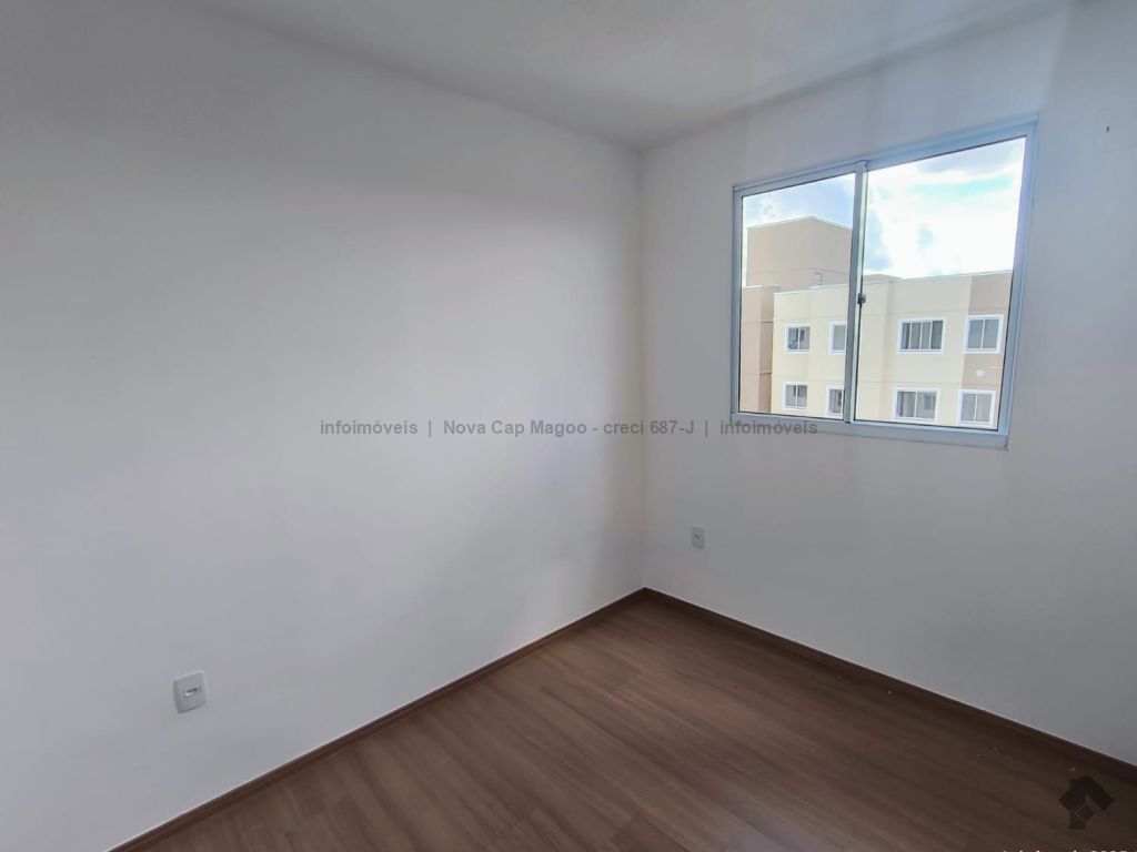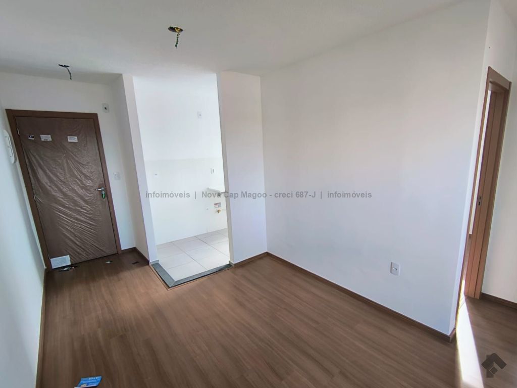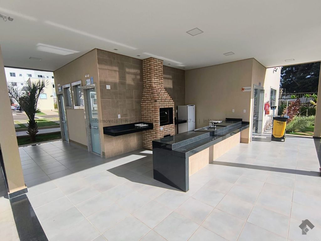 Garagem coberta, sacada, sala, cozinha, área de serviço, WC social, 2 quartos. Condomínio com área de churrasqueira, piscina e playground.