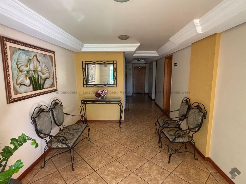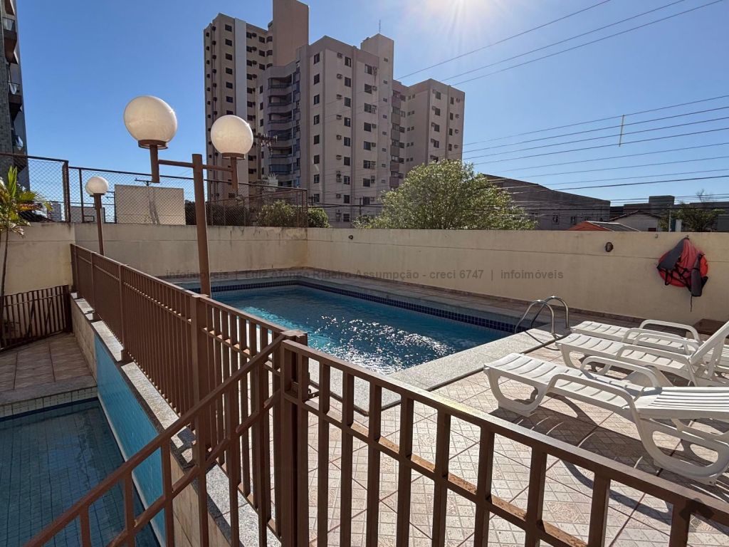 Apartamento contendo sala com dois ambientes e sacada, cozinha com gabinete, suíte com armário embutido, um quarto com armário embutido, um quarto, banheiro social com armários e box, área de serviço, banheiro de serviço, área gourmet e piscina.