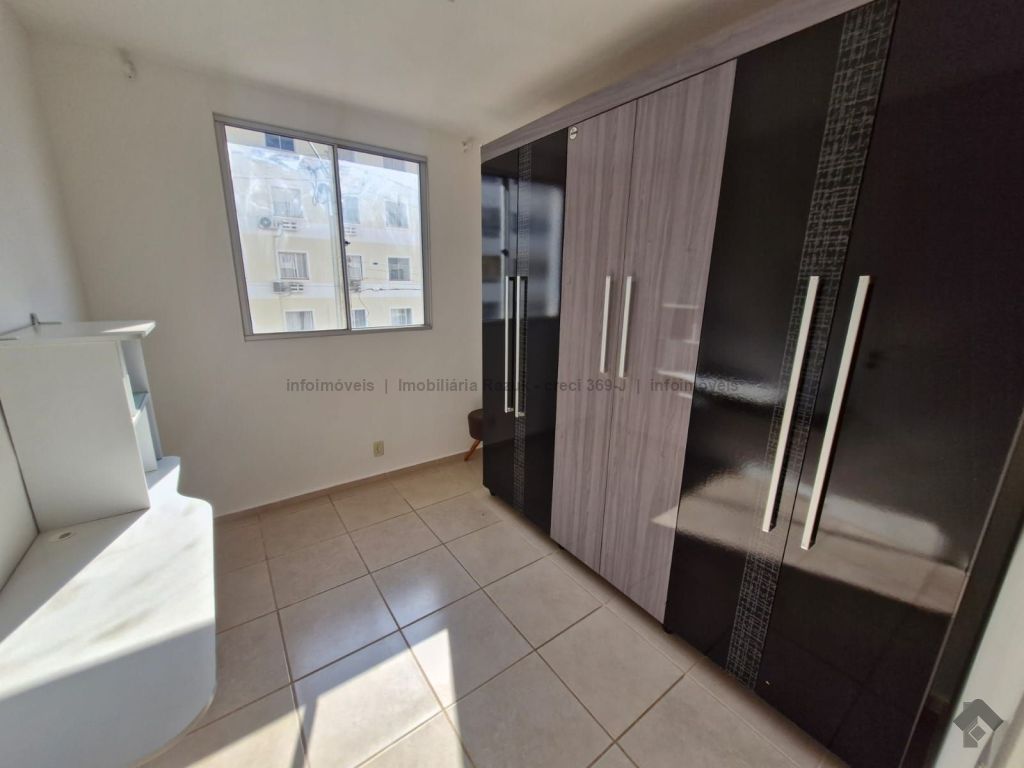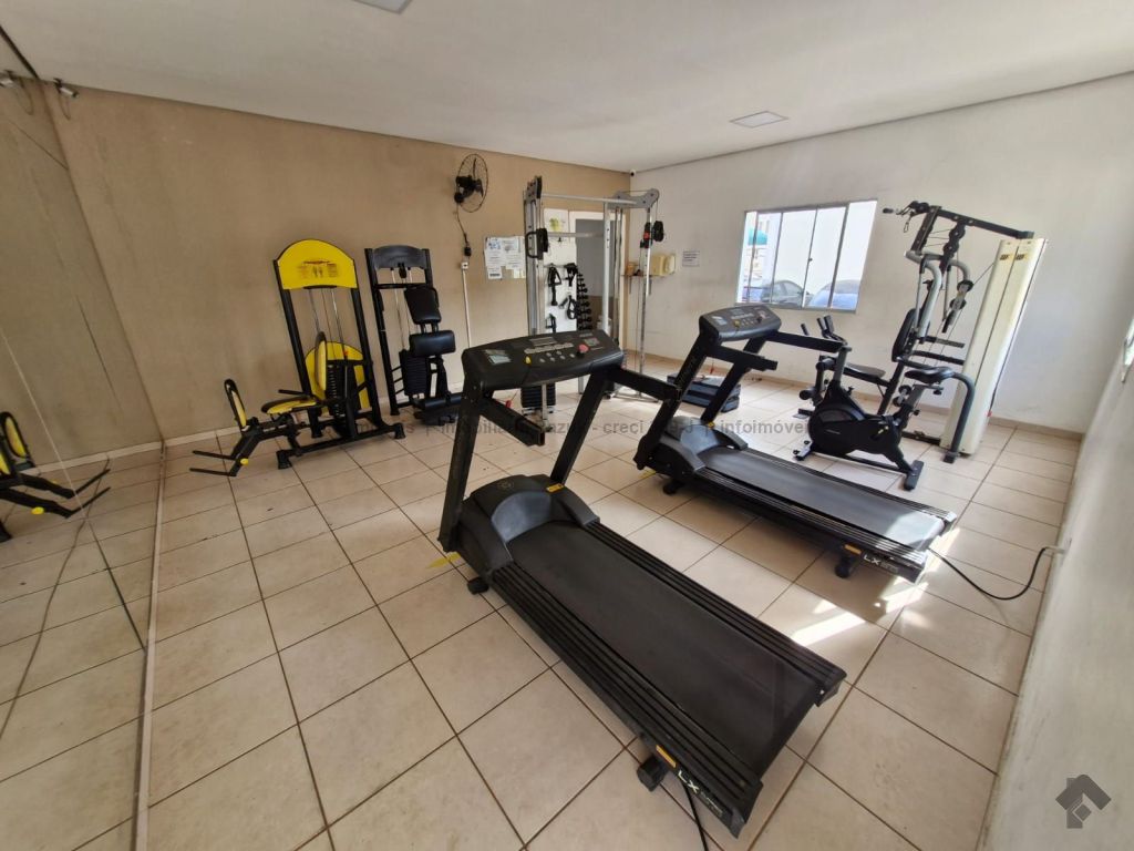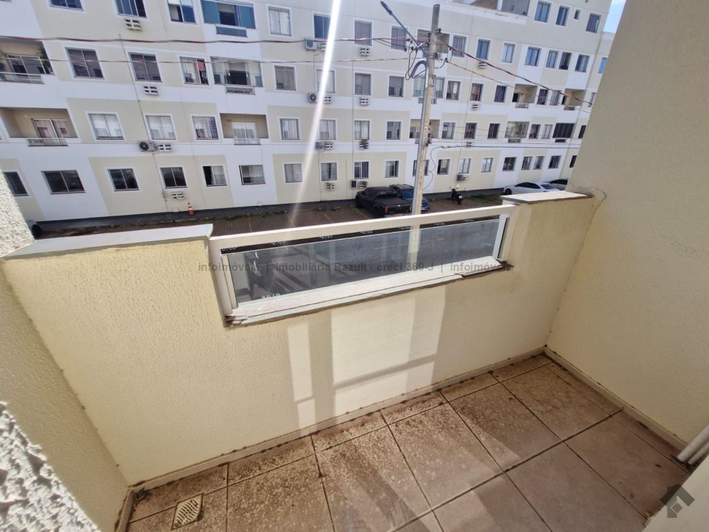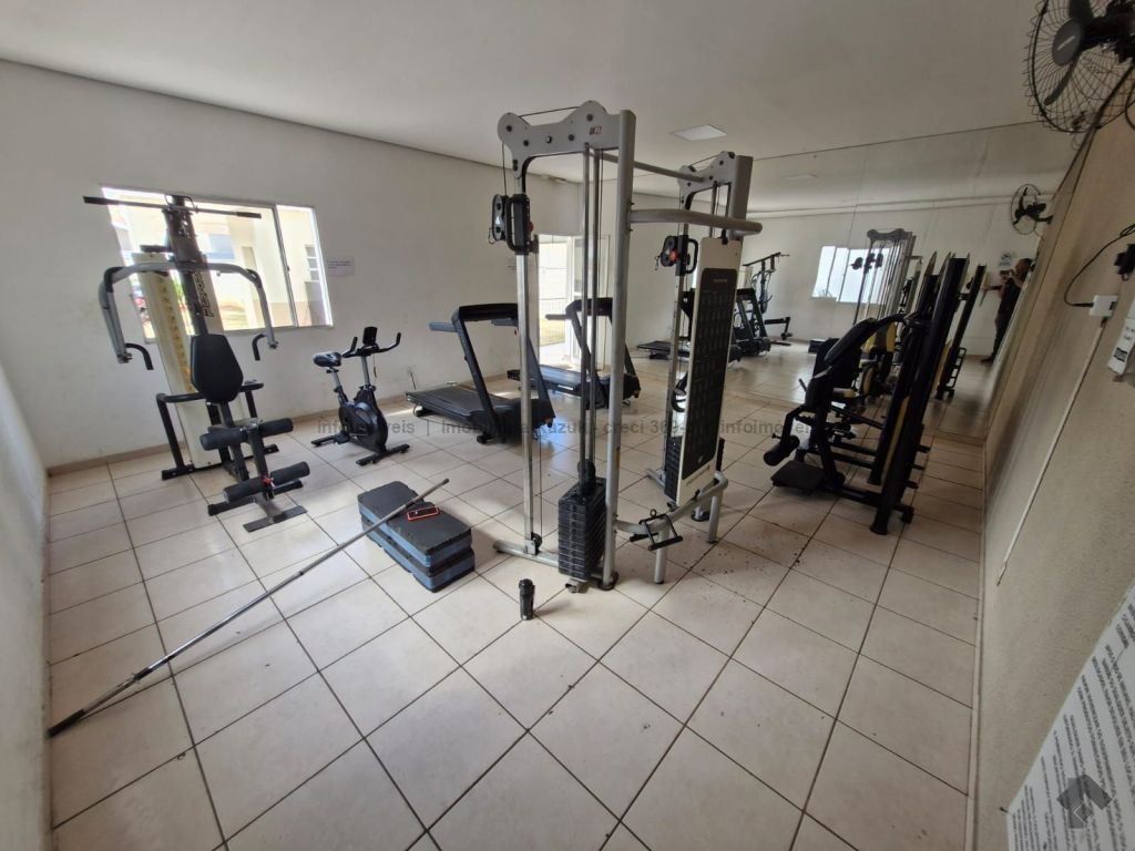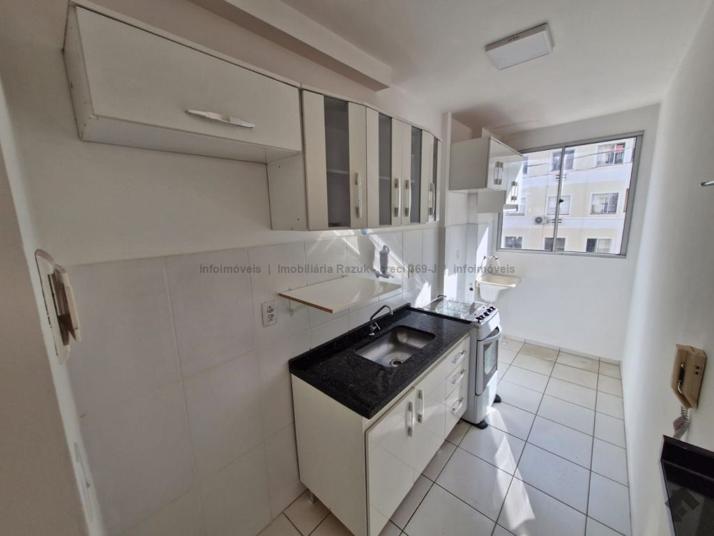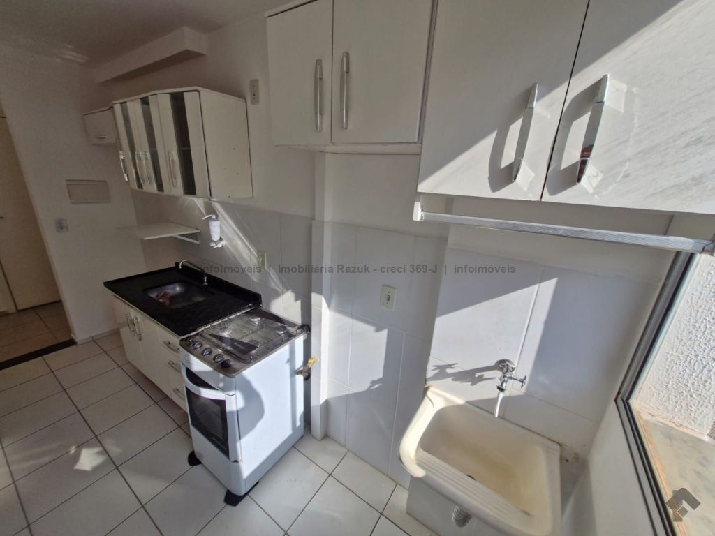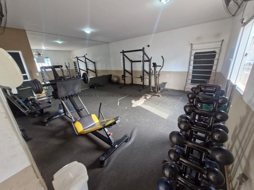 Sala com sacada, painel para TV e mesa com 4 cadeiras. Cozinha com armários, fogão e balcão. 2 quartos, sendo um com guarda-roupa e outro com cabeceira de cama. WCs com armário e box blindex. Área de serviço com armário. Condomínio com área de lazer, quadra de esportes, quiosque com churrasqueira e fogão, piscina, salão de festas com churrasqueira e fogão, e academia.