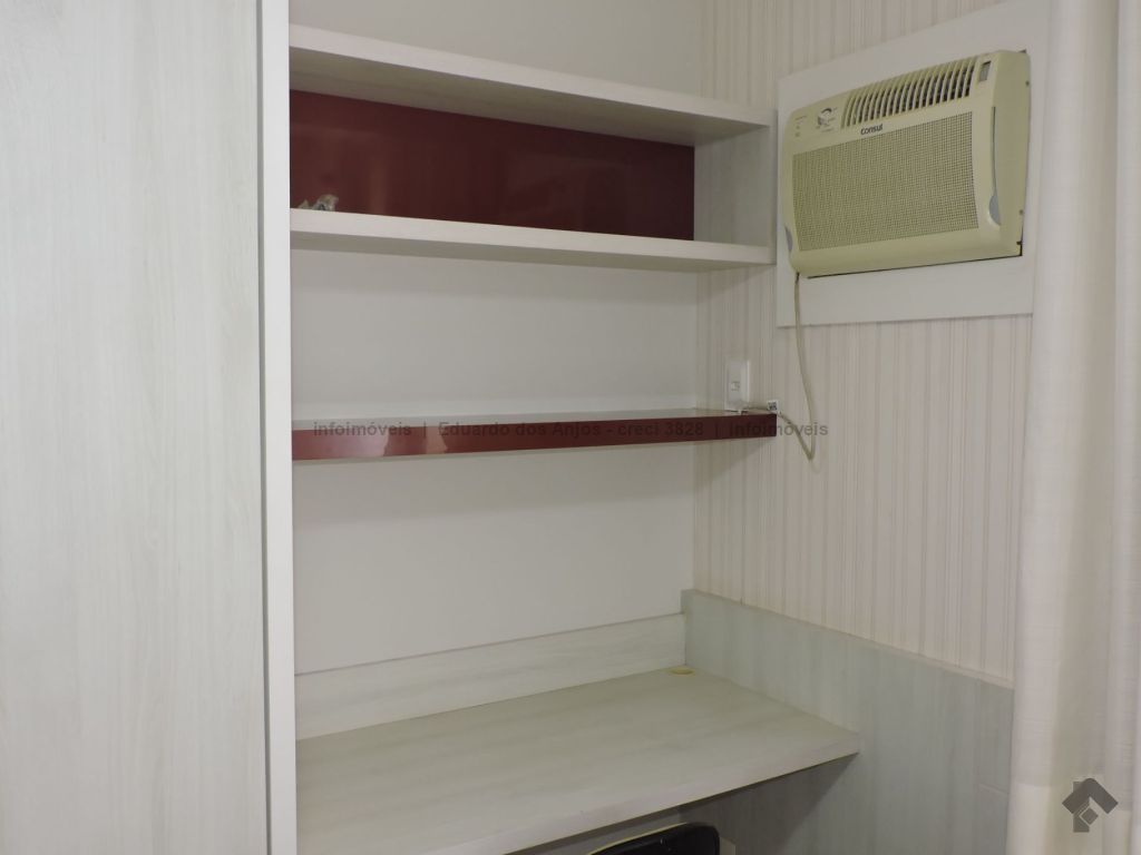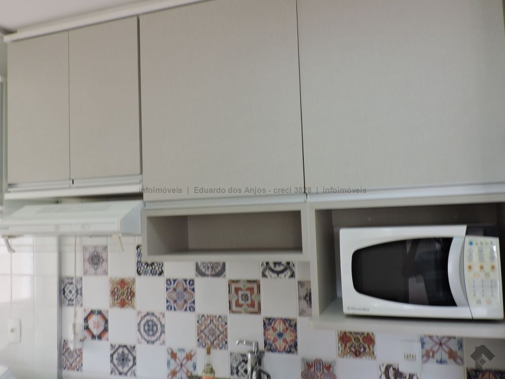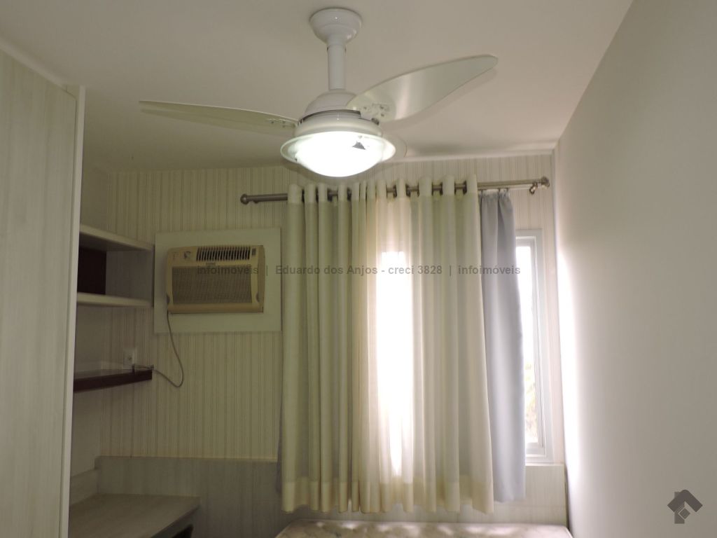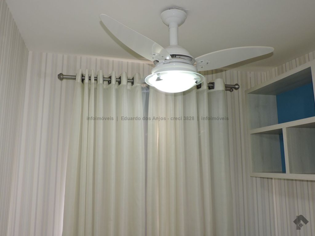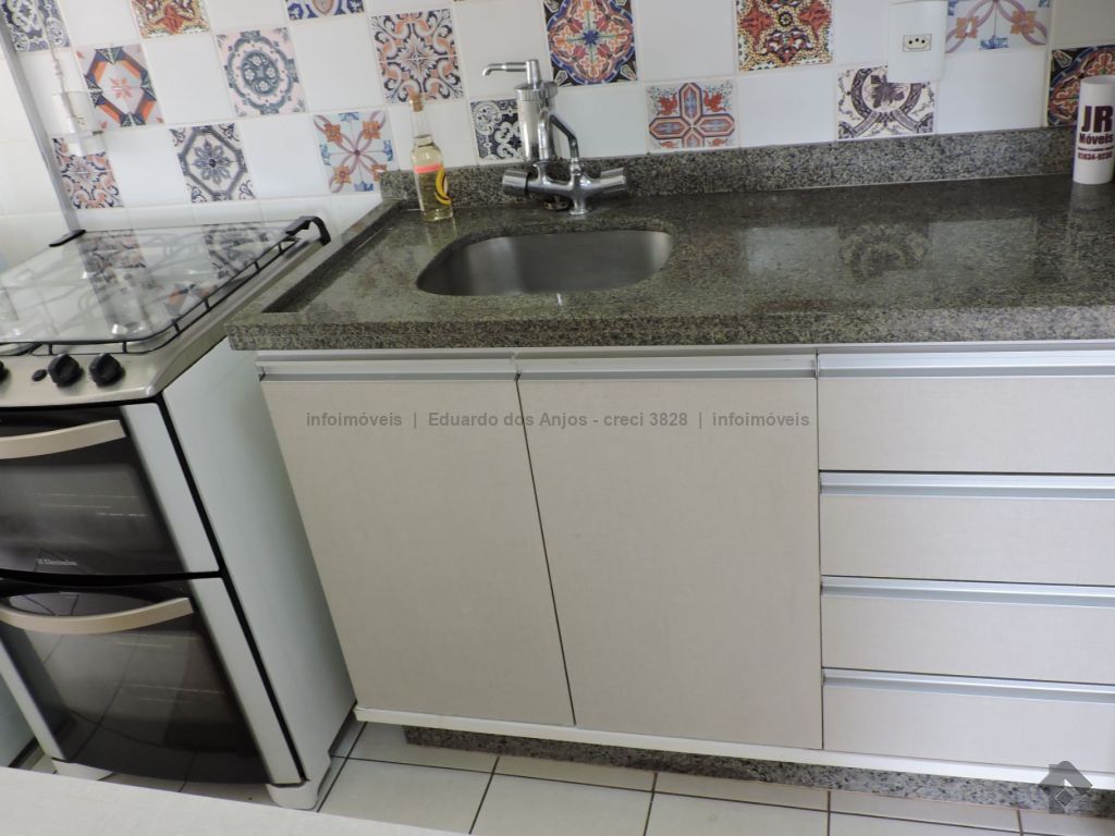 Sala de estar com sofá, duas cadeiras, painel para TV, ventilador de teto, sala de jantar com mesa e cinco cadeiras, 2 quartos com armários embutidos, cama box casal e um solteiro, ambos com ar condicionado. Apartamento com armário embutido, painel para TV, cama box casal, ar condicionado e ventilador de teto. WC da suíte com gabinete da pia e box Blindex. Cozinha com armários planejados, geladeira, fogão e exaustor. Área de serviço com máquina de lavar e armário. 1 vaga de garagem. Apartamento térreo com amplo quintal.