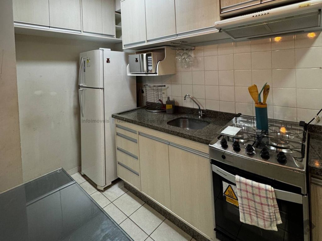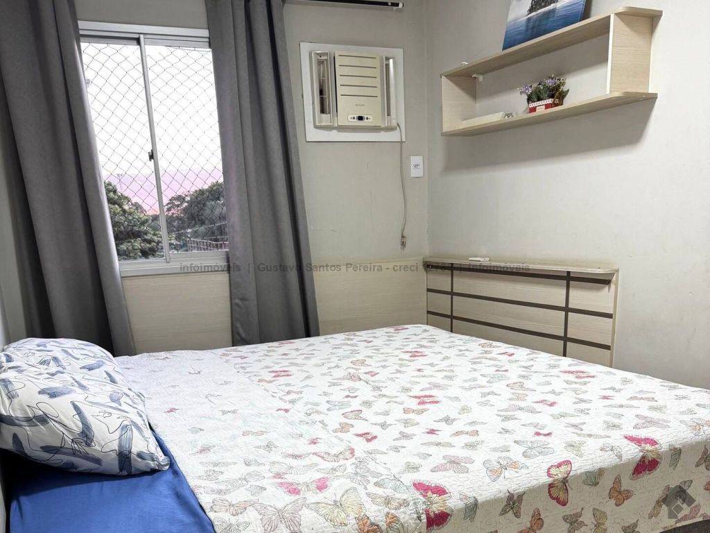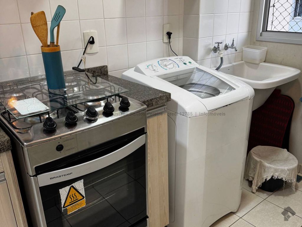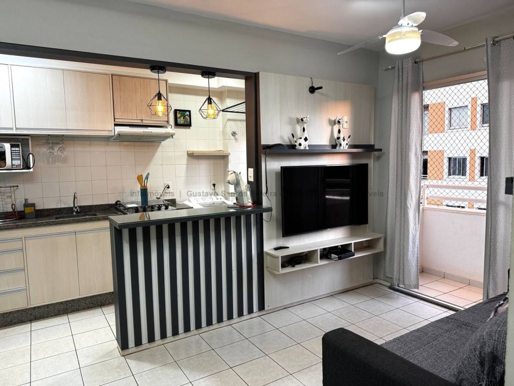 Apartamento totalmente mobiliado e pronto para morar. Contendo: sala equipada com TV tela plana, sofá de 3 lugares, ventilador de teto, cortina e sacada, sala de jantar com mesa de 4 lugares, cozinha americana planejada com geladeira duplex, micro-ondas, fogão de 4 bocas e cafeteira elétrica, área de serviço com máquina de lavar, tanque e varal, banheiro social, 2 dormitórios com armários, sendo um com cama box de casal e ar condicionado e o outro com bi-cama, ventilador de teto e bancada para estudo, porta com fechadura digital, 1 vaga de garagem coberta.