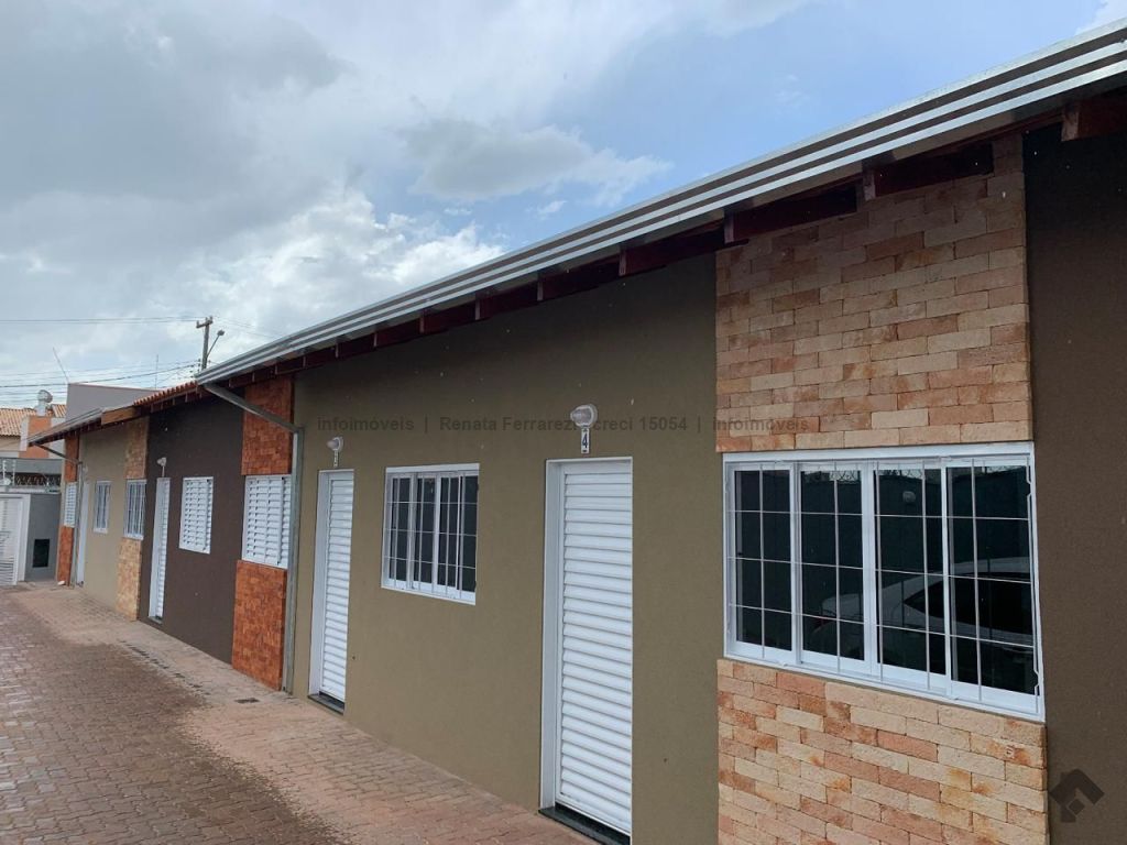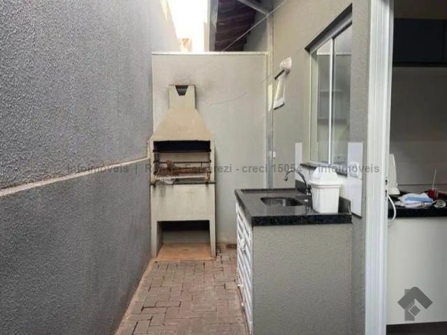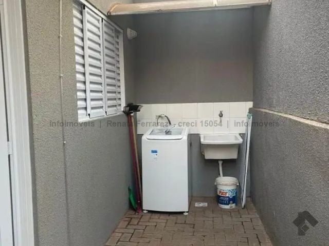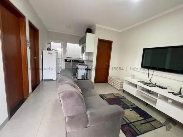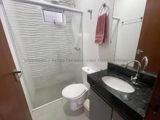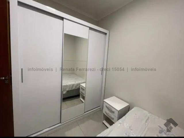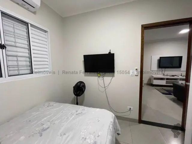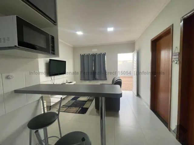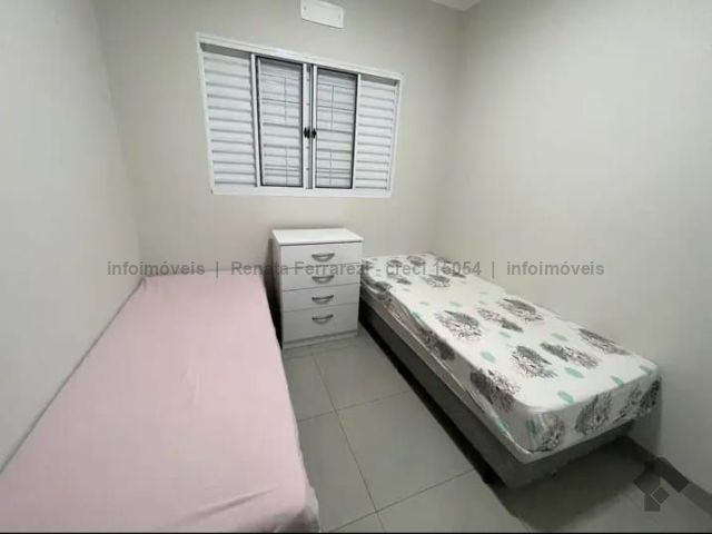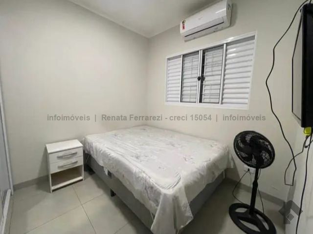 Casa em condomínio mobiliada com um quarto com ar condicionado, cama de casal e armários, segundo quarto com duas camas de solteiro e armário, sala com sofá e rack com TV, cozinha com armários, fogão, geladeira e balcão, banheiro com armário, área de serviço com máquina de lavar e churrasqueira, garagem.