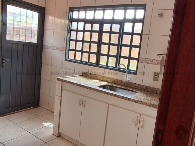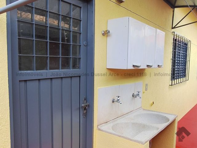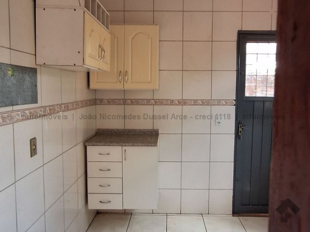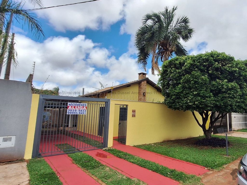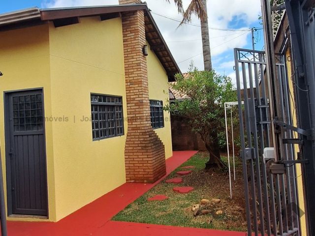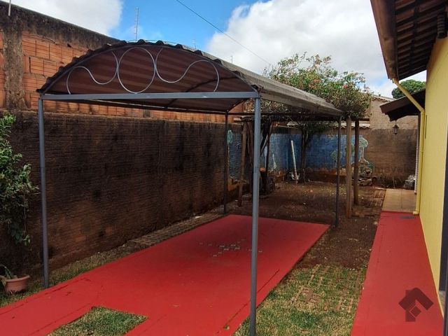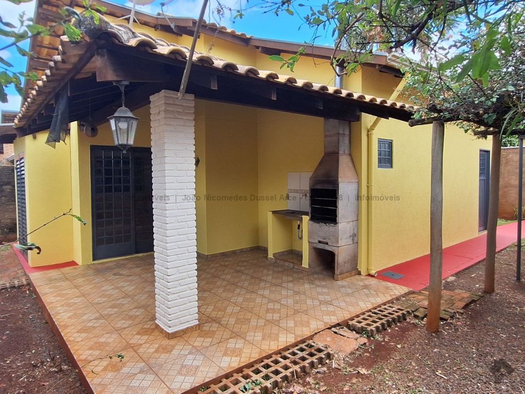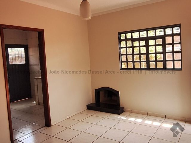 Casa com dois dormitórios, sala para dois ambientes com lareira, banheiro, varanda com churrasqueira, garagem coberta.
