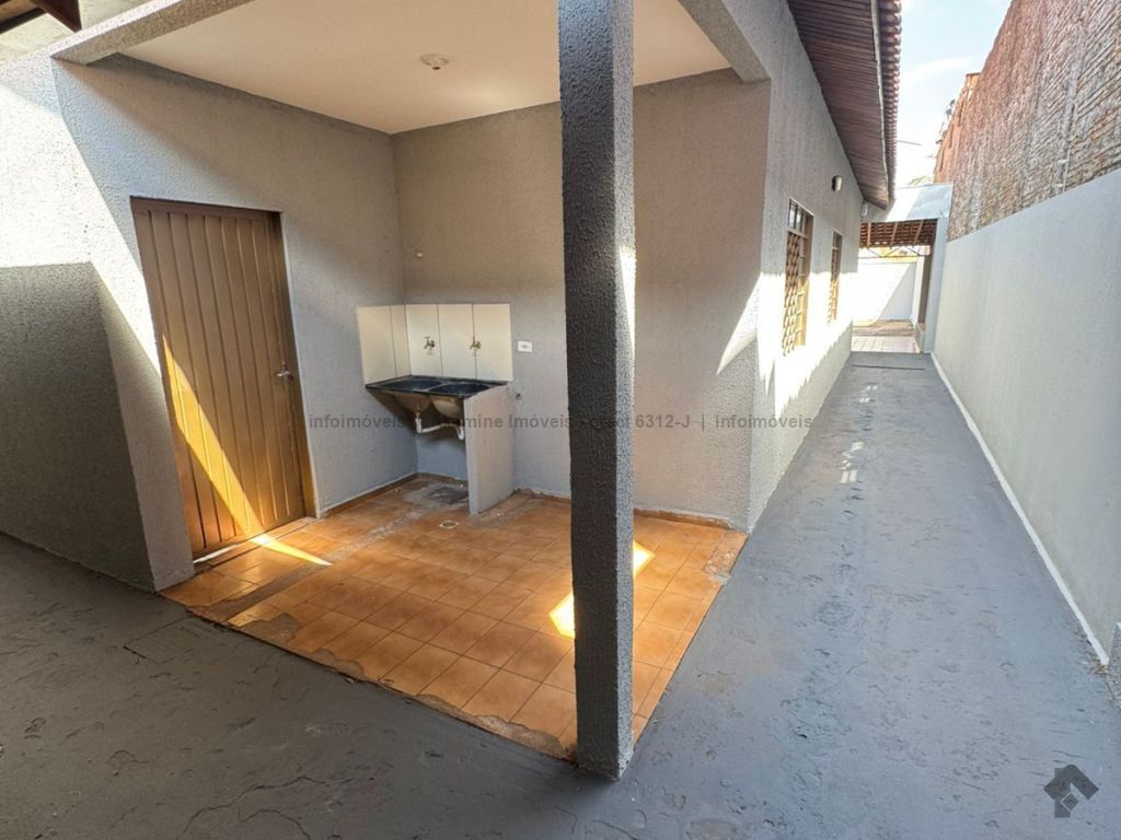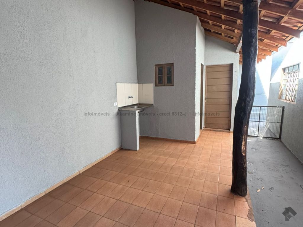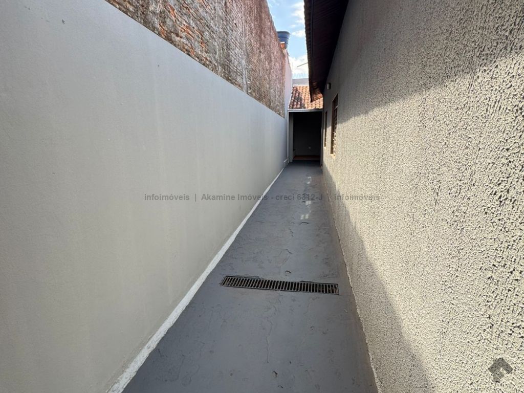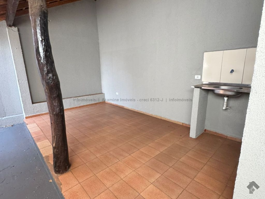 Imóvel contém uma suíte e dois quartos, sala de estar, cozinha, banheiro social, área de serviço coberta, garagem coberta para três carros, varanda nos fundos integrada à cozinha, edícula com quarto e banheiro.