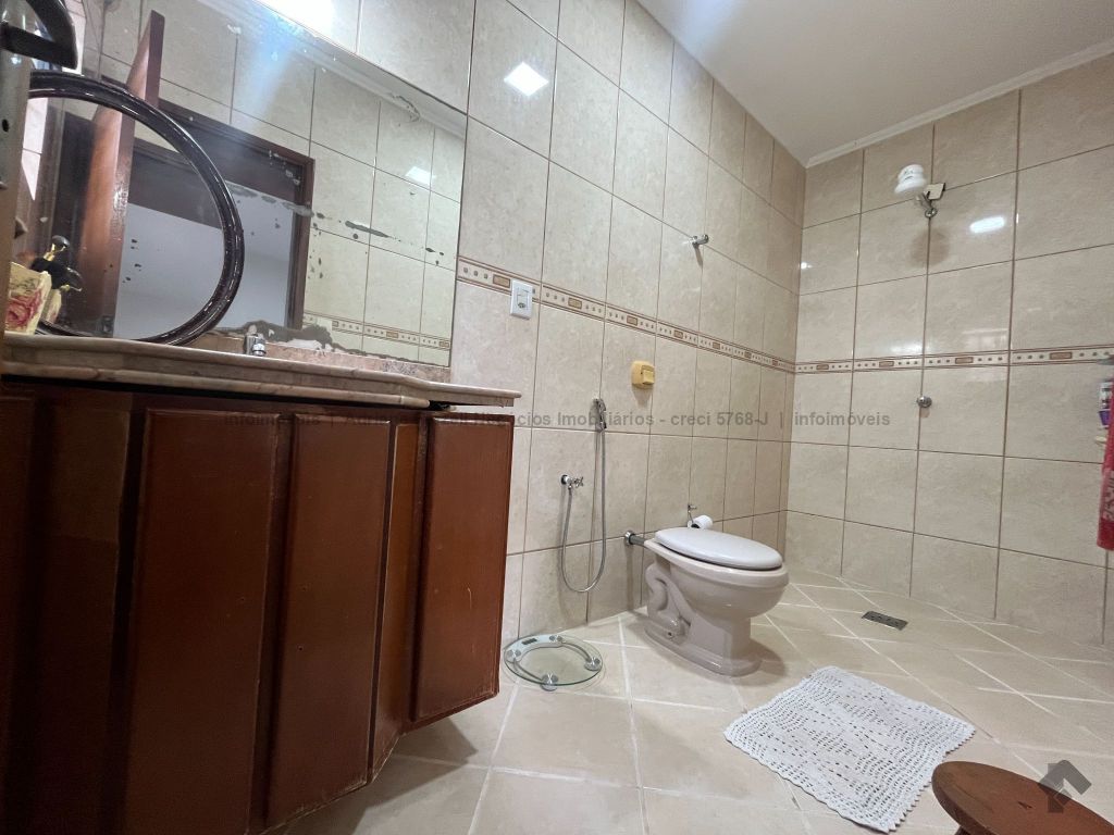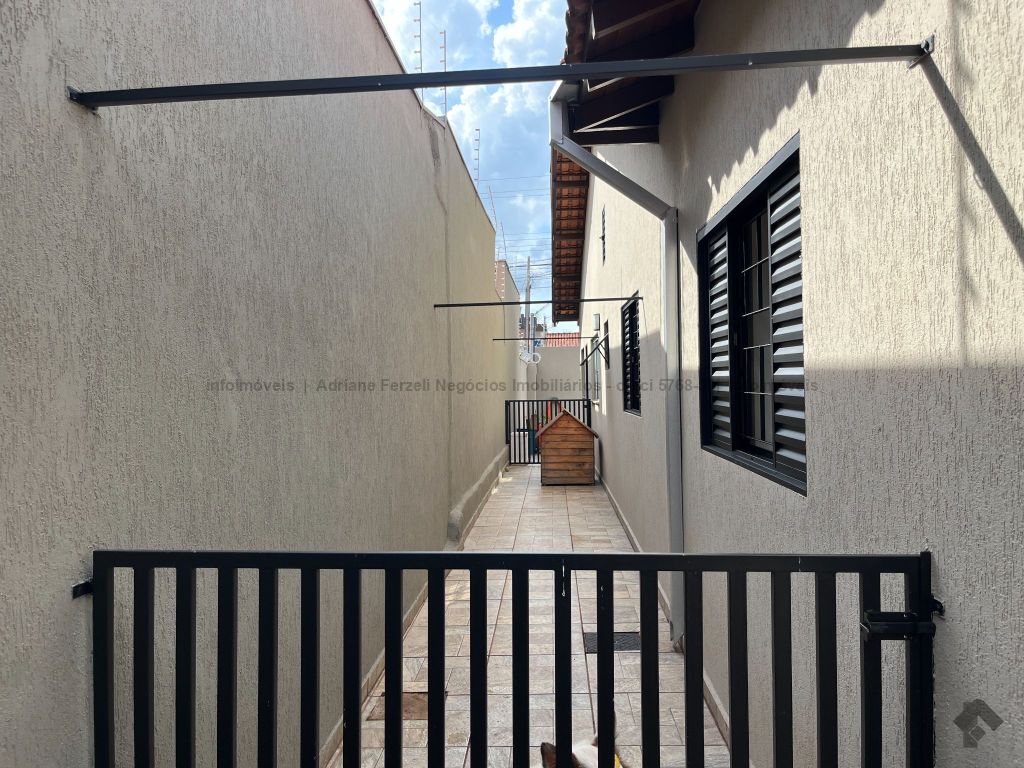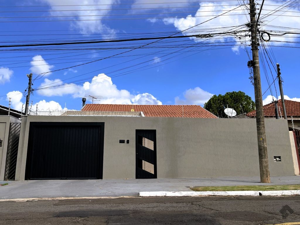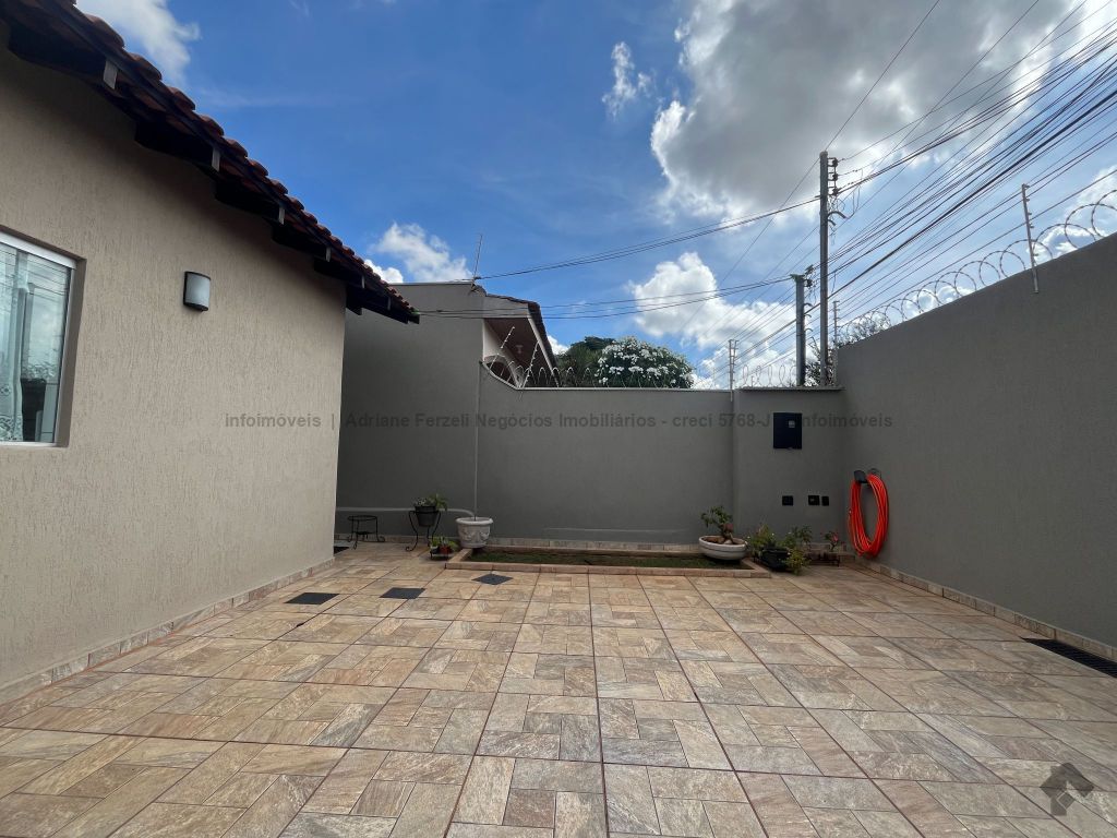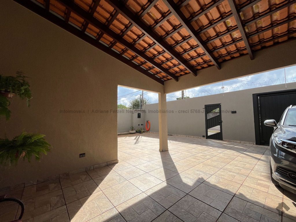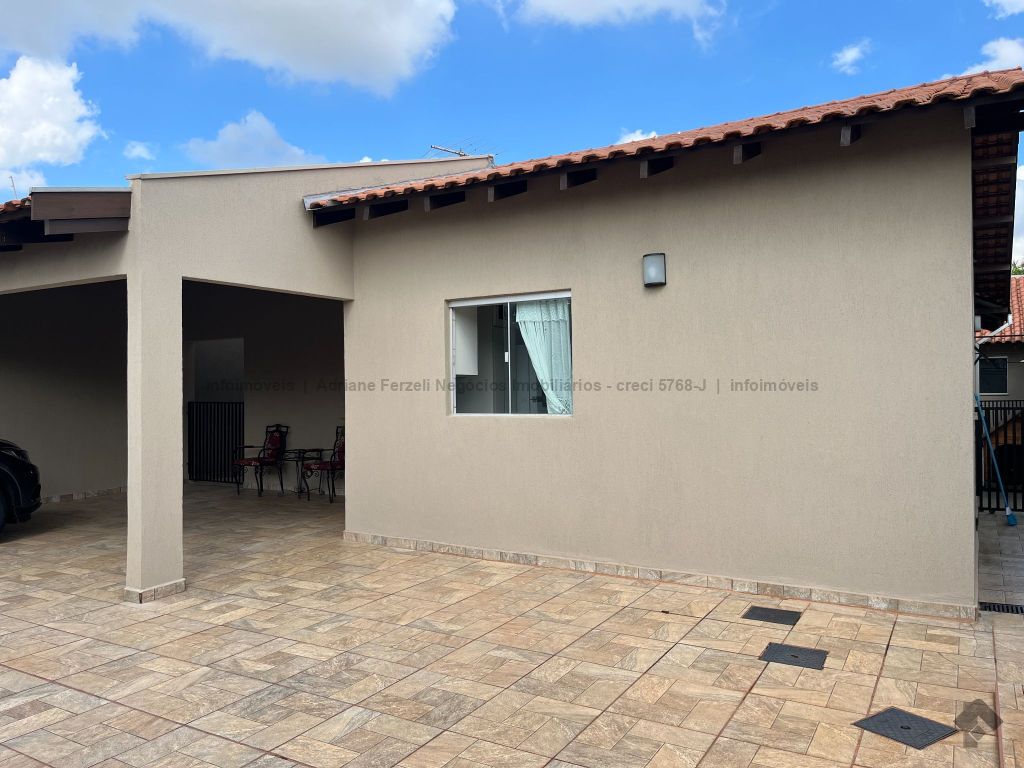 Casa térrea ampla com garagem coberta para dois veículos, sala de jantar, sala de estar, cozinha com armários, lavanderia, espaço para canil, jardim para pequenos cultivos, uma suíte com armários, três quartos com armários, banheiro social, varanda aos fundos ampla, área gourmet reformada com um quarto e um banheiro.
