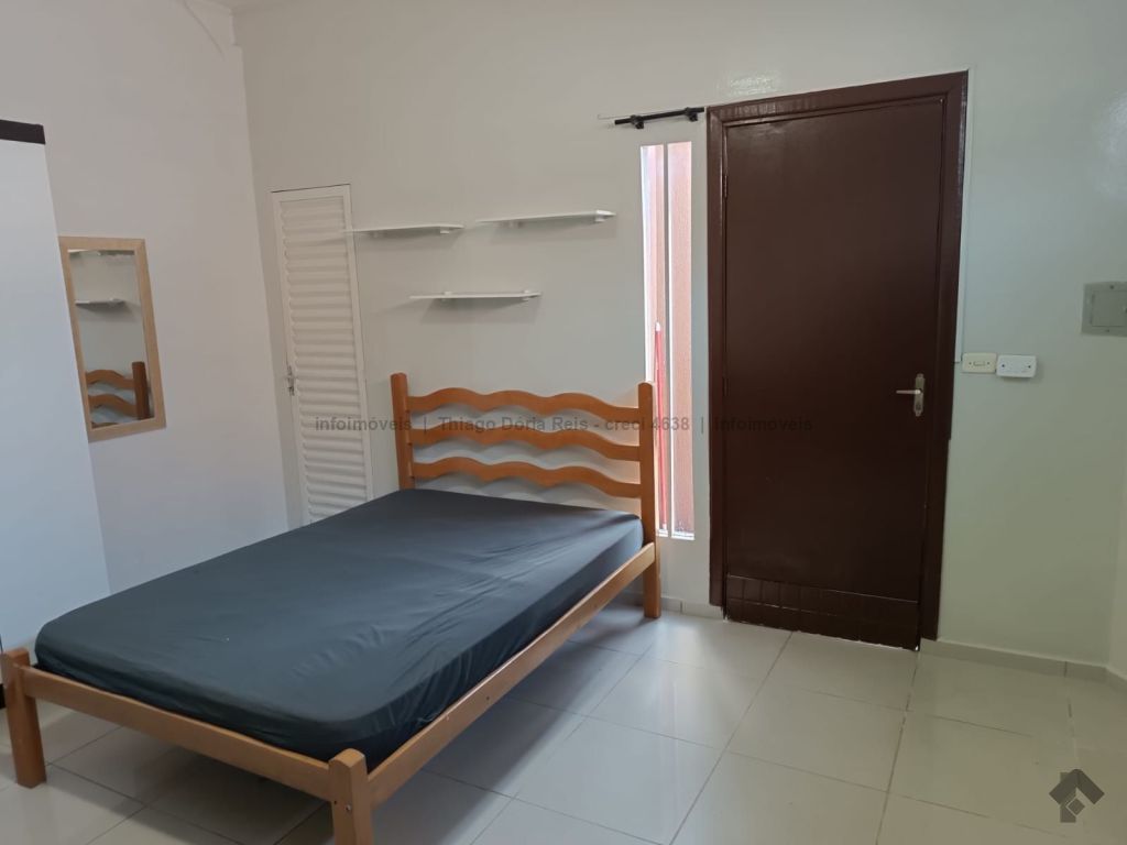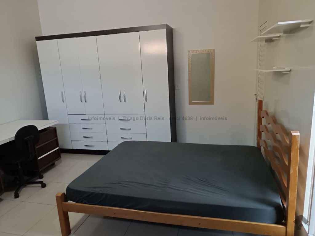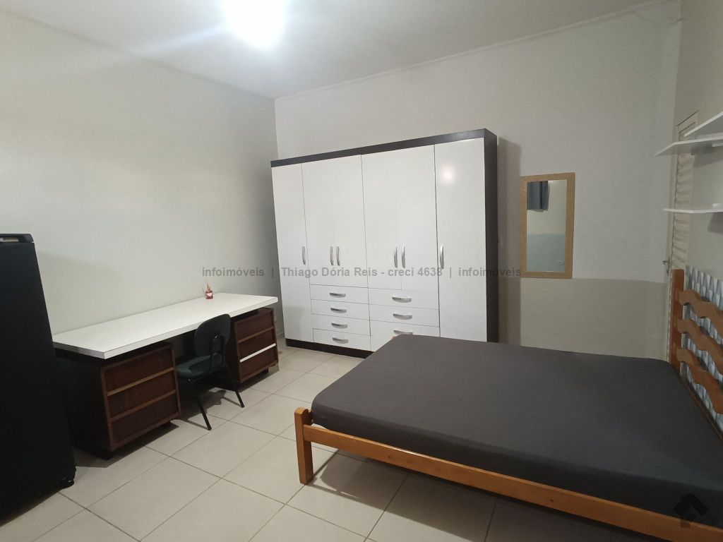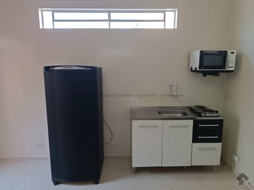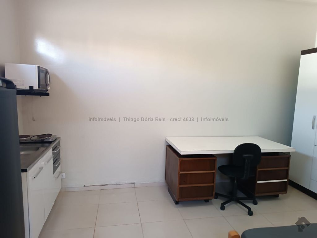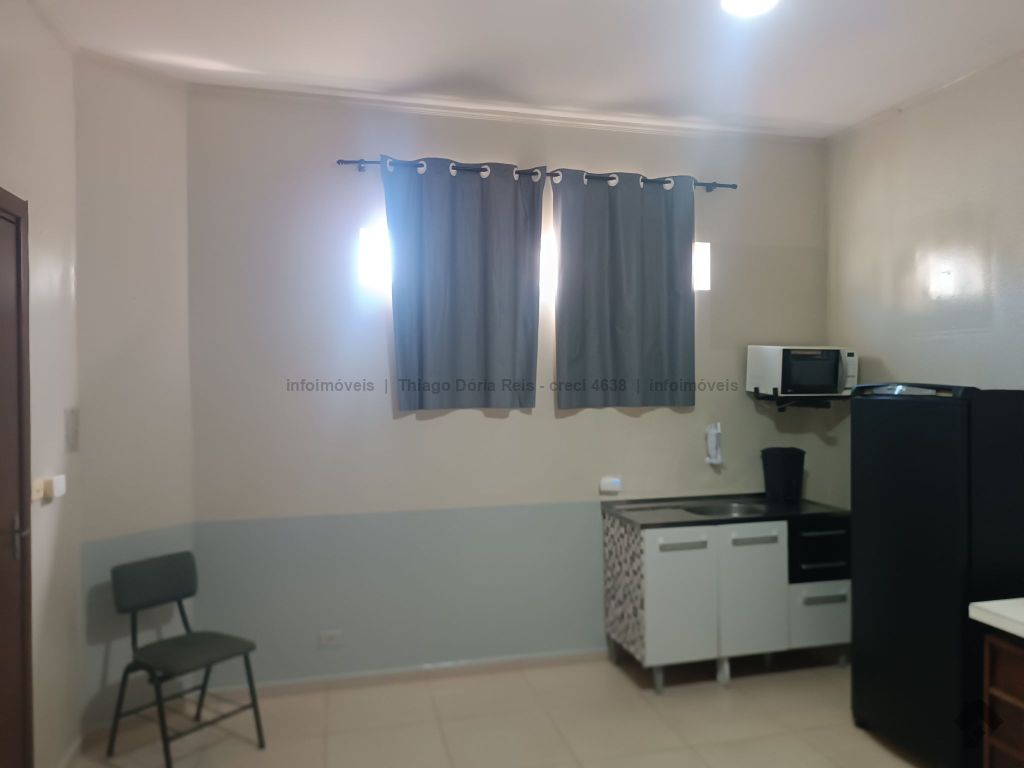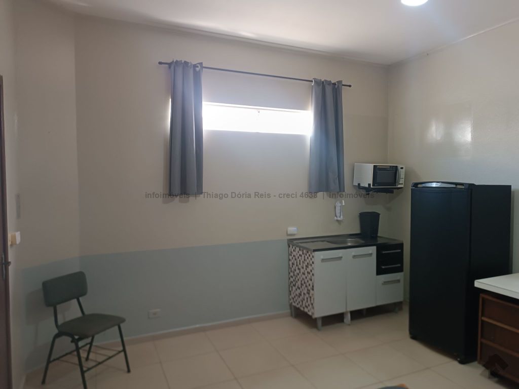 Kitnet mobiliada contendo cama e colchão de casal, guarda-roupas de casal, geladeira, micro-ondas, ventilador de teto, pia com armário, persiana blackout, prateleiras, mesa para estudo com cadeira, WC e uma vaga de garagem.