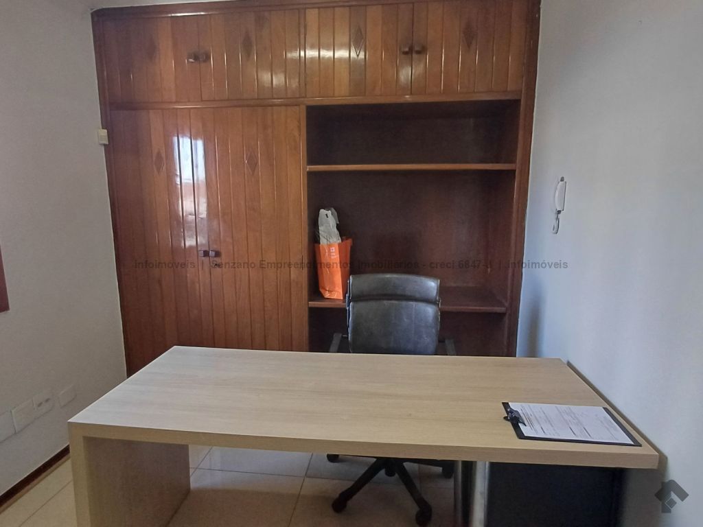 Ótima sala com 10 m², com armário, mesa e 1 cadeira, no piso superior. Imóvel com recepção e sala de espera, banheiro e copa compartilhada, área de lazer com churrasqueira, pia e banheiro.