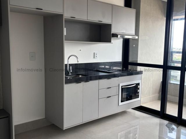 Studio em ótima localização, andar alto (17º) com uma linda vista. Quarto, banheiro, sala e cozinha integrados, sacada.