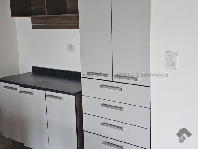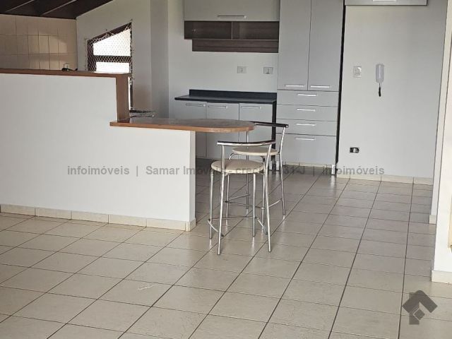 Quarto com banheiro, conjugado com cozinha e área de serviço.