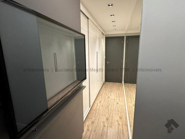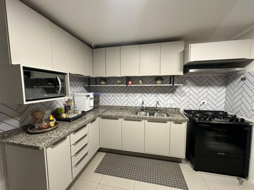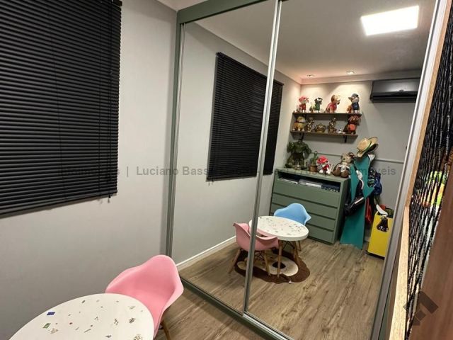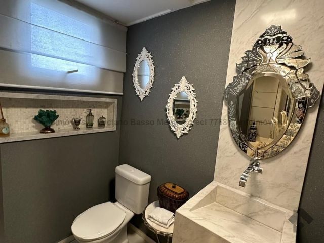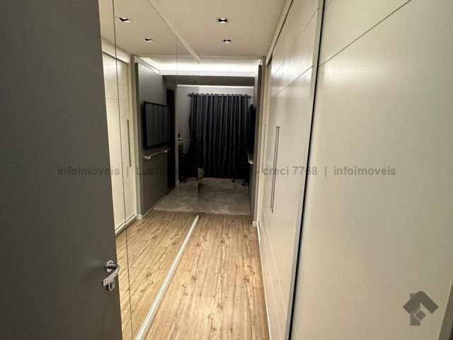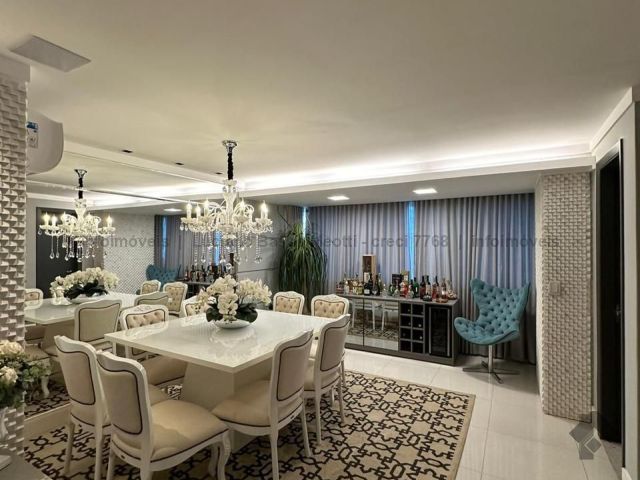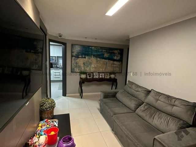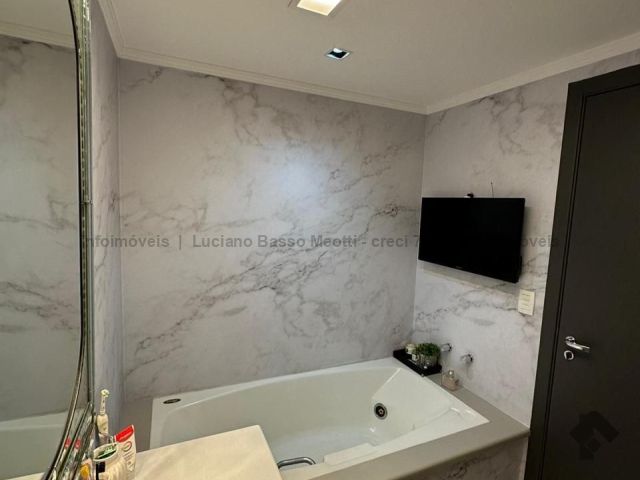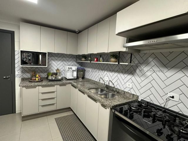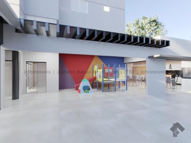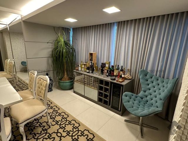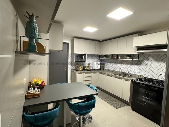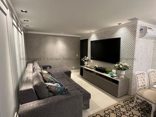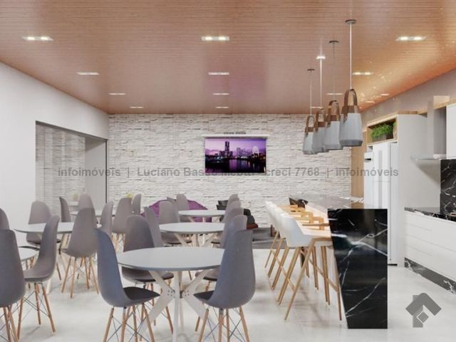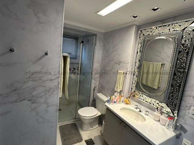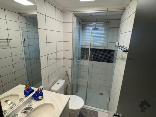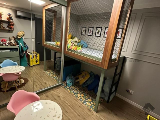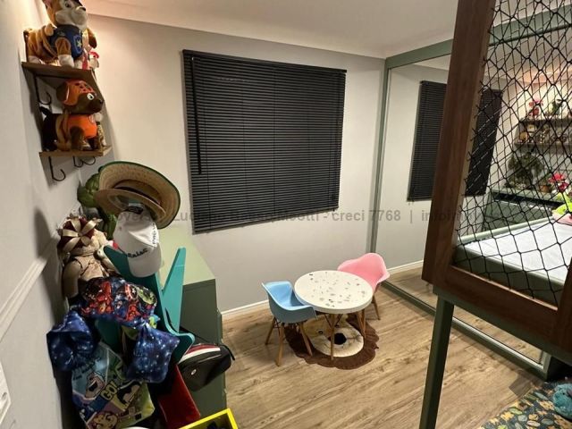 Apartamento com duas suítes e dois quartos, brinquedoteca ou home, sala de jantar, sala de TV, cozinha, despensa, banheiro e quarto de empregada. Tem piscina, sauna e área gourmet com churrasqueira.