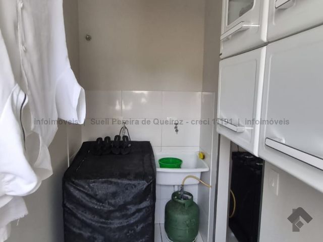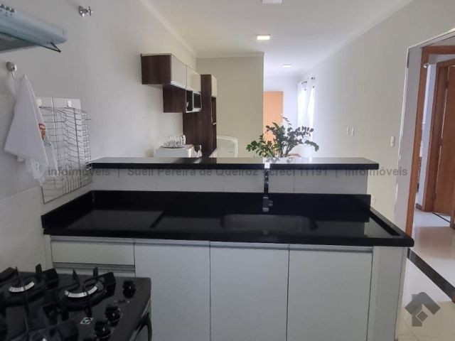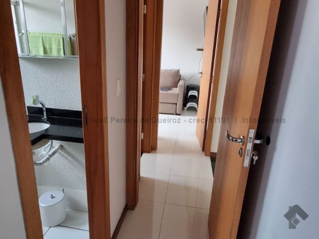 2 quartos sendo uma suíte, com pontos de ar condicionado nos 2, sala, cozinha americana, lavanderia, banheiro social, garagem com 2 vagas, área 57m².