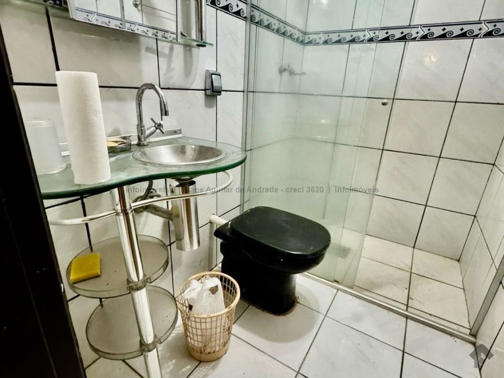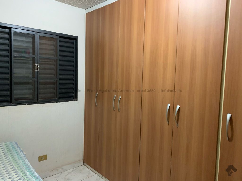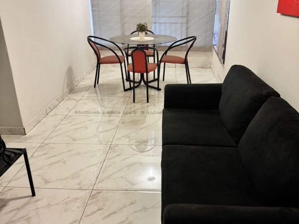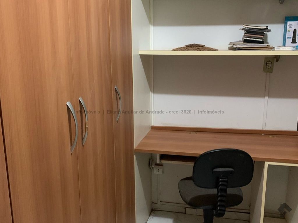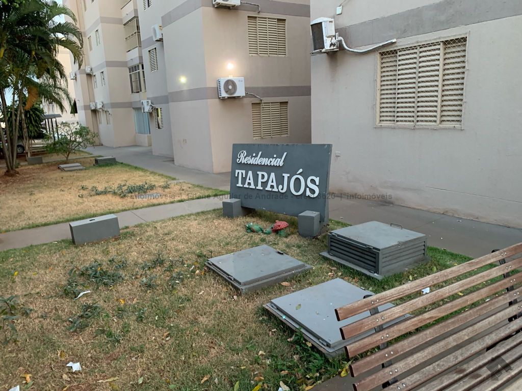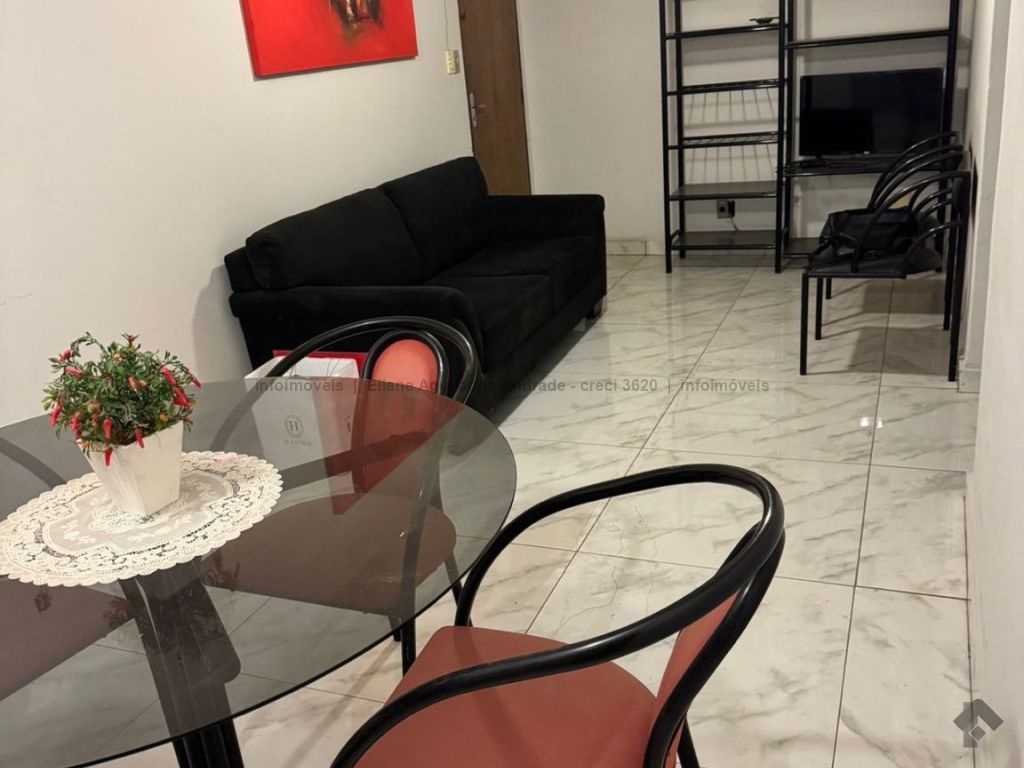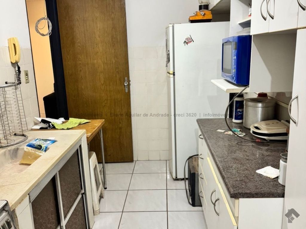 Sala estendida, dois quartos com armários, banheiro, cozinha e área de serviço, uma vaga de garagem.