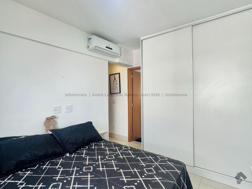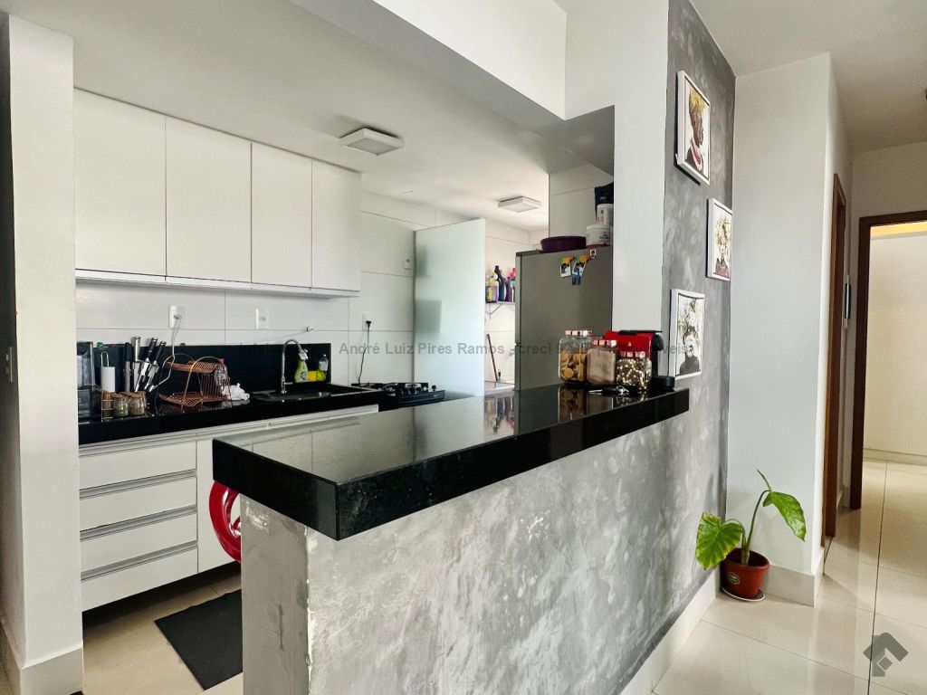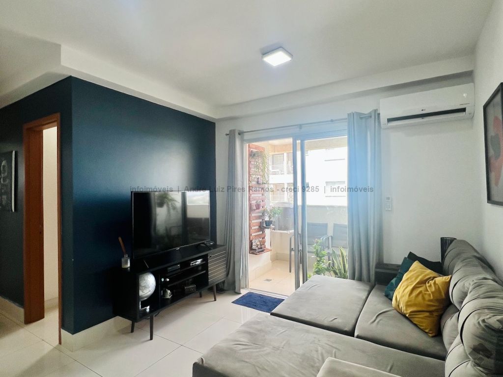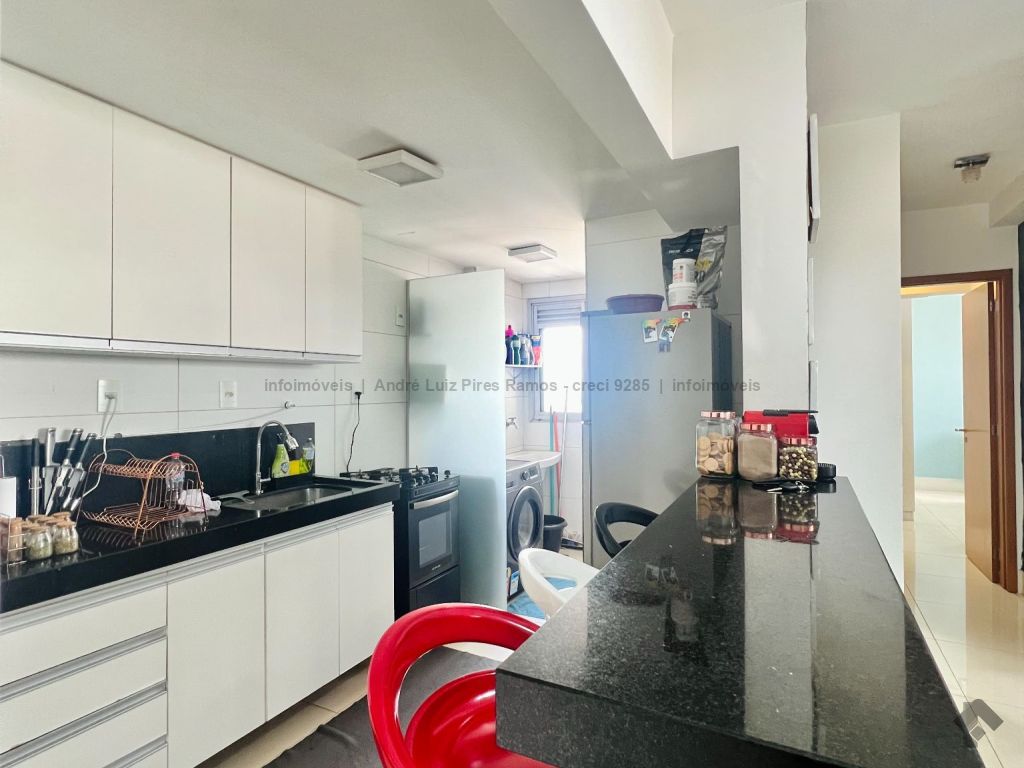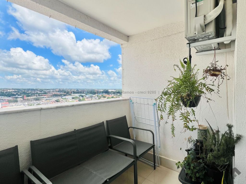 Apartamento mobiliado composto por sala de estar e jantar, cozinha americana com planejados e área de serviço, uma suíte, um quarto com planejados, um banheiro social, sacada e uma vaga de garagem coberta. Mobília inclui dois ares condicionados, um sofá retrátil, um fogão, uma lavadora Samsung, uma TV de 50 polegadas, uma cama de casal, uma cadeira de escritório, uma mesa para escritório, três banquetas e um jogo de cadeiras para varanda.
