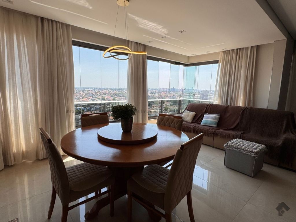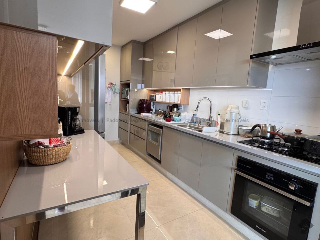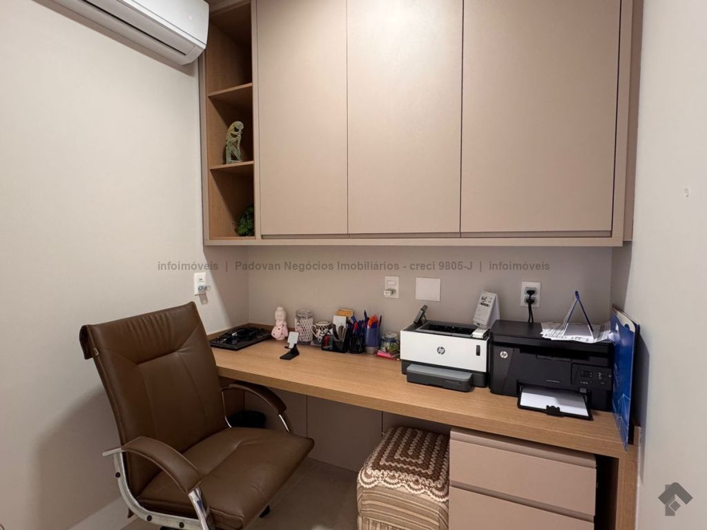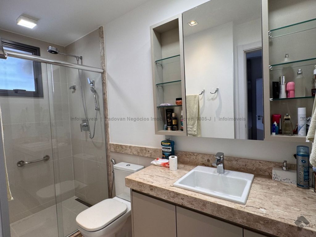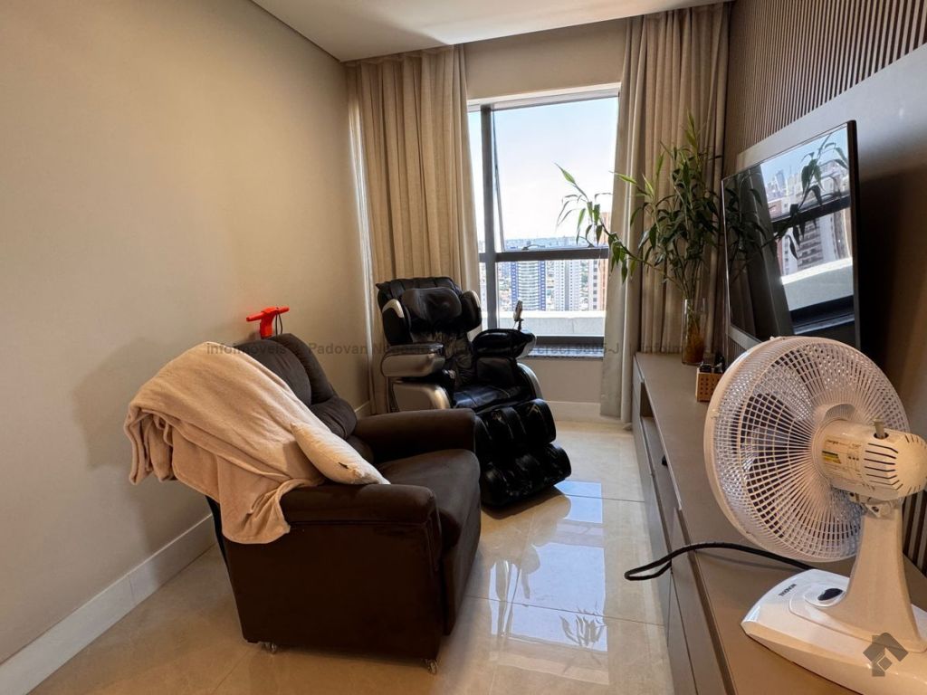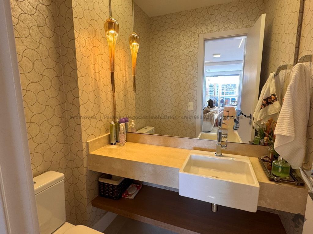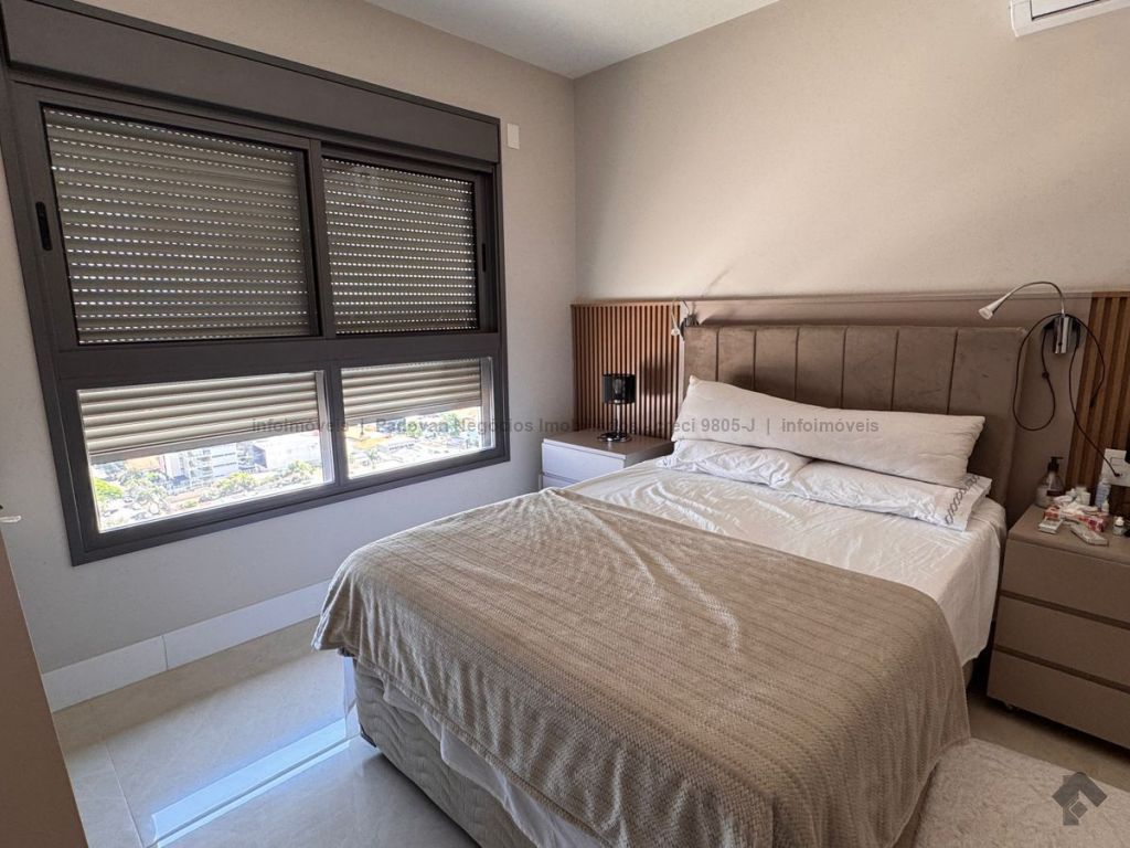 Apartamento com 3 suítes, sendo uma master com hidromassagem e closet, todas com janelas motorizadas e aparelho de ar. Living com sala de estar, de TV, de jantar integrada à cozinha e escritório. 1 WC social, área de serviço com elevador de serviço. 3 vagas de garagem com depósito e ponto de carga para carro elétrico. Bancadas da cozinha e banheiro em pedra Silestone. Condomínio completo, salão de festas, de jogos, piscinas, quadra de esportes, entre outros, edificado pela maior construtora do Estado. Andar alto.