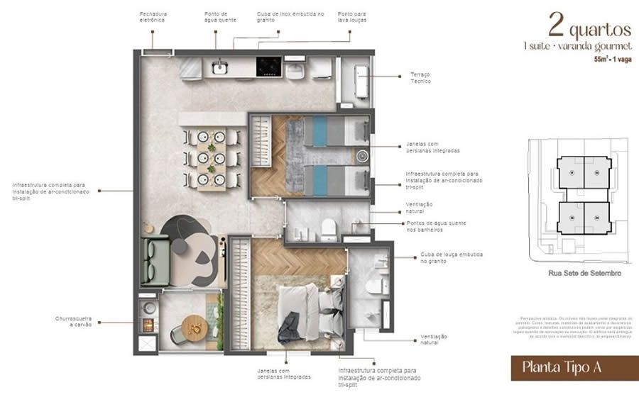 Apartamento com dois quartos, sendo um suíte, sala de estar, cozinha, área de serviço, banheiro social, sacada gourmet com churrasqueira a carvão, uma vaga de garagem, piso porcelanato nas áreas molhadas e piso laminado no restante do apartamento, preparação para instalação de aquecedor de água a gás. Todas as janelas possuem ventilação natural.