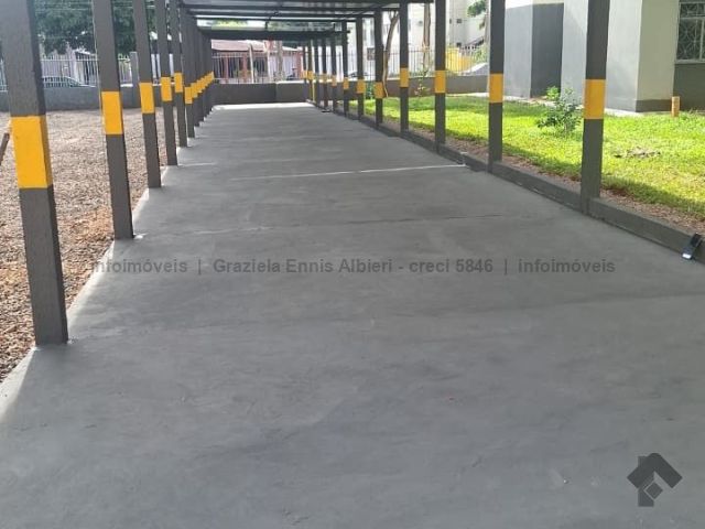 Apartamento aconchegante com sala, cozinha, área de serviço, um quarto com armário, um segundo quarto, um banheiro e uma vaga de garagem coberta.