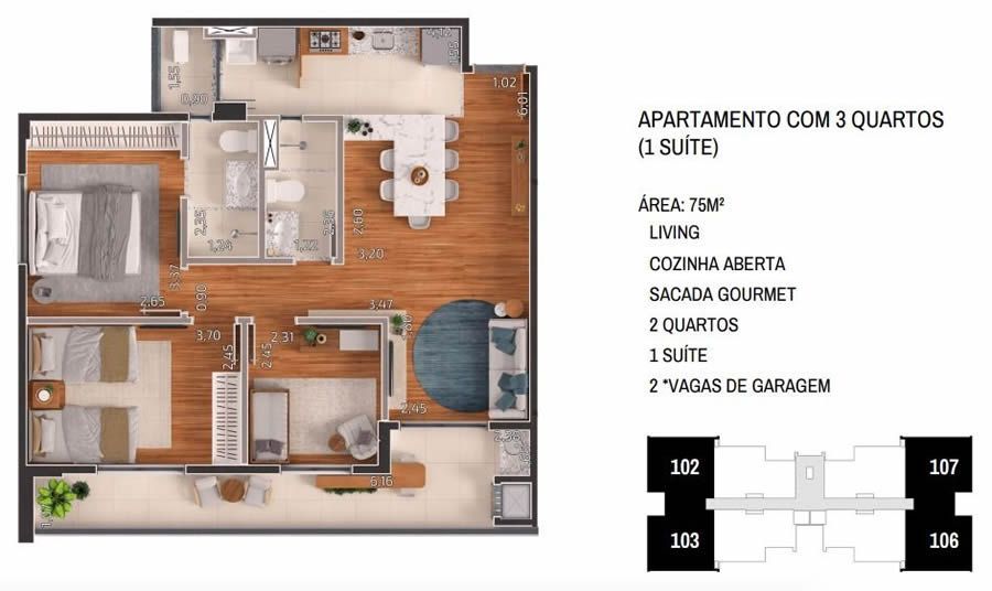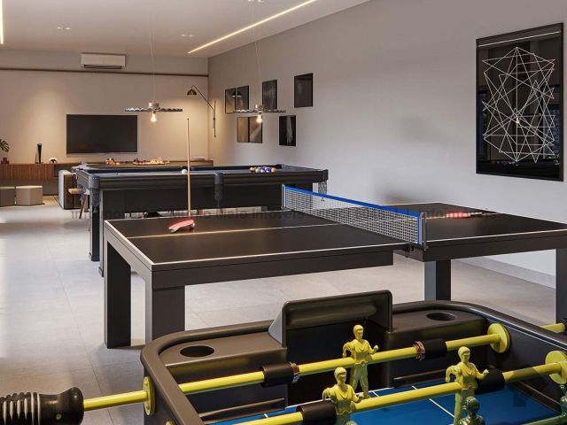 Uma suíte, dois quartos, sacada gourmet com churrasqueira a carvão, andar alto e vista para o Parque dos Poderes, 2 vagas de garagem, sol nascente, condomínio com área de lazer completa.
