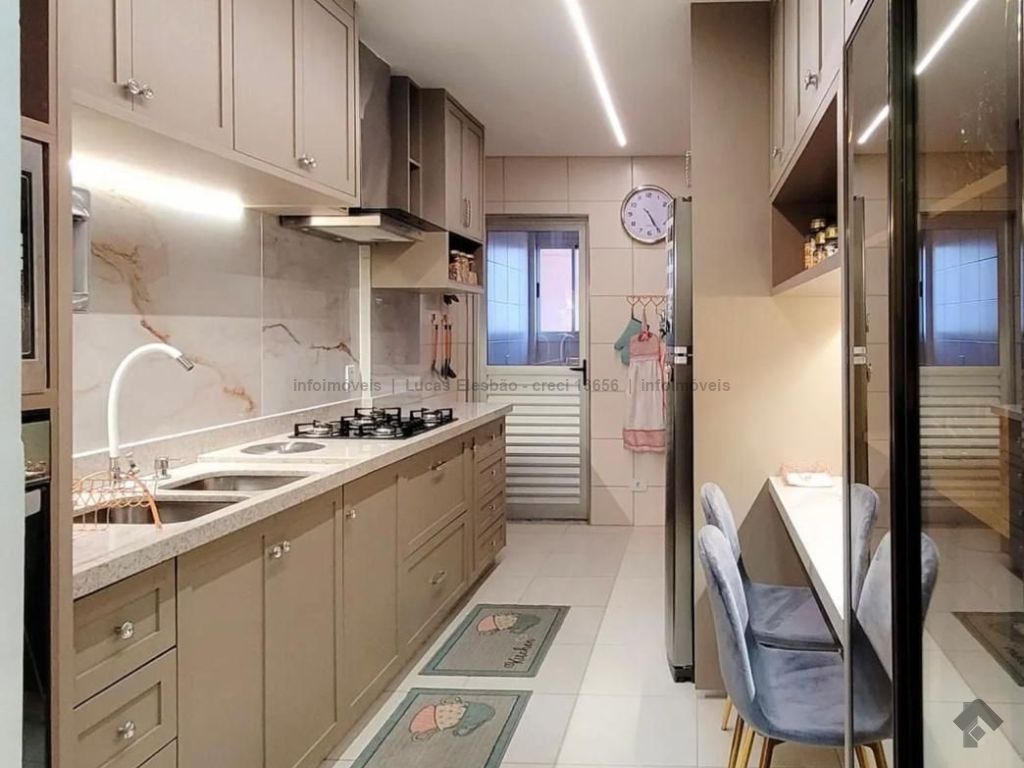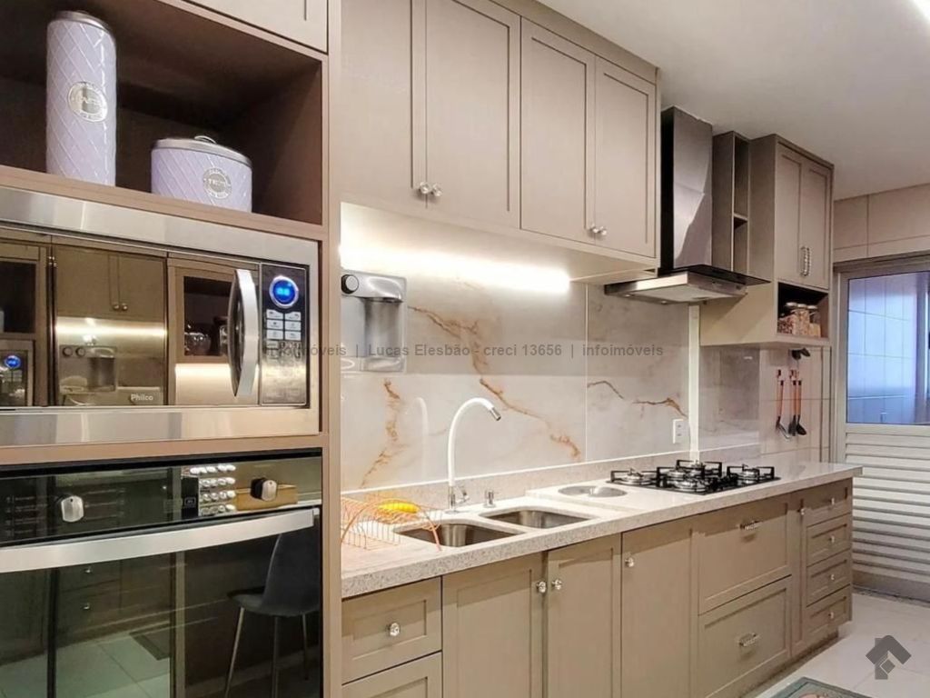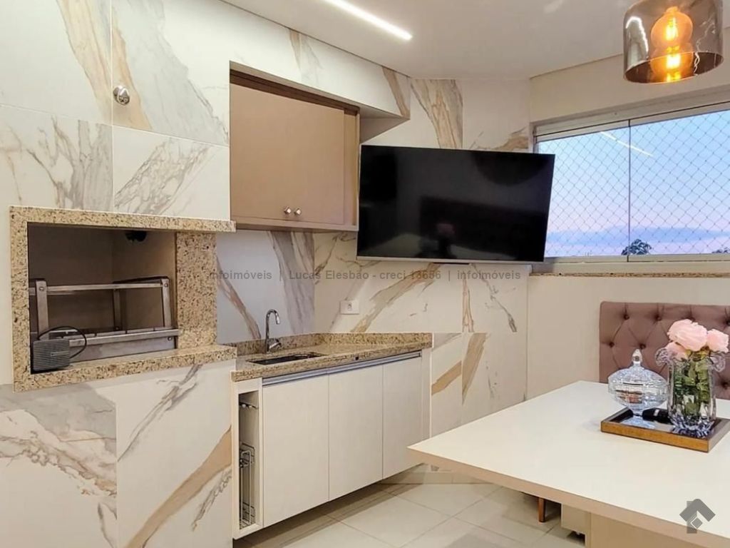Apartamento no condomínio Morada do Parque, no 4º andar, no Jardim Veraneio. Área privativa contendo sala de estar, sala de jantar, lavabo, cozinha com armários planejados, 03 suítes com armários planejados, espaço gourmet com armários planejados, equipado com churrasqueira e área coberta integrada, área de serviço com banheiro social, 03 vagas de garagem cobertas.