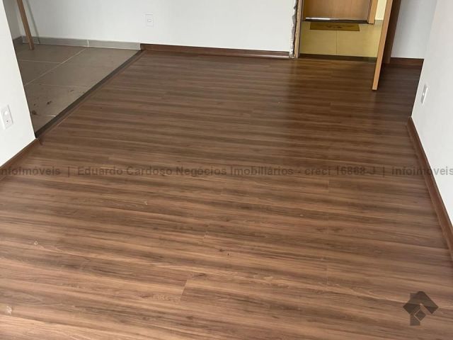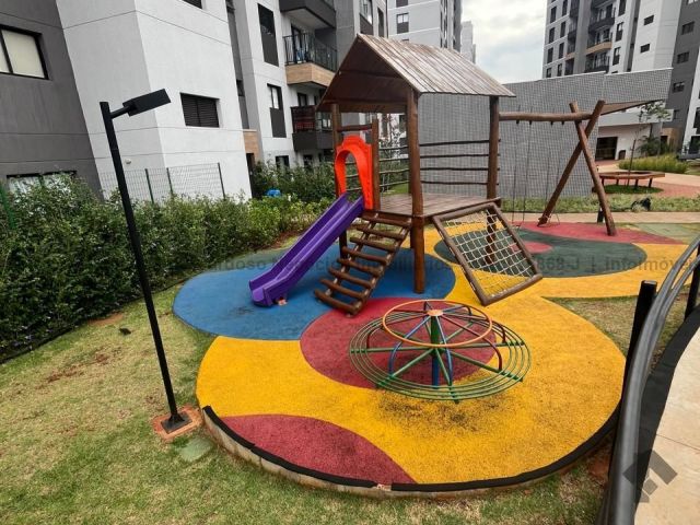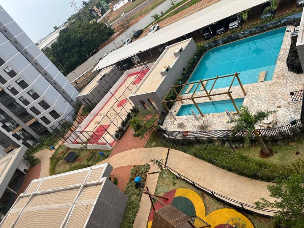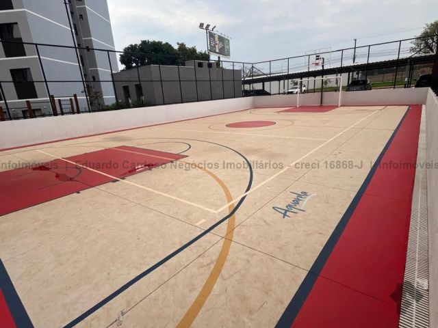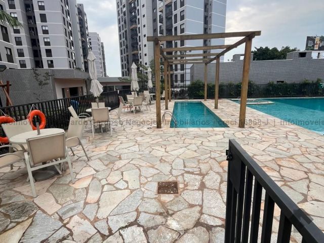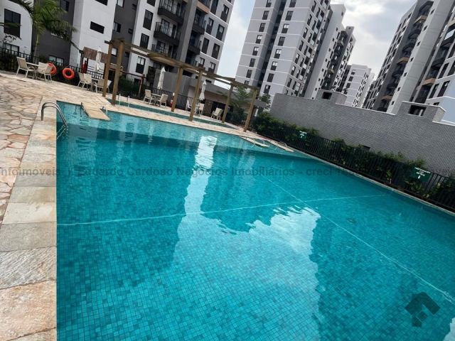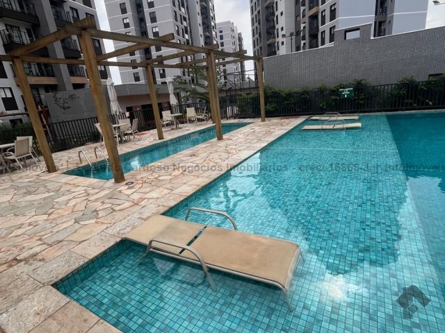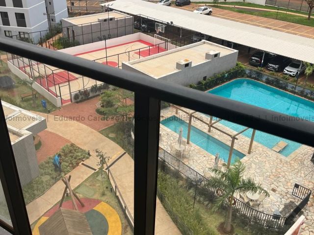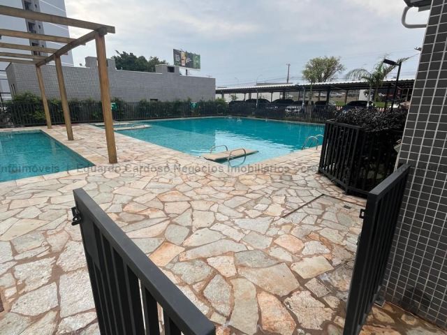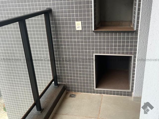 Apartamento de frente para área de lazer, dois quartos, banheiro, churrasqueira na varanda.