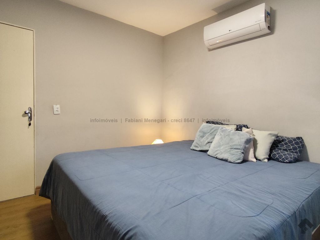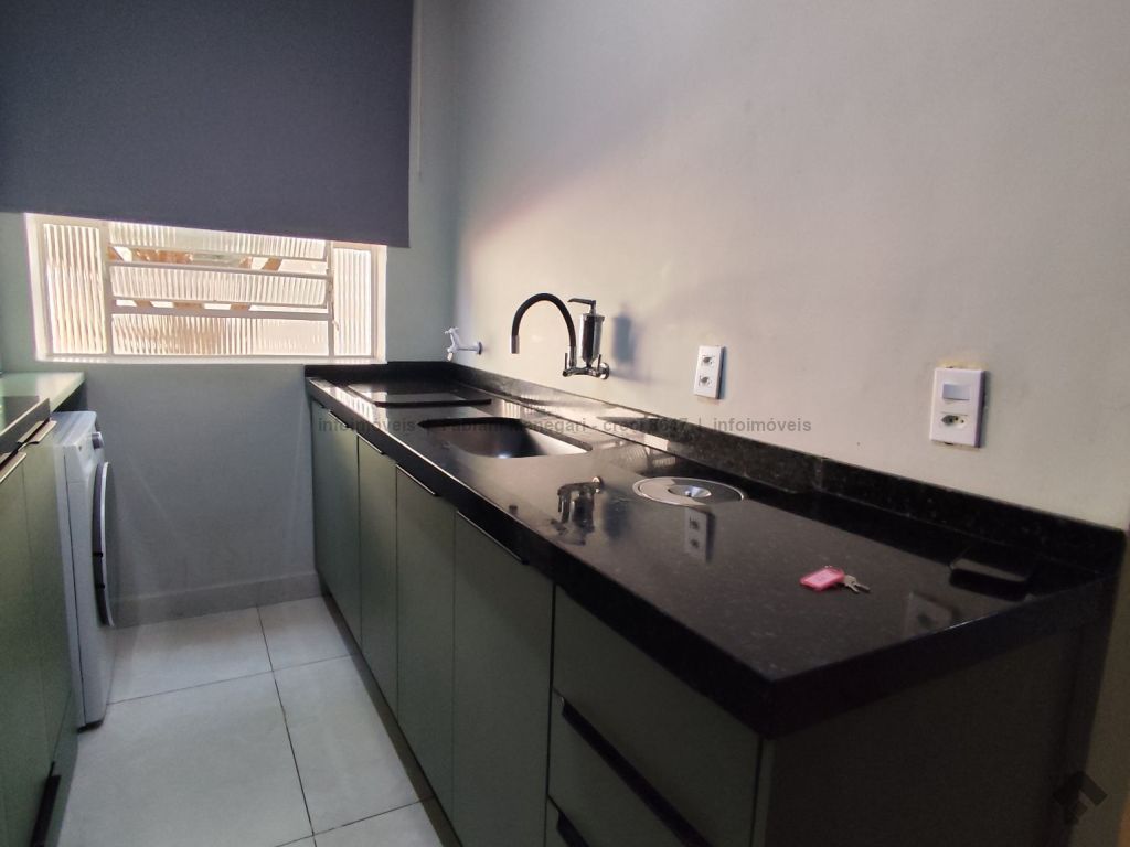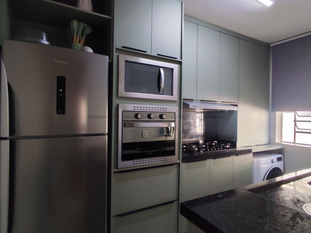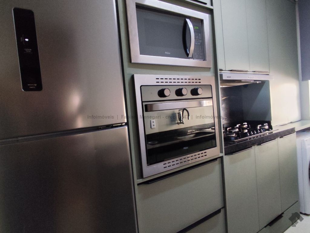 Sala ampla e confortável, com sofá e persiana sob medida. Cozinha planejada, em um sofisticado tom de verde fosco, com armários novos e de excelente qualidade. Equipamentos inclusos: geladeira, fogão, micro-ondas, coifa, máquina de lavar roupas. Quarto principal com cama king, ar-condicionado, televisão e papel de parede decorativo. Segundo quarto com guarda-roupa de casal. WC moderno com pia em mármore, box e chuveiro.