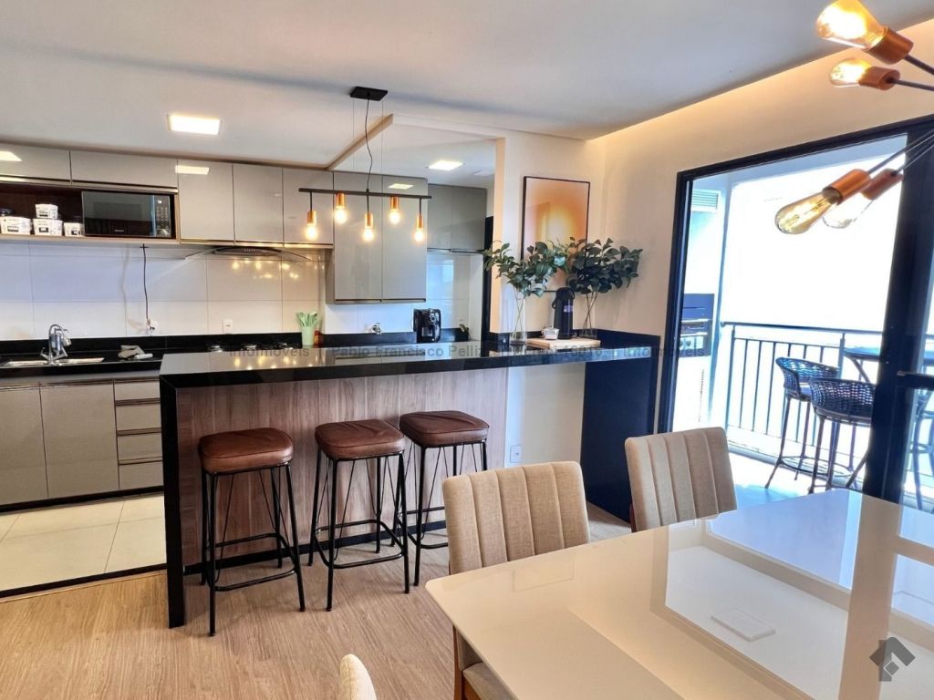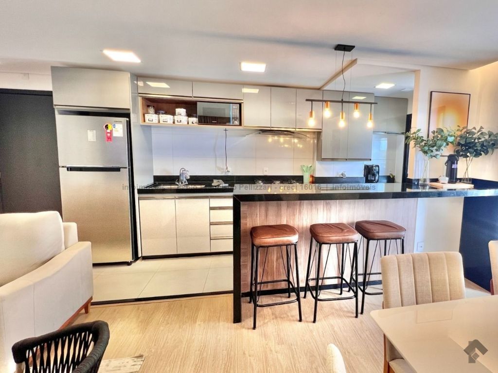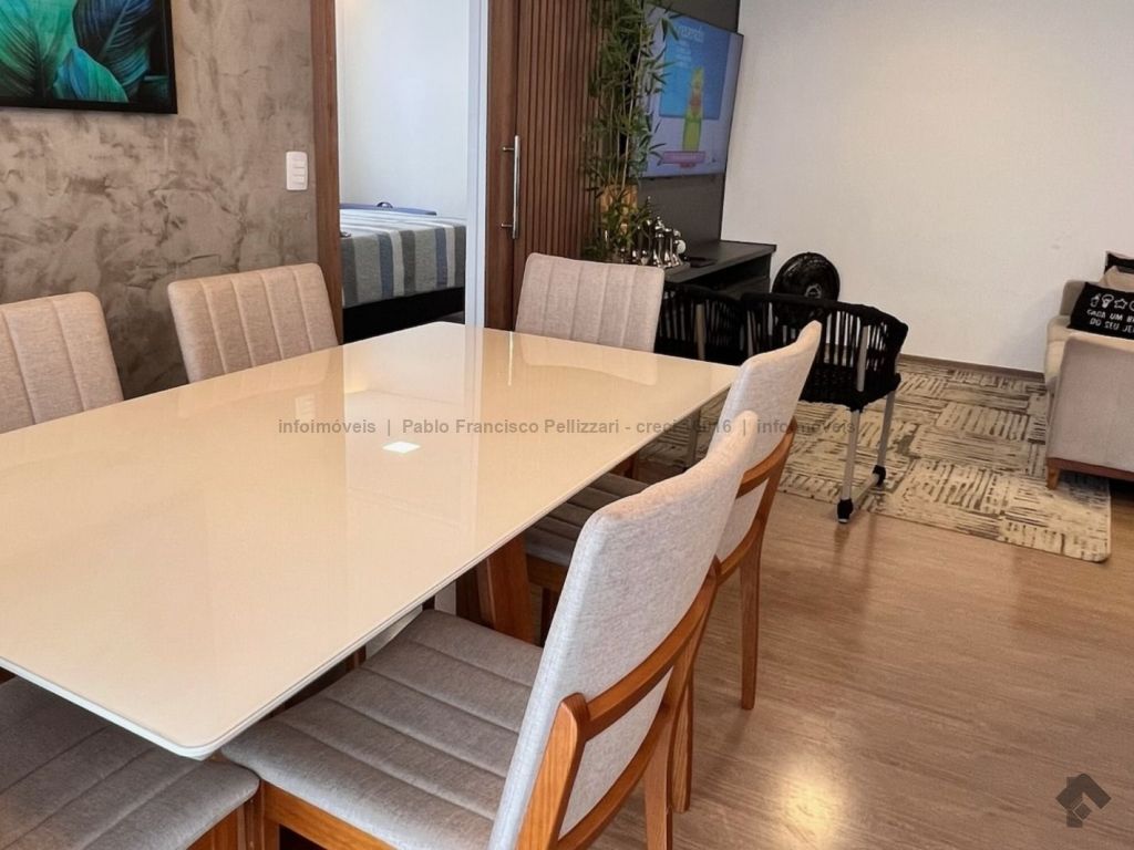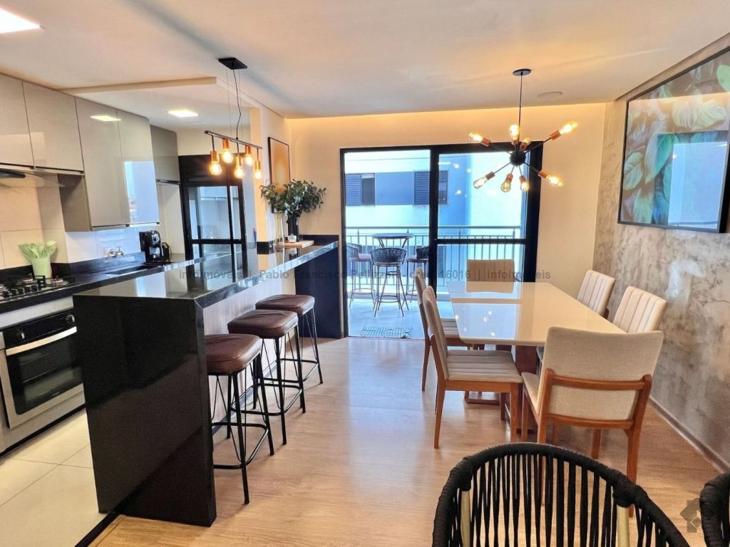 Apartamento equipado com móveis planejados na cozinha, móveis planejados nos quartos, móveis planejados nos banheiros com espelho, móveis planejados na área da sacada, churrasqueira na área da sacada, ilha com granito preto São Gabriel, bancadas da cozinha com granito preto São Gabriel, painel de TV com rack, aquecedores a gás nos chuveiros, box nos dois banheiros, gesso com sanca nos quartos, gesso na sala e cozinha com sanca, iluminação nas sancas e fechadura eletrônica. Torre 1, terceiro andar.