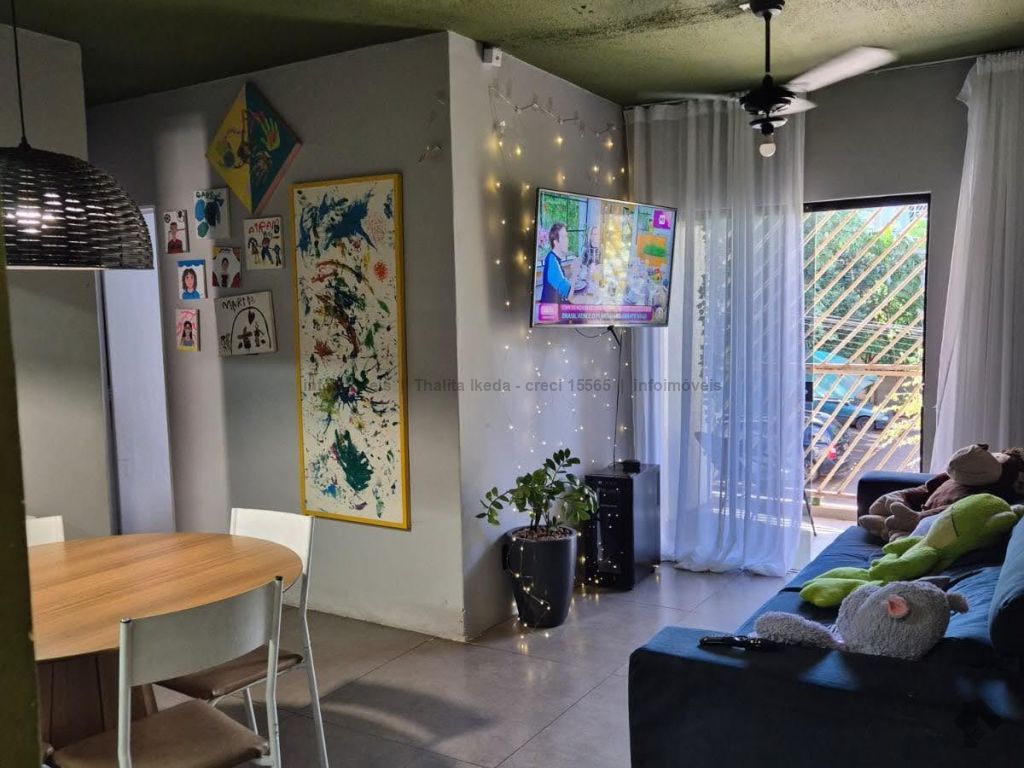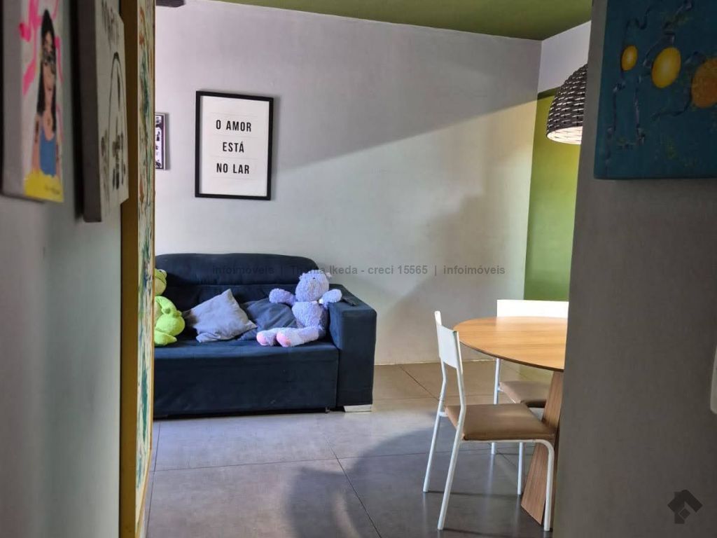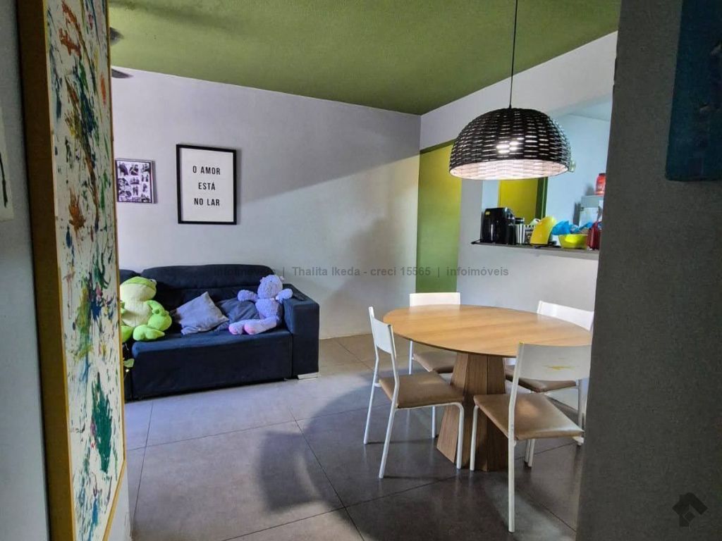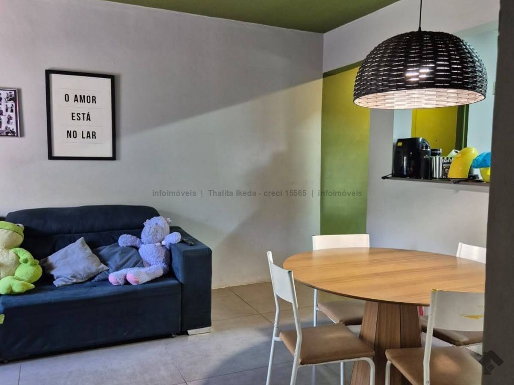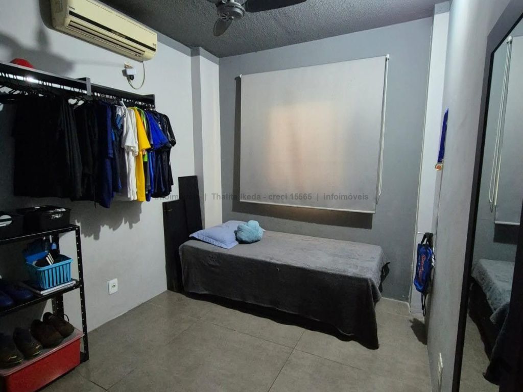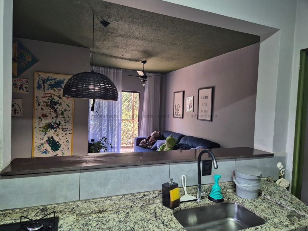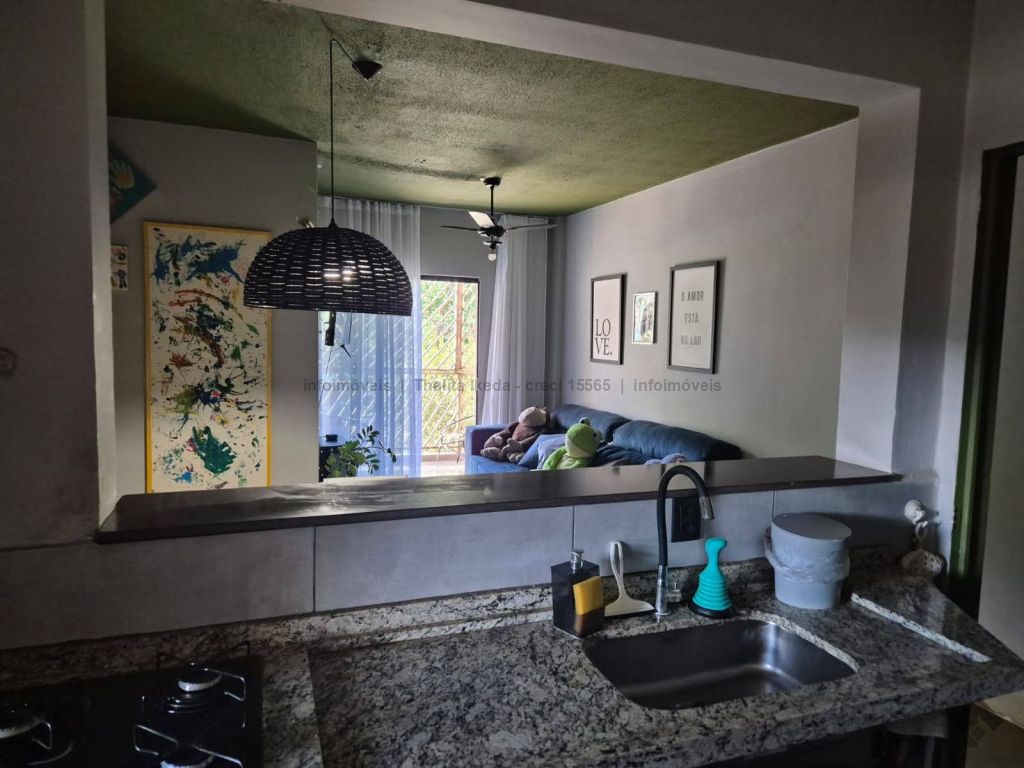 São três quartos, sala, banheiro social, cozinha americana, área de serviço e sacada, armário embutido no corredor, porão de depósito (2 m x 2 m), ficam os ventiladores de teto, ar-condicionado e armário do quarto. Apartamento no primeiro andar. O condomínio conta com quiosques de churrasqueira equipados com caixa térmica, espetos, mesas e bancos, sala de jogos com pebolim, ping-pong, sinuca, salão de festas equipado, parquinho, quadra, árvores frutíferas plantadas pelo condomínio, bastante área verde e vizinhança tranquila. Apartamento todo reformado e moderno. Sol nascente.