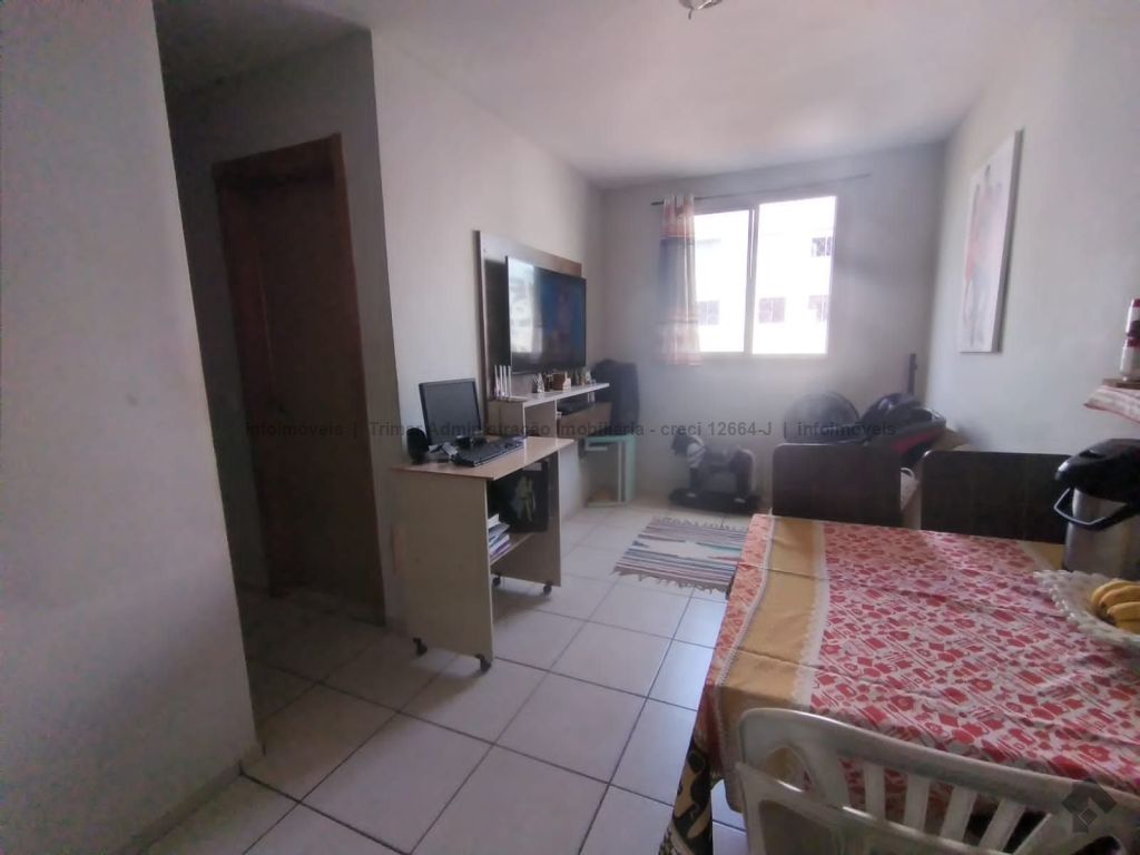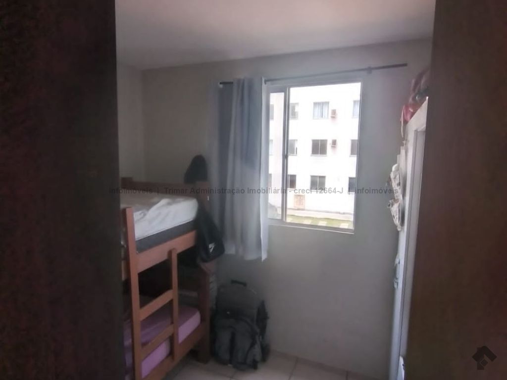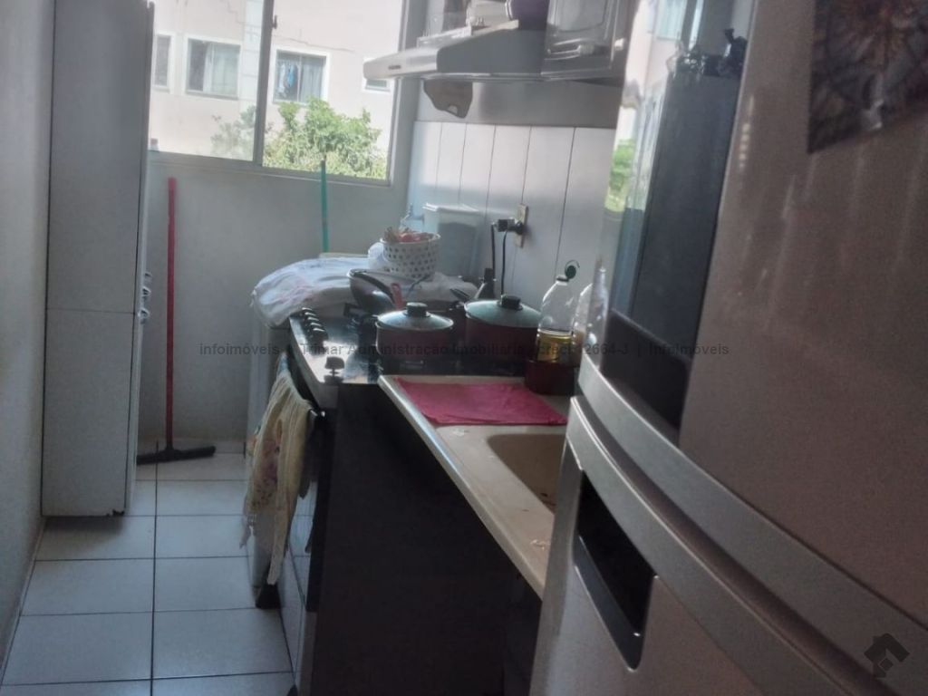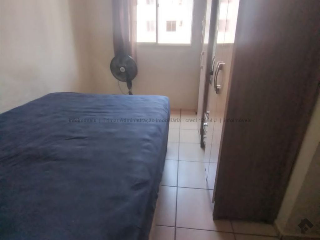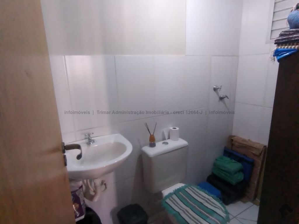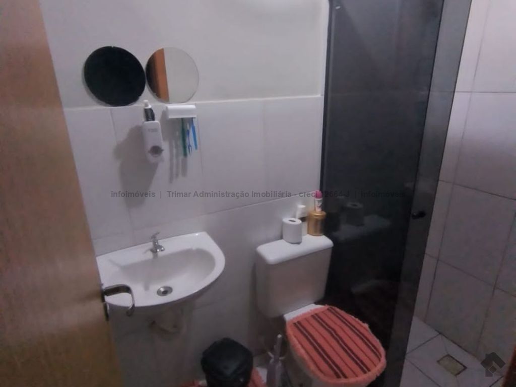 Tem dois quartos sendo uma suíte, sala, cozinha americana, banheiro social, área de serviço e garagem descoberta. Fica no primeiro andar.