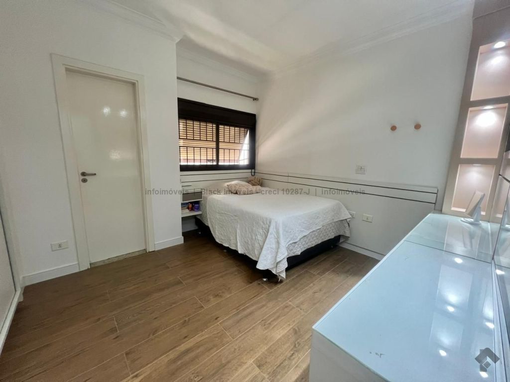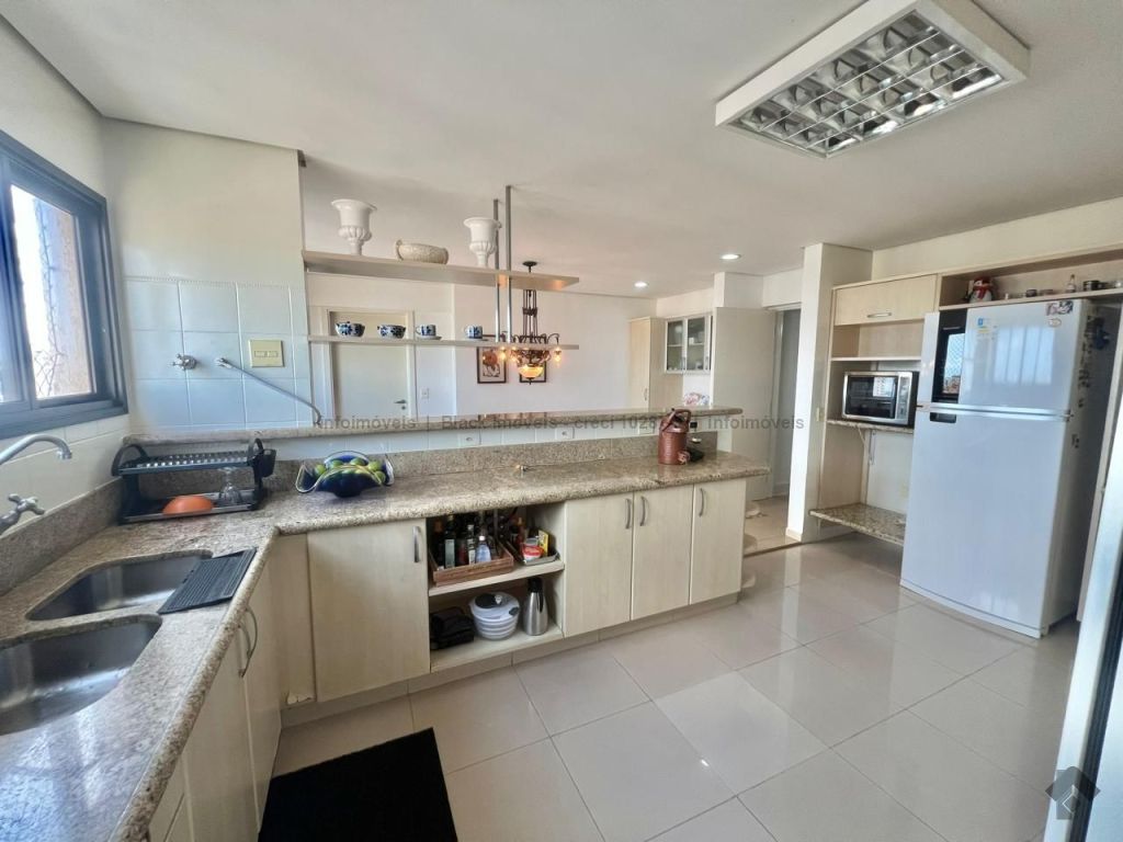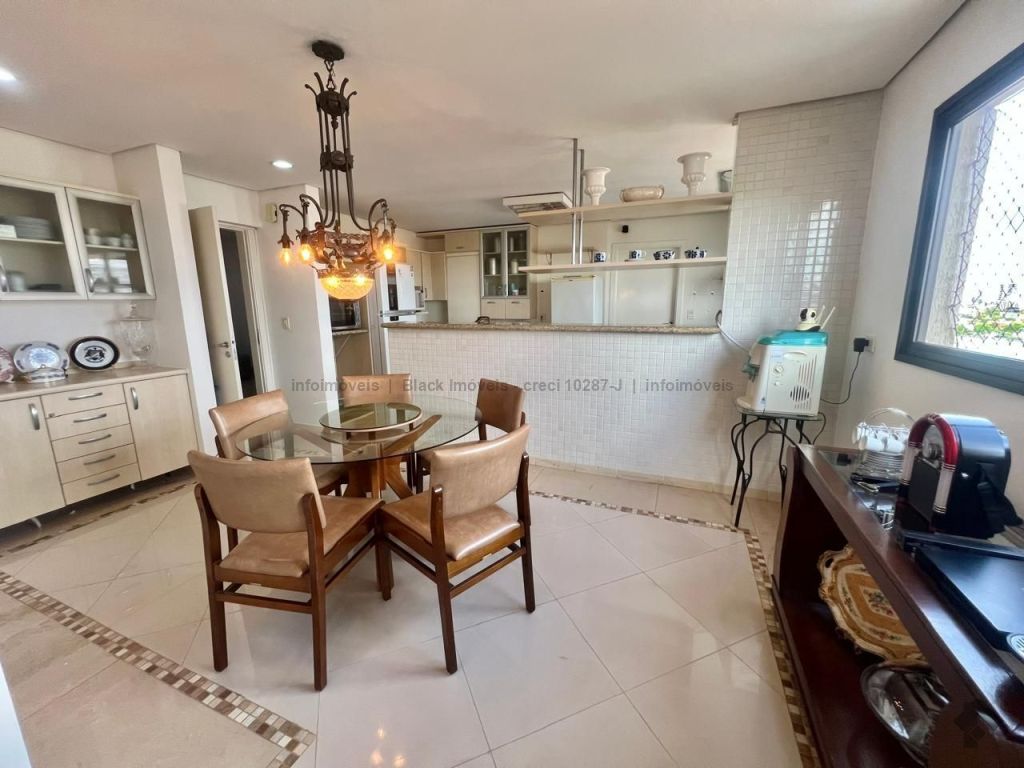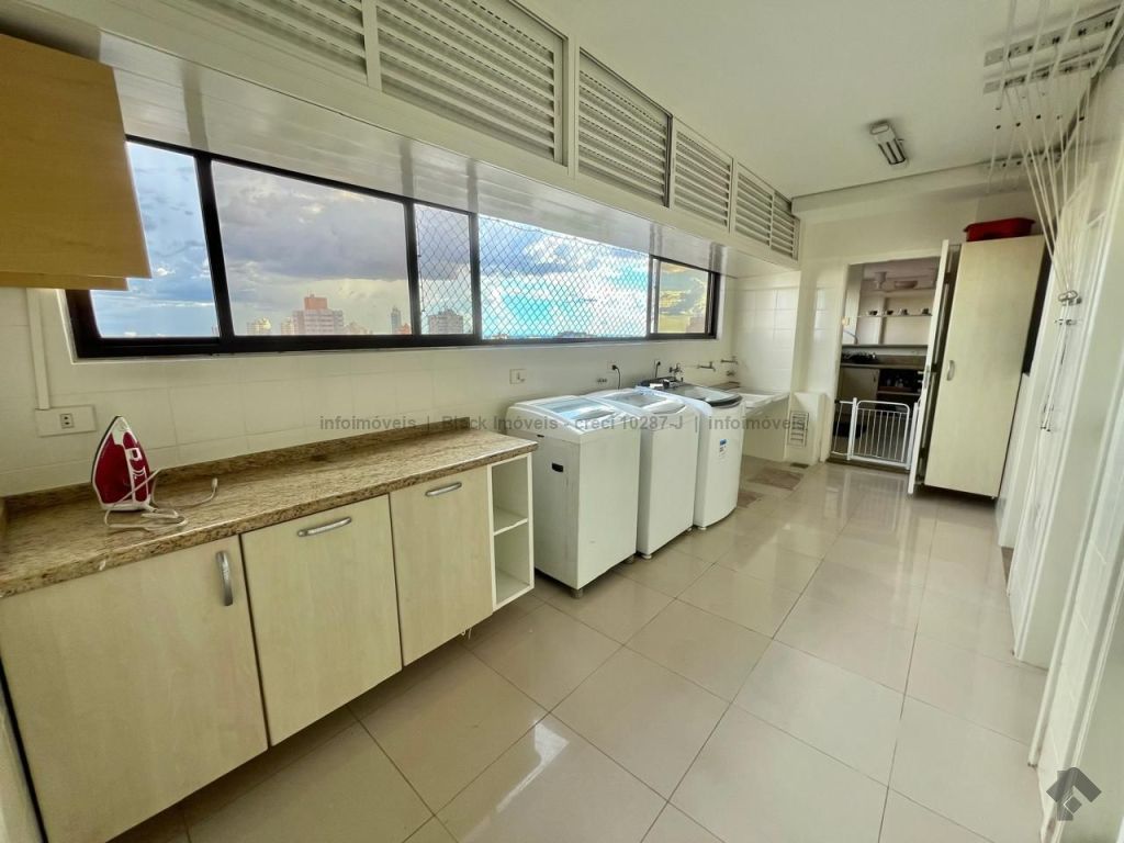 Sala para quatro ambientes, sala de jantar, escritório, varanda gourmet, lavabo, sala de TV, suíte master com closet, varanda e WC com cuba dupla, três suítes, cozinha com sala de almoço, despensa, área de serviço, quarto de serviço, WC de serviço. Três garagens independentes e box. Edifício com hall de entrada, salão de festas com dois WCs, freezer e cozinha com fogão industrial, academia, piscina com bar molhado, piscina infantil, espaço gourmet com churrasqueira, dois WCs na piscina, sauna e sala de bem-estar, sistema de segurança com circuito interno, cerca elétrica e portaria física 24 horas.