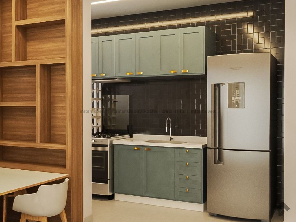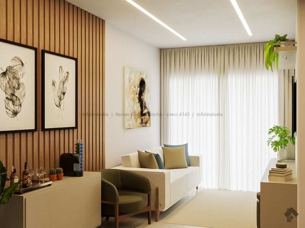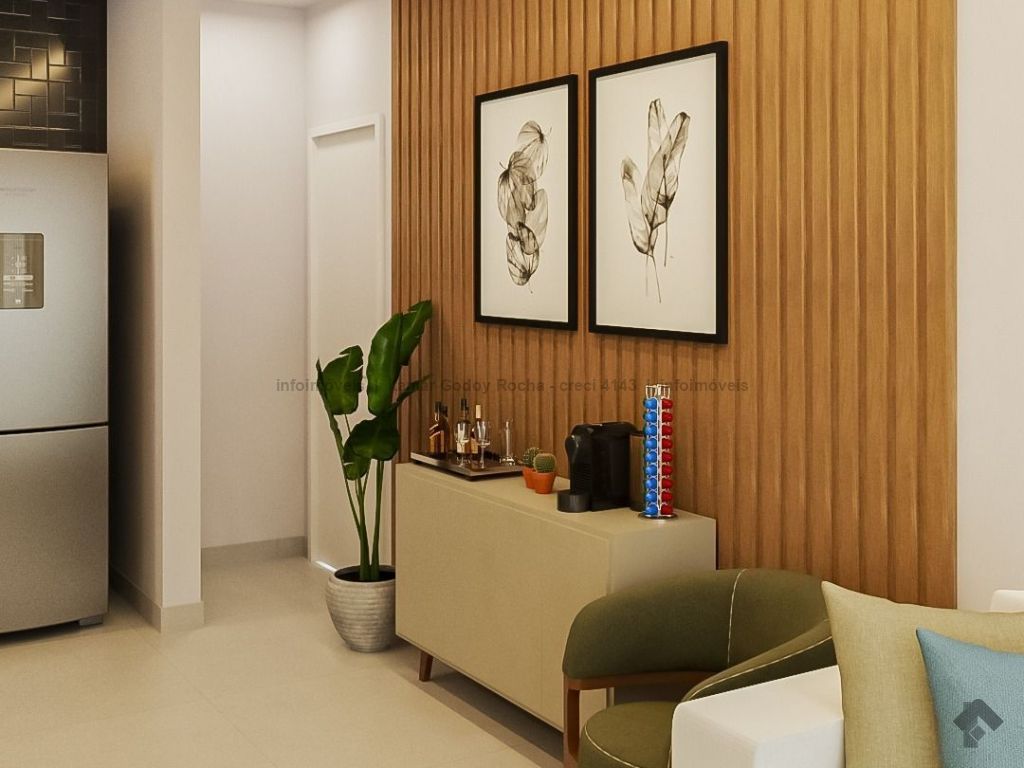 Apartamento de 65 m² no Residencial Maria Ruiz Bana com 1 suíte, 2 quartos, sala e cozinha integradas, sala de jantar, área de serviço, 1 banheiro social e sacada.
