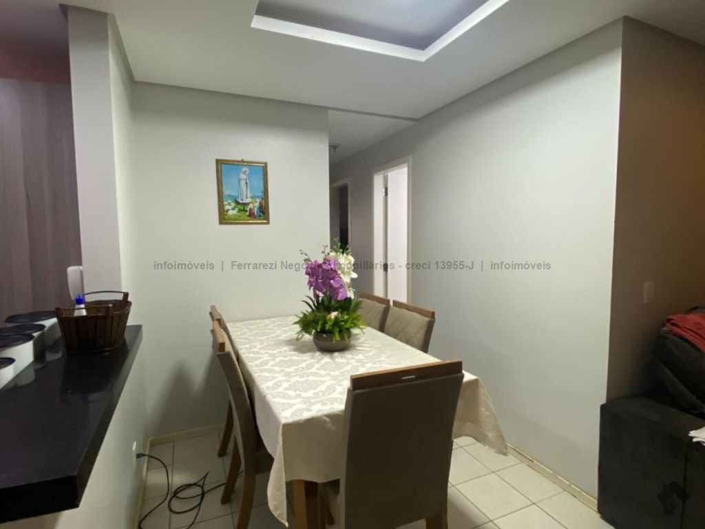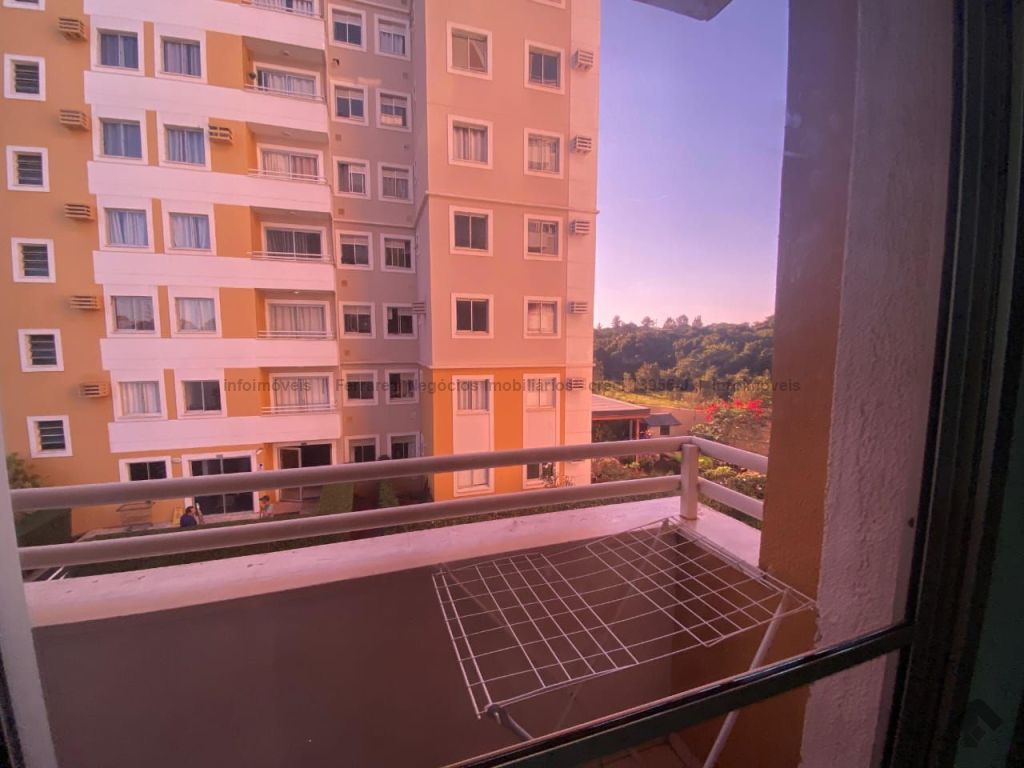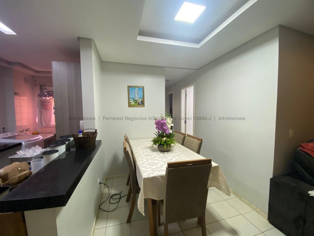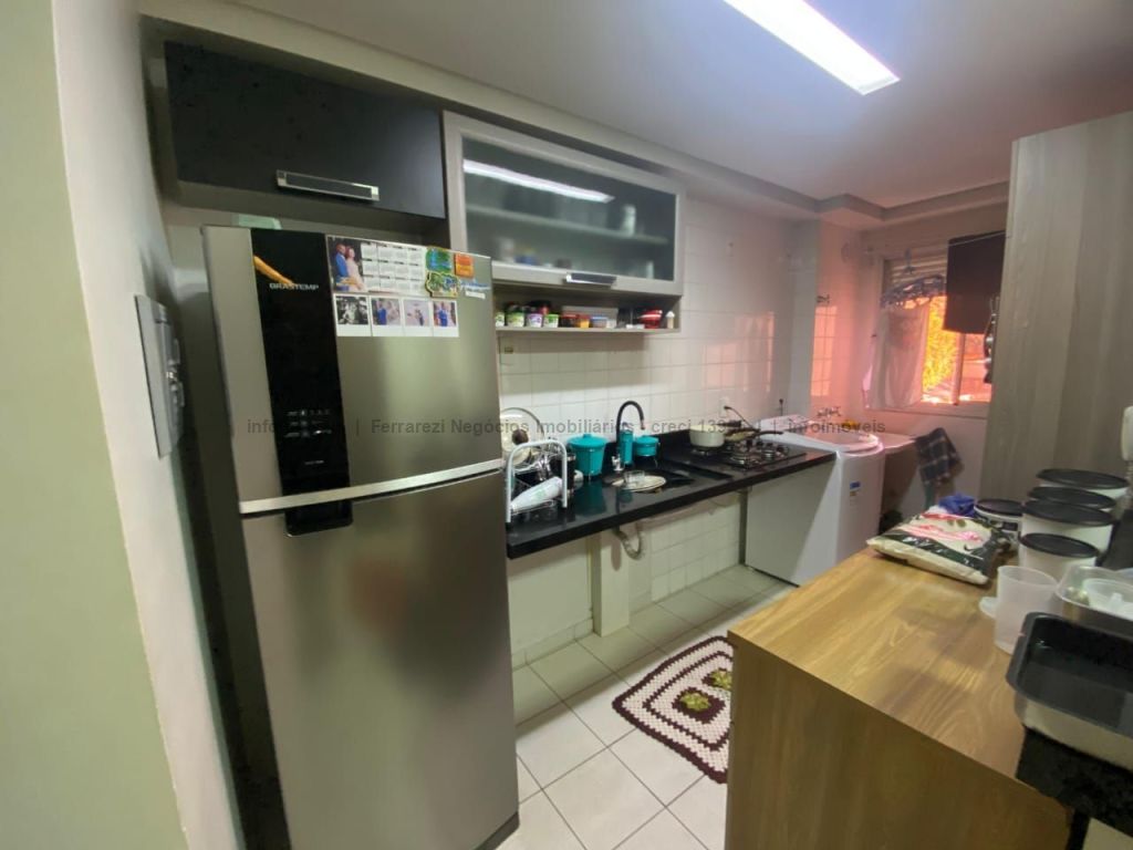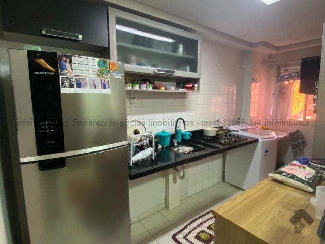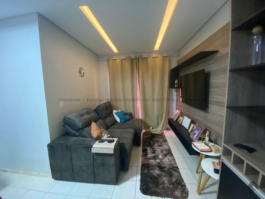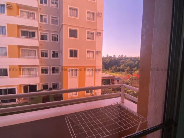 2 quartos, 1 suíte, sala, cozinha com armários, banheiro social e possui sacada.