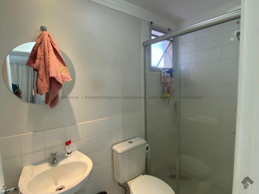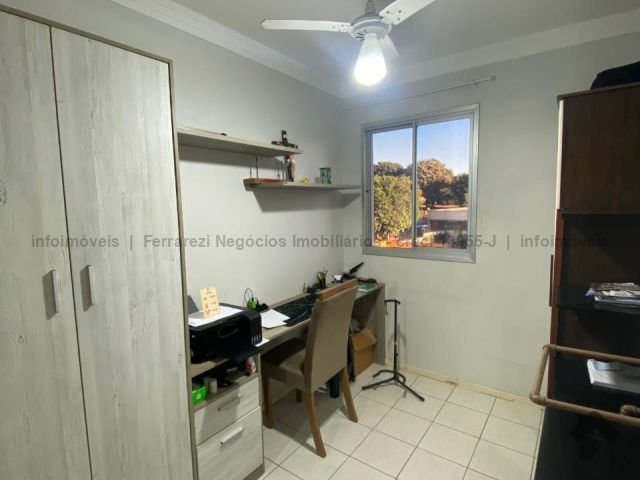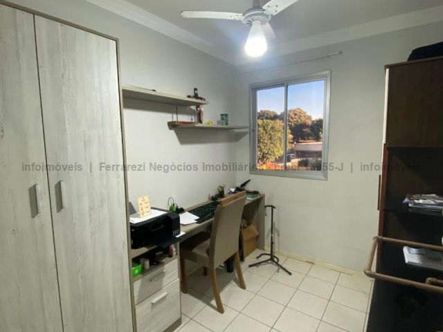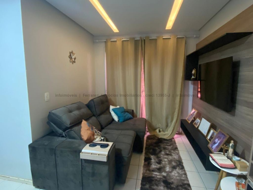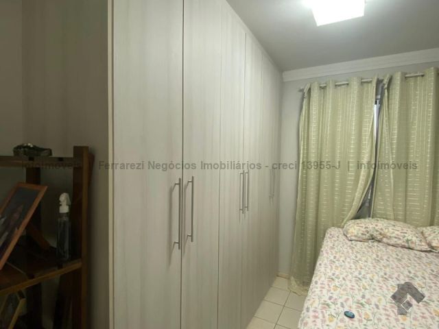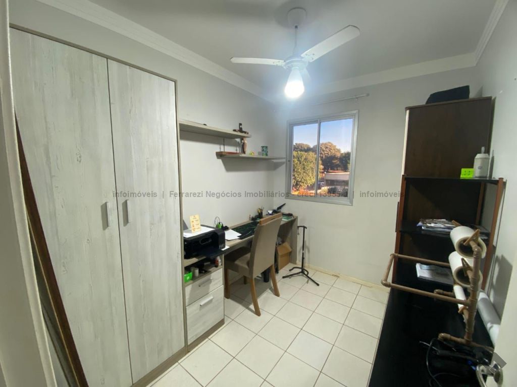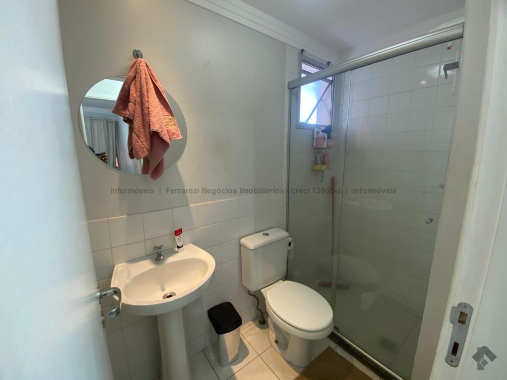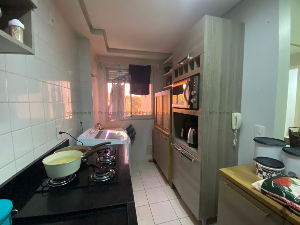 2 quartos, 1 suíte, sala, cozinha com armários, banheiro social e possui sacada.
