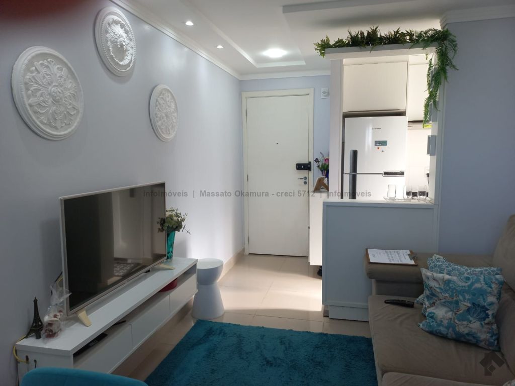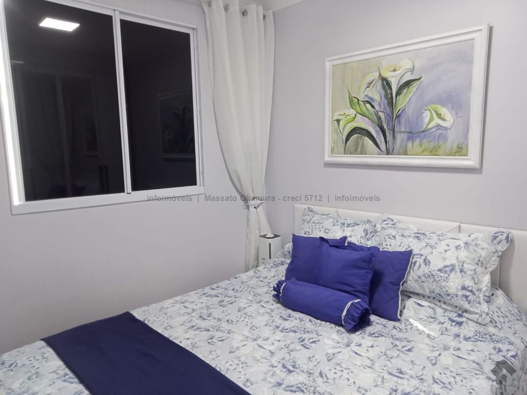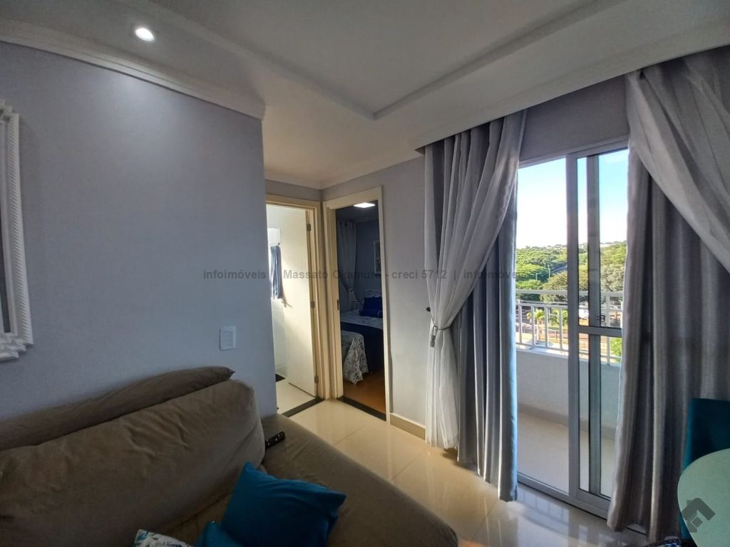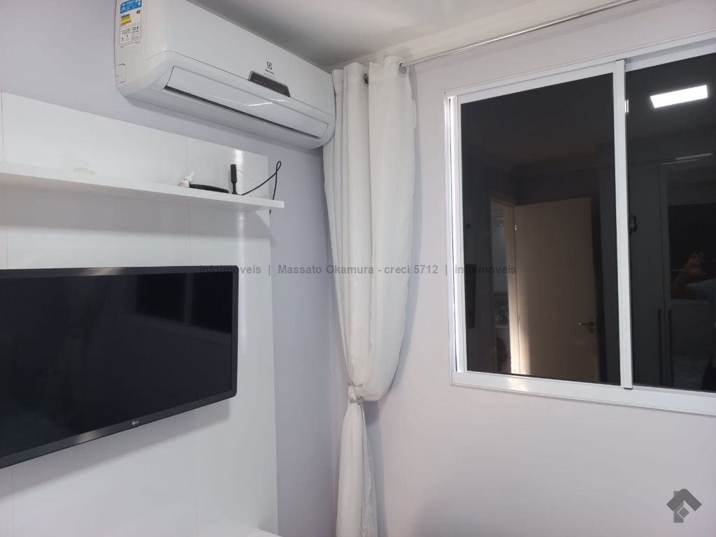 Apartamento mobiliado com ar condicionado, armários nos quartos, cozinha e banheiro, com pisos porcelanato na sala e cozinha e piso laminado nos quartos.