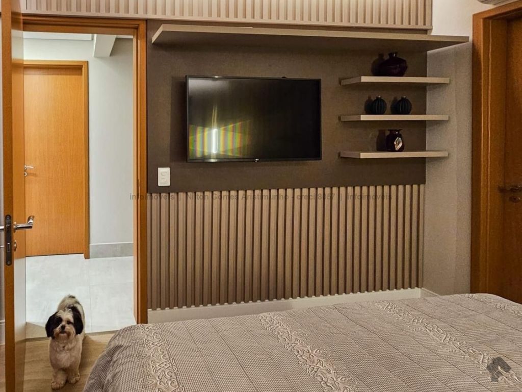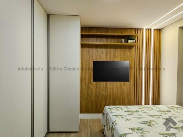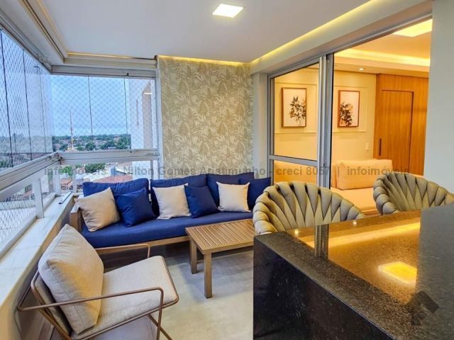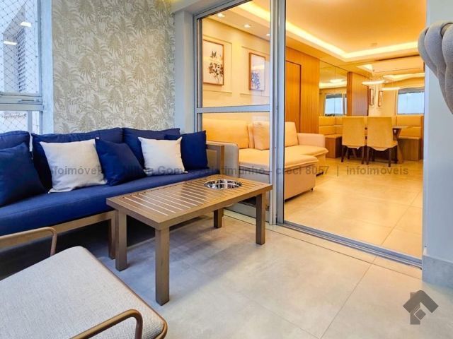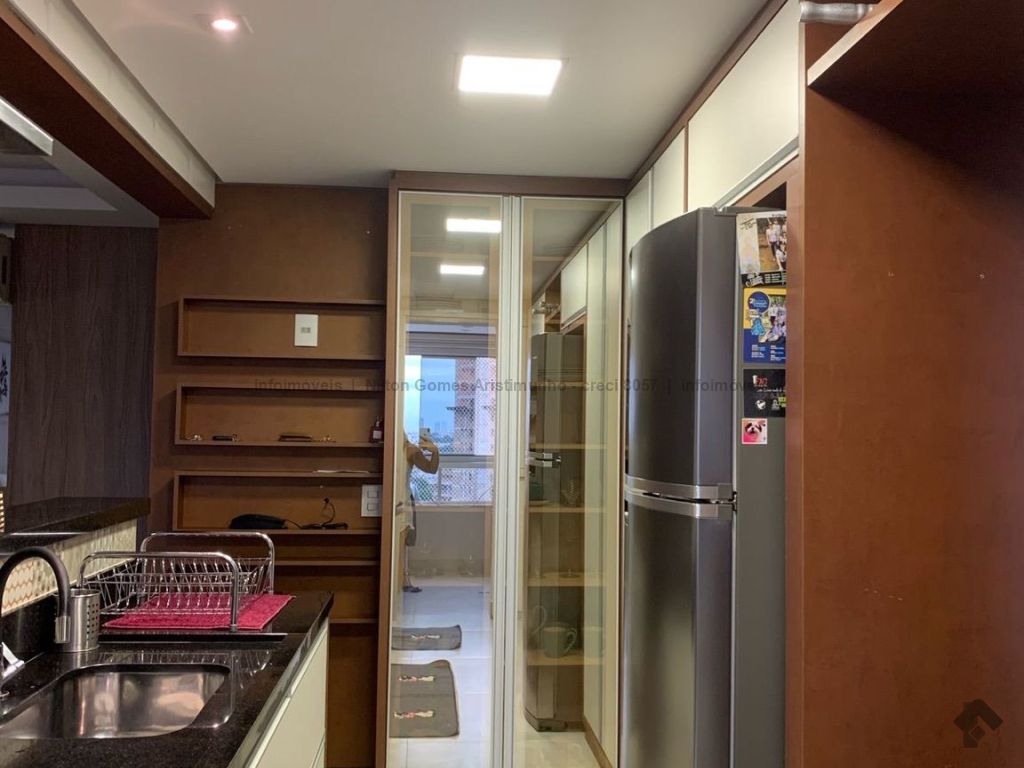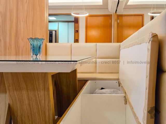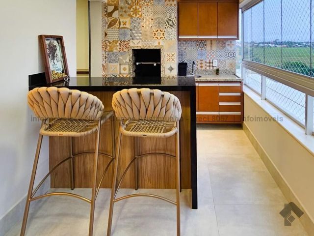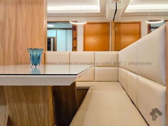 Apartamento com 99,80 m² de área privativa, a maior planta do condomínio, com churrasqueira, suíte e demi suíte, vista para a cidade, duas vagas de garagem (não é gaveta), planejados excelentes, gesso e iluminação que enriquecem ainda mais o ambiente, ar-condicionado na sala, 18.000 BTUs, e na suíte, 12.000 BTUs, cortinas e persianas na sala, quartos e sacada, sacada com fechamento em reiki, coifa, fogão embutido, canto alemão (mesa, cadeiras e banco) e duas banquetas da sacada.