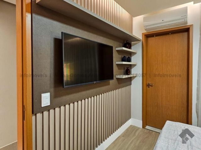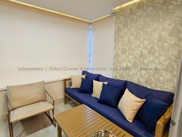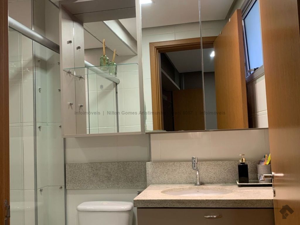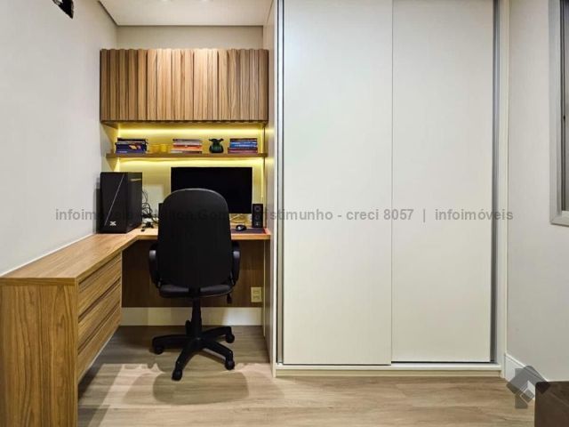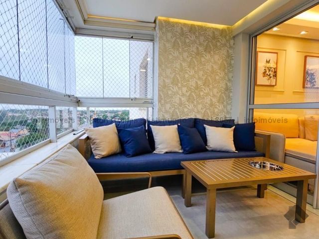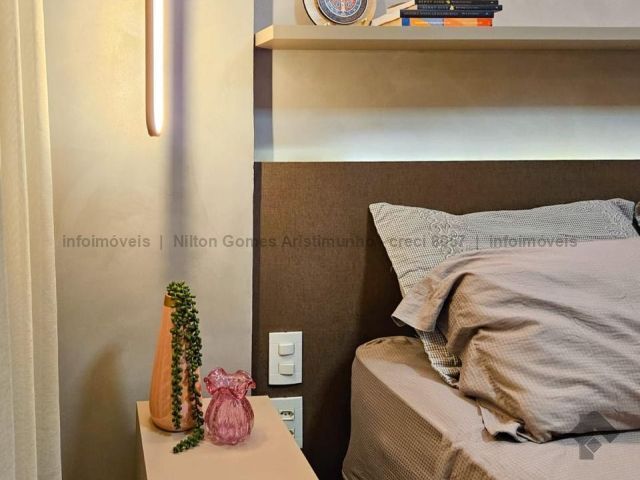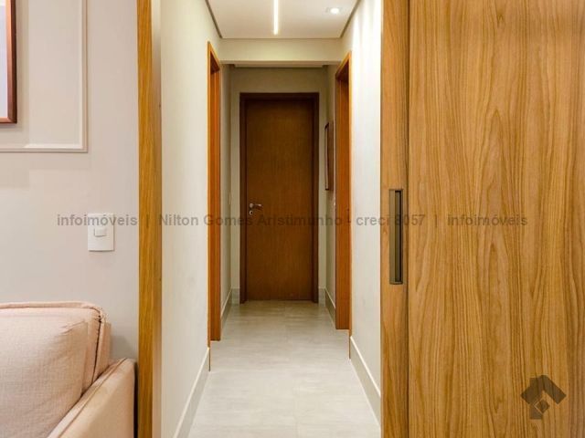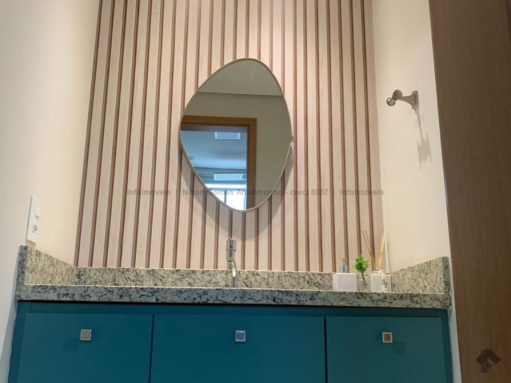 Apartamento com 99,80 m² de área privativa, a maior planta do condomínio, com churrasqueira, suíte e demi suíte, vista para a cidade, duas vagas de garagem (não é gaveta), planejados excelentes, gesso e iluminação que enriquecem ainda mais o ambiente, ar-condicionado na sala, 18.000 BTUs, e na suíte, 12.000 BTUs, cortinas e persianas na sala, quartos e sacada, sacada com fechamento em reiki, coifa, fogão embutido, canto alemão (mesa, cadeiras e banco) e duas banquetas da sacada.