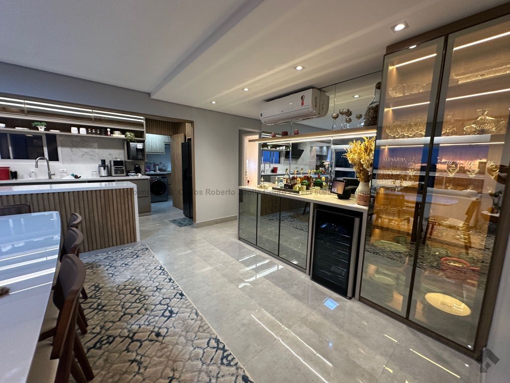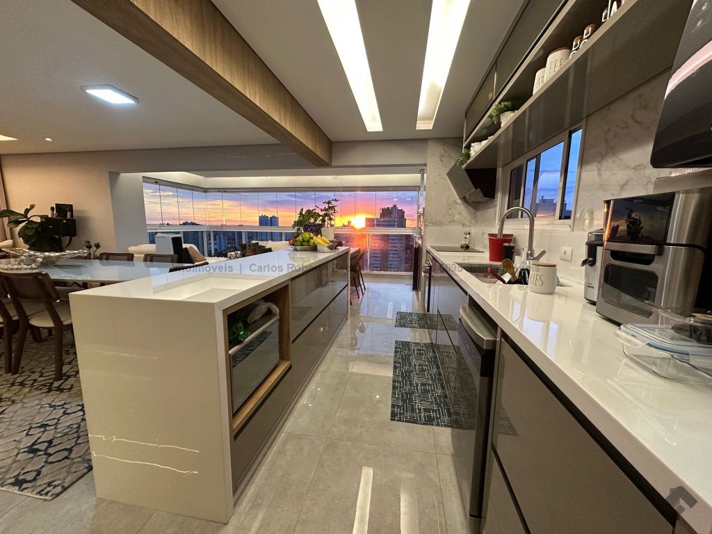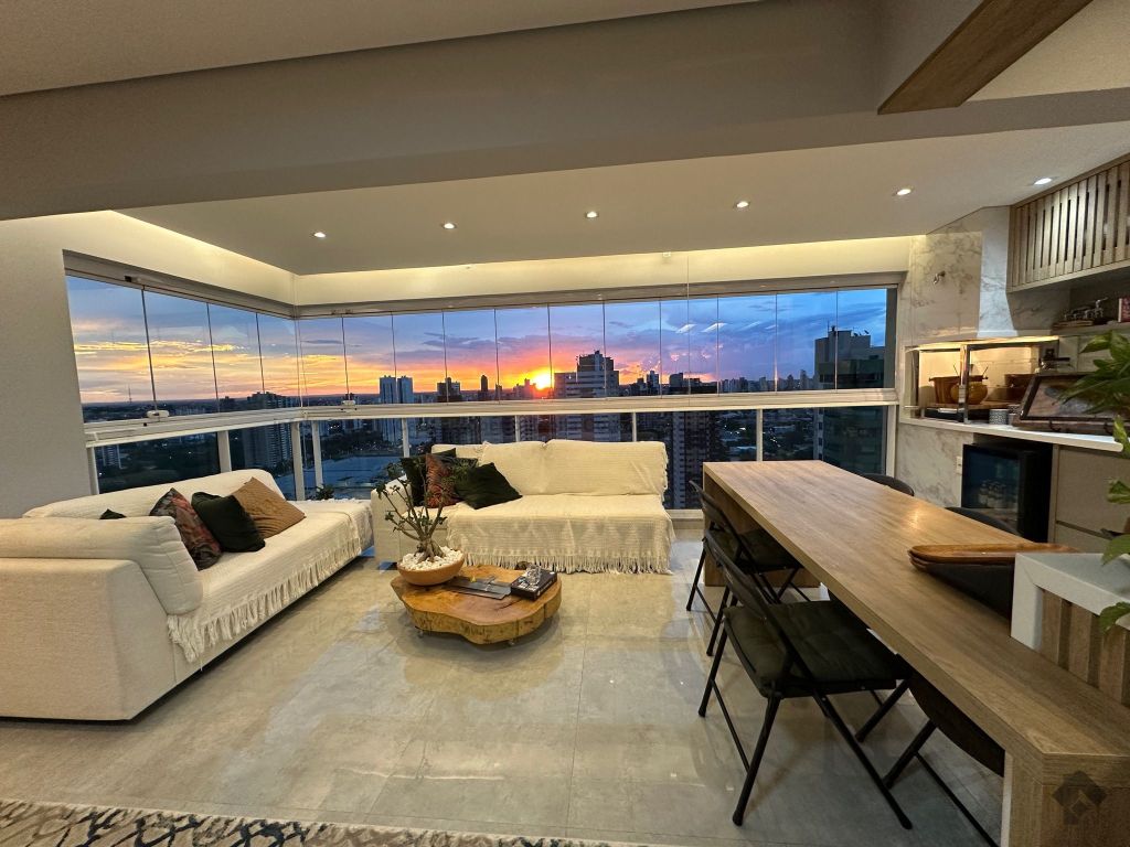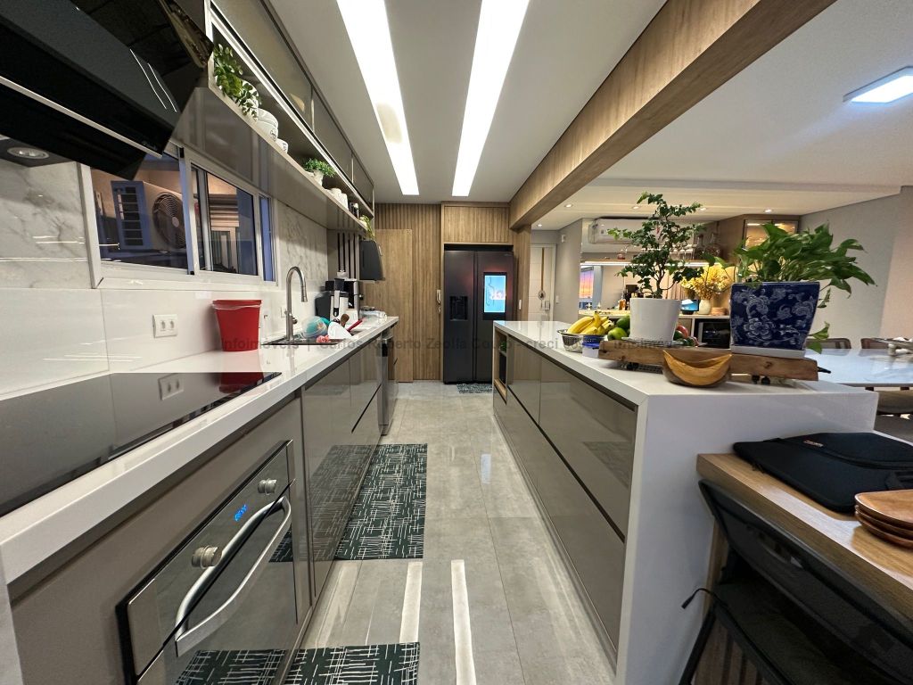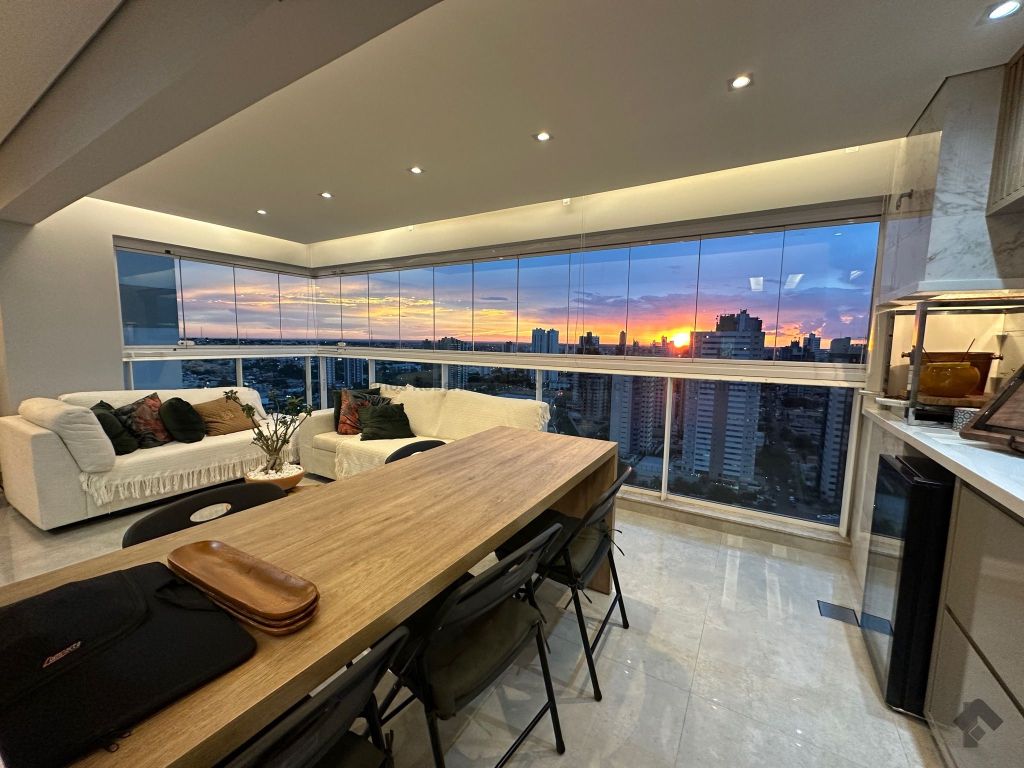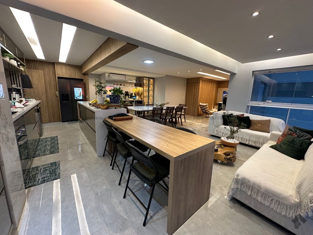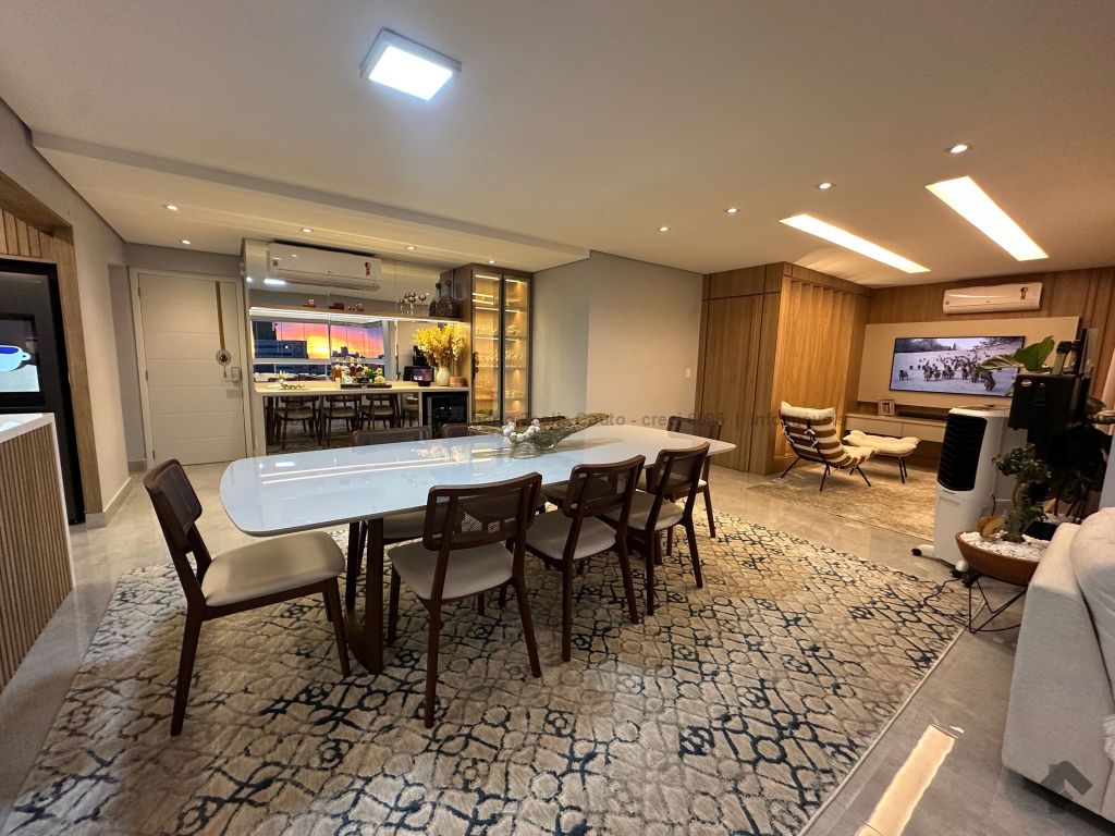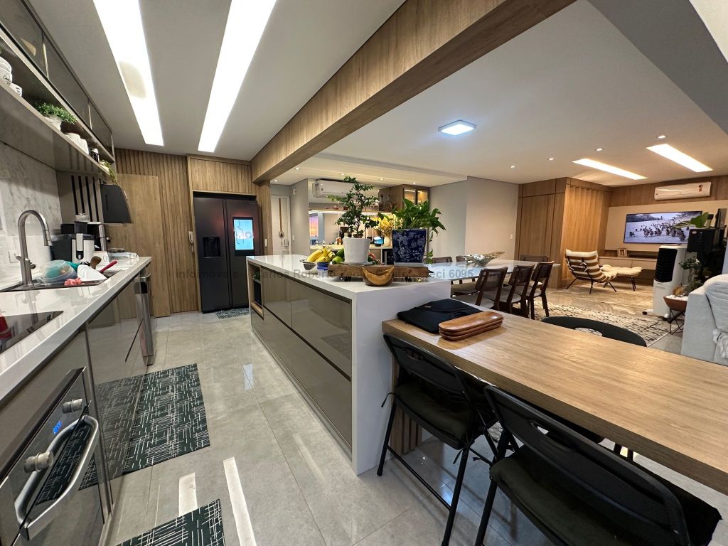 Cozinha completa, toda planejada, ilha, micro-ondas, geladeira smart, fogão de indução, coifa de sensor, filtro bland (faz refrigerante e água com gás), forno embutido, lavadora de louças. Foi trocada toda a pedraria e revestimentos. Sala ampla com dois ambientes: sala de TV com painel ripado, TV e home theater, 2 ar-condicionados em diferentes pontos, sancas, e sala de jantar com mesa laqueada e 8 lugares, cristaleira com adega, espelho bisotê e armários Reflecta. Sacada gourmet toda planejada e fechada com reiki, ar-condicionado, cervejeira e churrasqueira com gira grill, mesa de centro com lareira embutida e uma linda vista para o pôr do sol. Lavabo com pedras onix retroiluminadas.