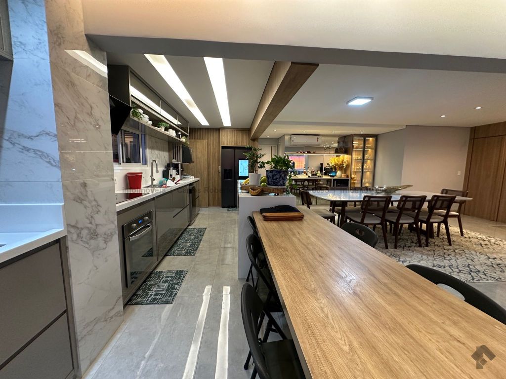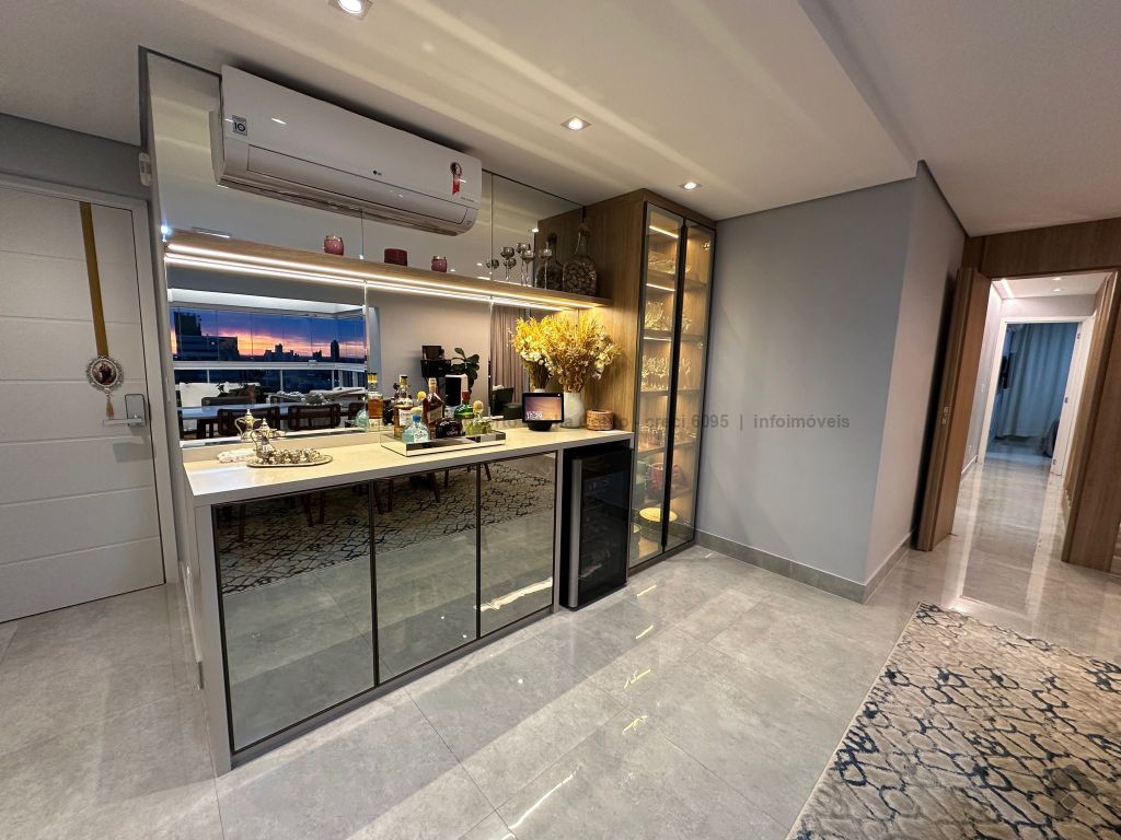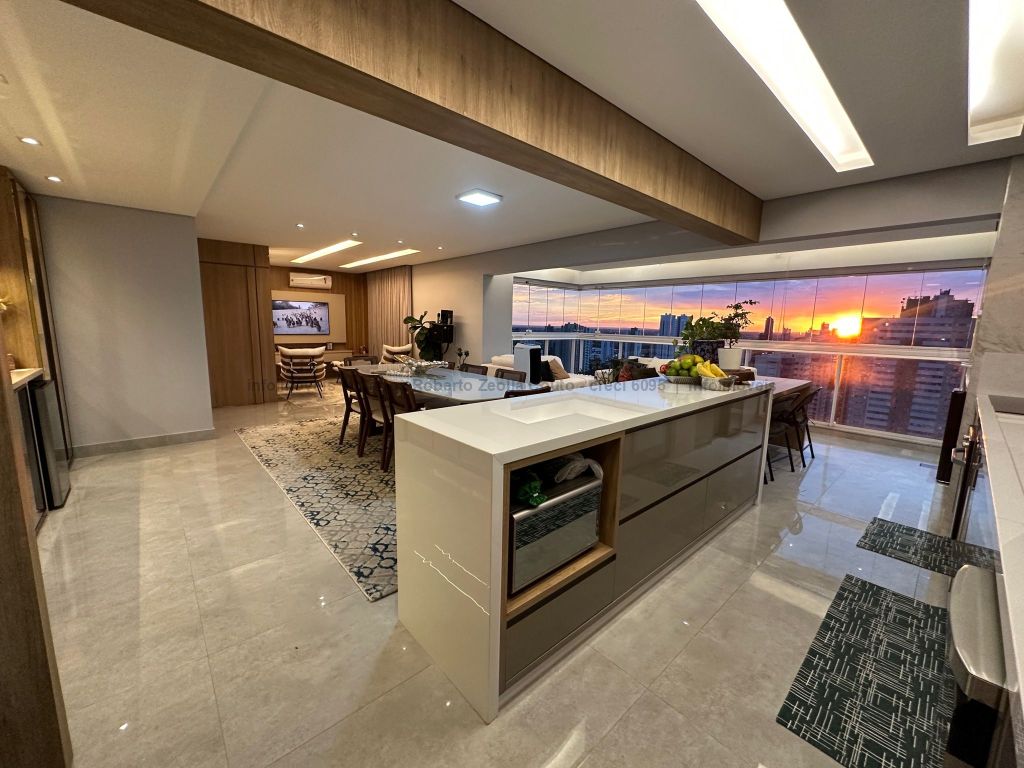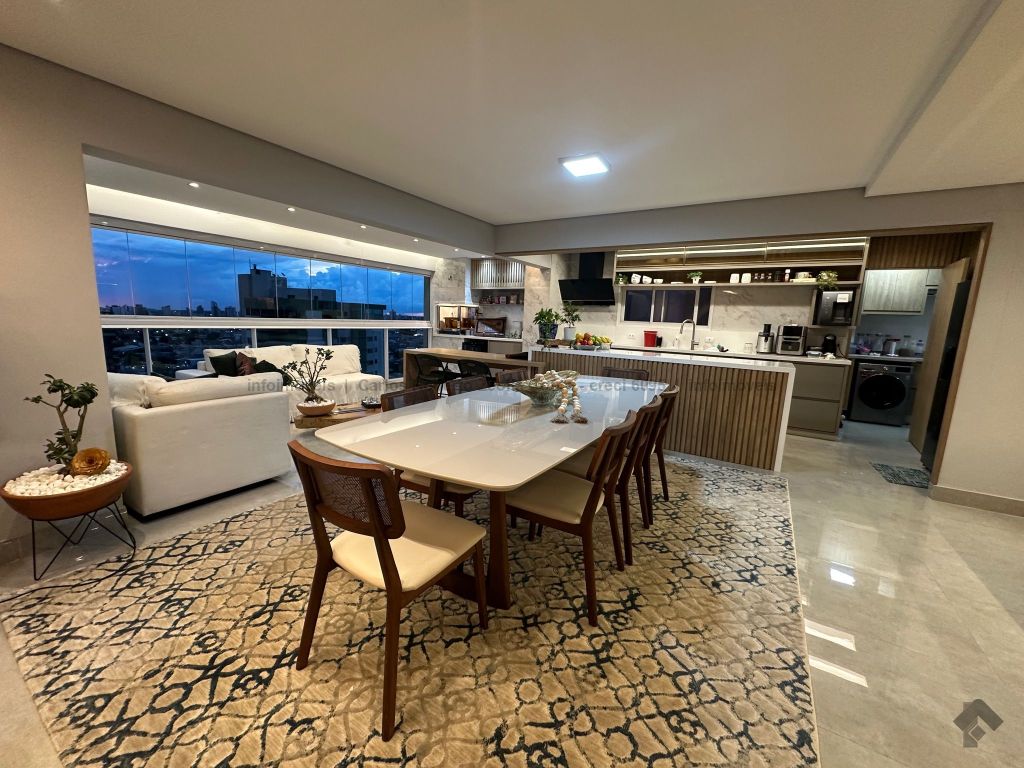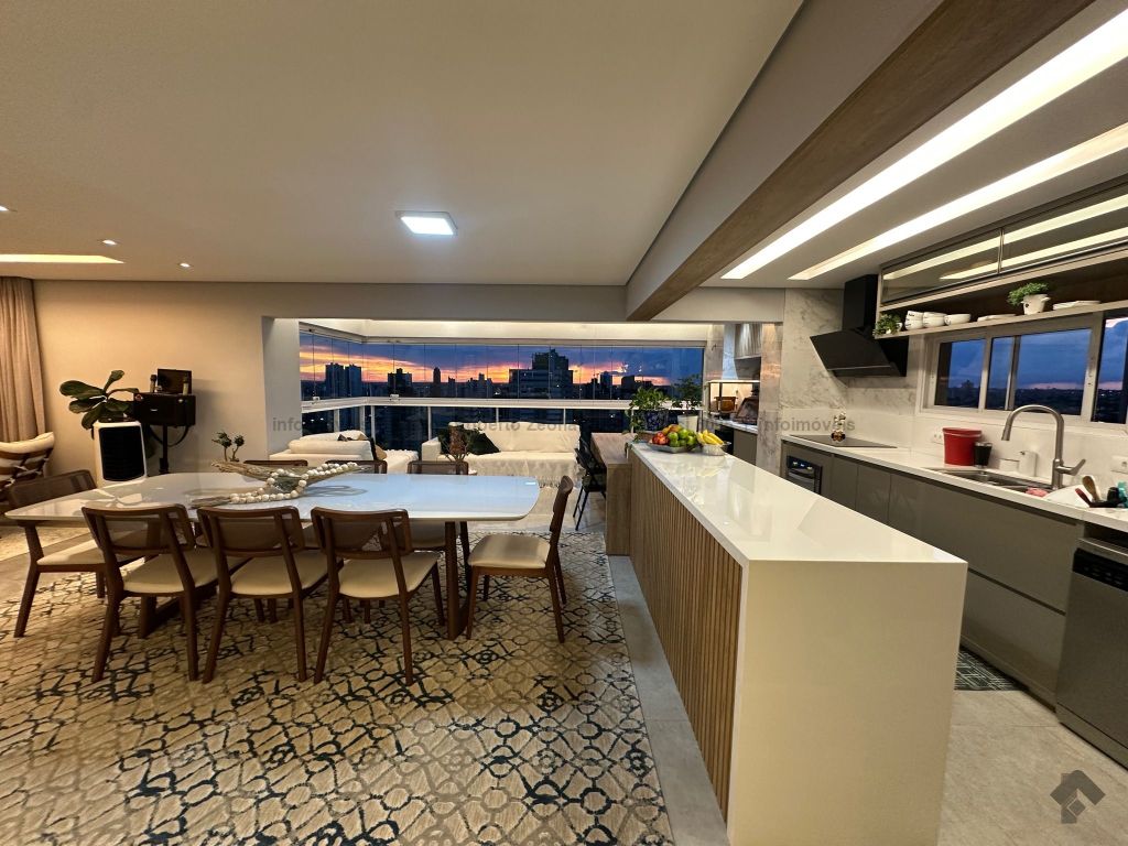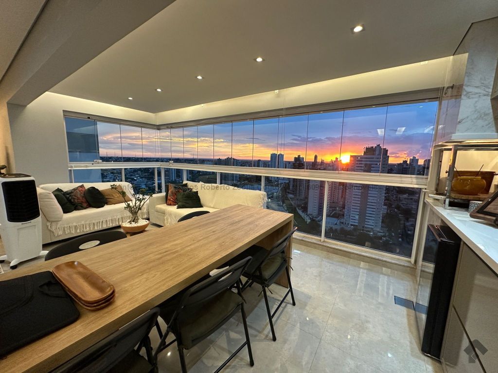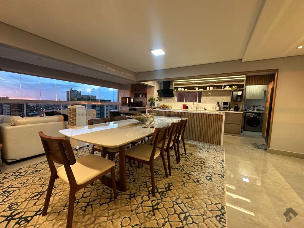 Cozinha completa, toda planejada, ilha, micro-ondas, geladeira smart, fogão de indução, coifa de sensor, filtro bland (faz refrigerante e água com gás), forno embutido, lavadora de louças. Foi trocada toda a pedraria e revestimentos. Sala ampla com dois ambientes: sala de TV com painel ripado, TV e home theater, 2 ar-condicionados em diferentes pontos, sancas, e sala de jantar com mesa laqueada e 8 lugares, cristaleira com adega, espelho bisotê e armários Reflecta. Sacada gourmet toda planejada e fechada com reiki, ar-condicionado, cervejeira e churrasqueira com gira grill, mesa de centro com lareira embutida e uma linda vista para o pôr do sol. Lavabo com pedras onix retroiluminadas.