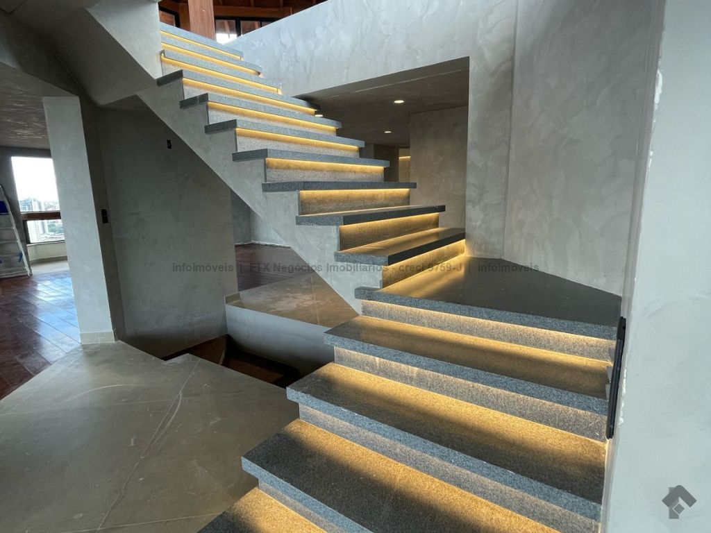 São 3 pavimentos integrando sofisticação, conforto e lazer. No primeiro piso: salas de estar/jantar, lavabo, 2 sacadas, copa, cozinha, despensa, área e banheiro de serviço, 1 suíte e 1 suíte master com closet. Segundo piso: sala de estar, sala de TV, lavabo, suíte master e depósito. Terceiro piso: espaço gourmet com cozinha, TV, lavabo, suíte ampla, sauna e piscina com vista panorâmica. Condomínio com infraestrutura completa.