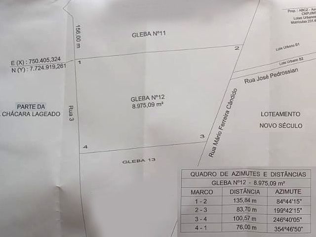 Excelente área com frente de 83,70 metros, laterais com 100,57 e 135,84 metros, com fundos de 76,00 metros e área total de 8.975,09 m², pronta para construir.