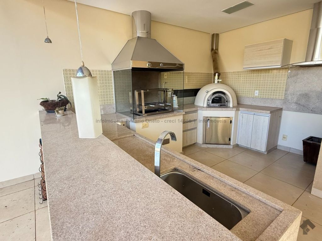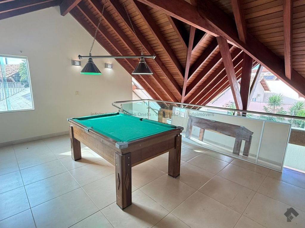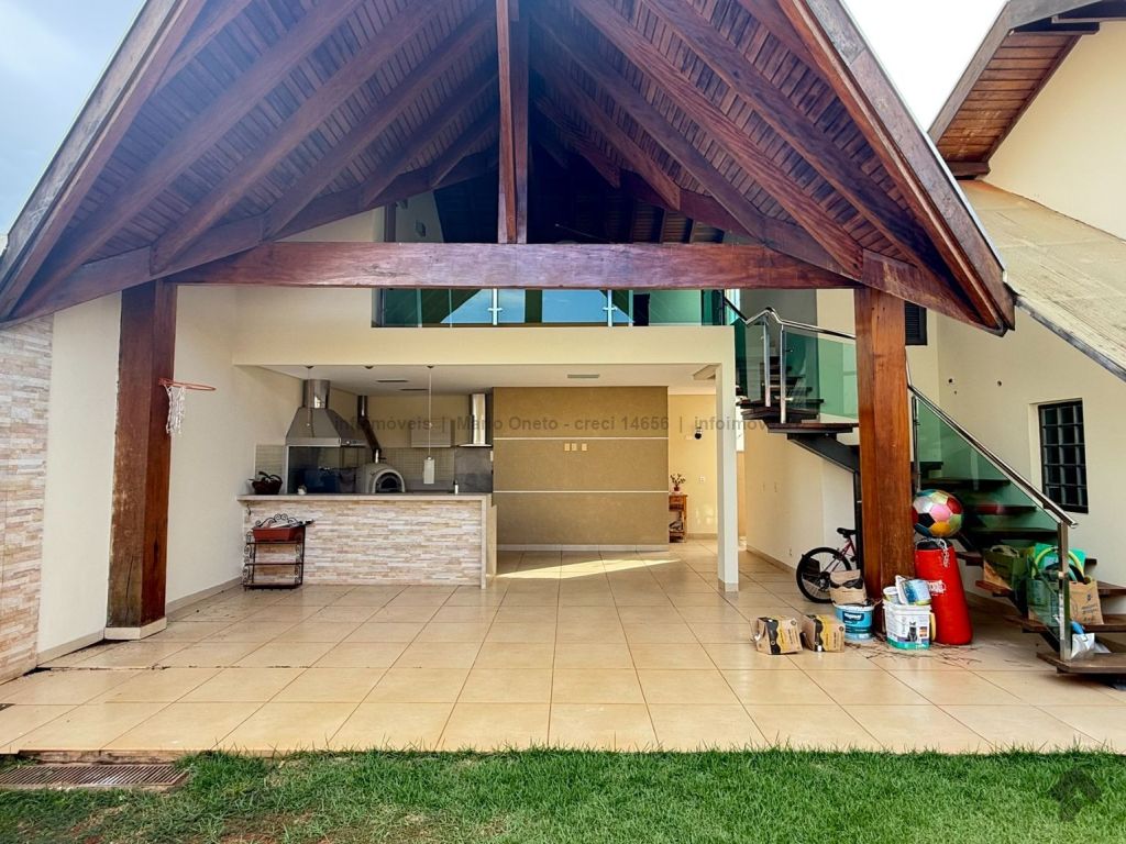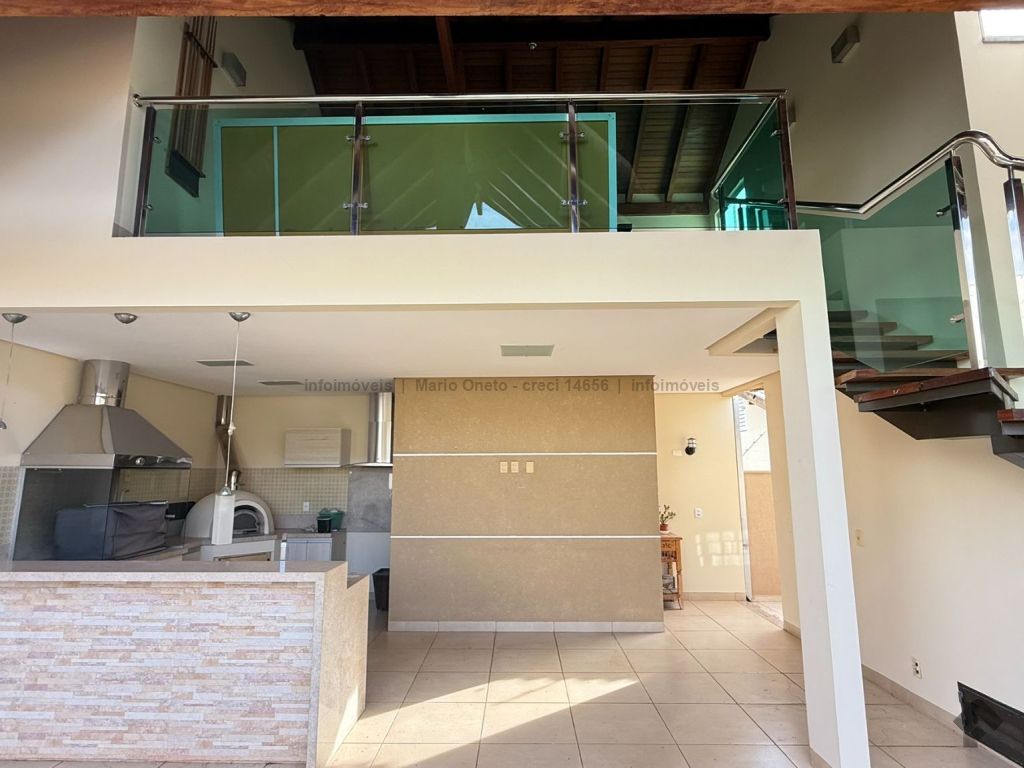 Cozinha planejada, escritório, lavabo, sala com 2 ambientes, sala de TV com planejados, jardim de inverno, 1 suíte master com closet, hidro e planejados, 1 suíte com planejados, 2 quartos, sendo 1 com planejados, 1 banheiro social com planejados. Área gourmet em madeira de lei, com churrasqueira, forno a lenha, balcão de refrigeração, exaustor para fogão e banheiro. Mezanino com mesa de sinuca e depósito. Garagem para 03 carros. Energia solar de 1100 kWh e boiler de 800 litros.