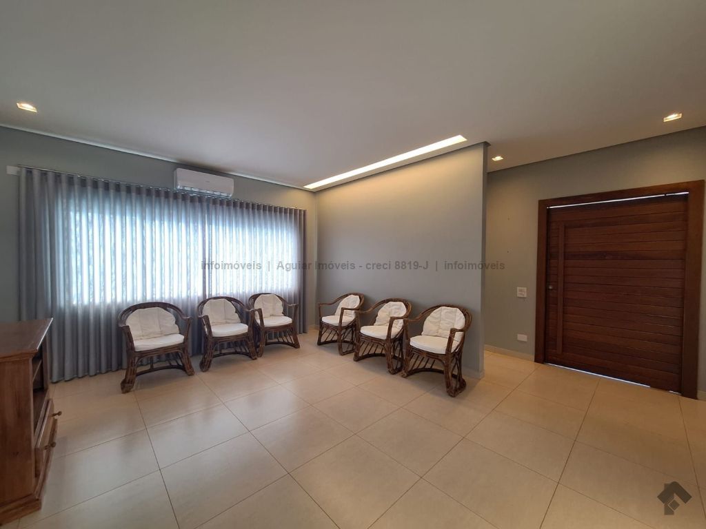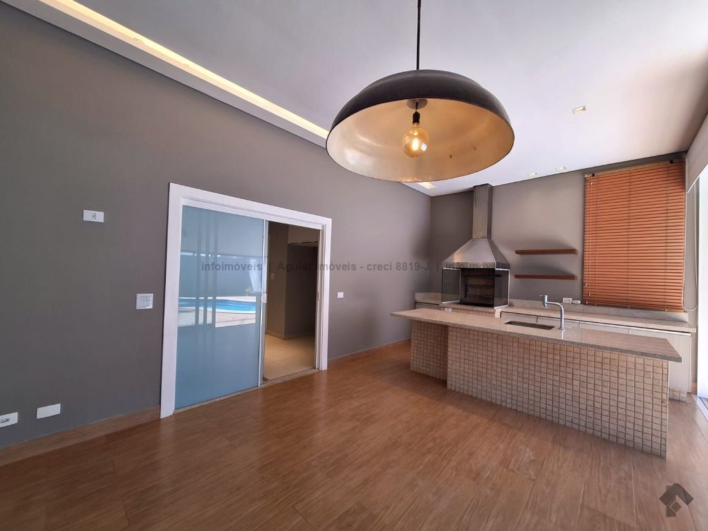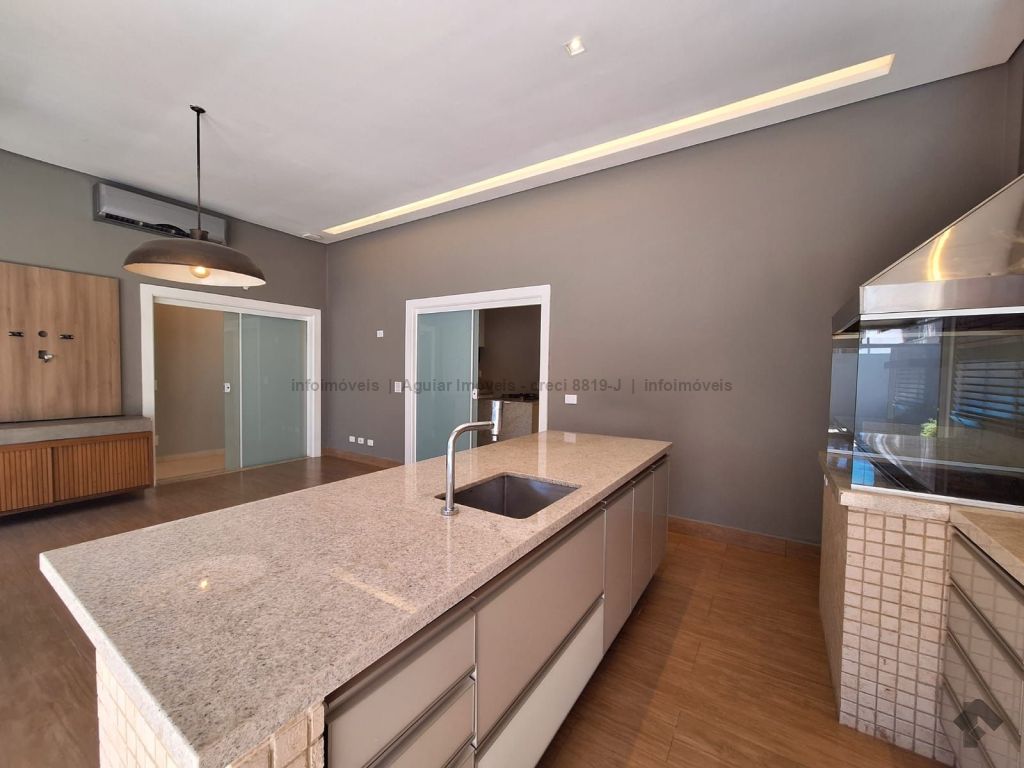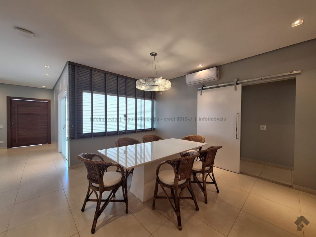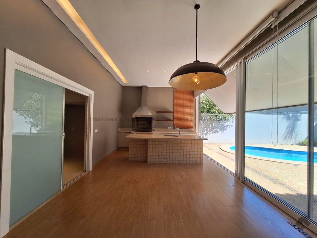 Sala de estar, lavabo, sala de jantar, cozinha com ilha, despensa, lavanderia com banheiro, três suítes com móveis planejados, espaço gourmet com bancada e churrasqueira, piscina grande e banheiro externo, quatro vagas de garagem, sendo duas cobertas e duas descobertas.
