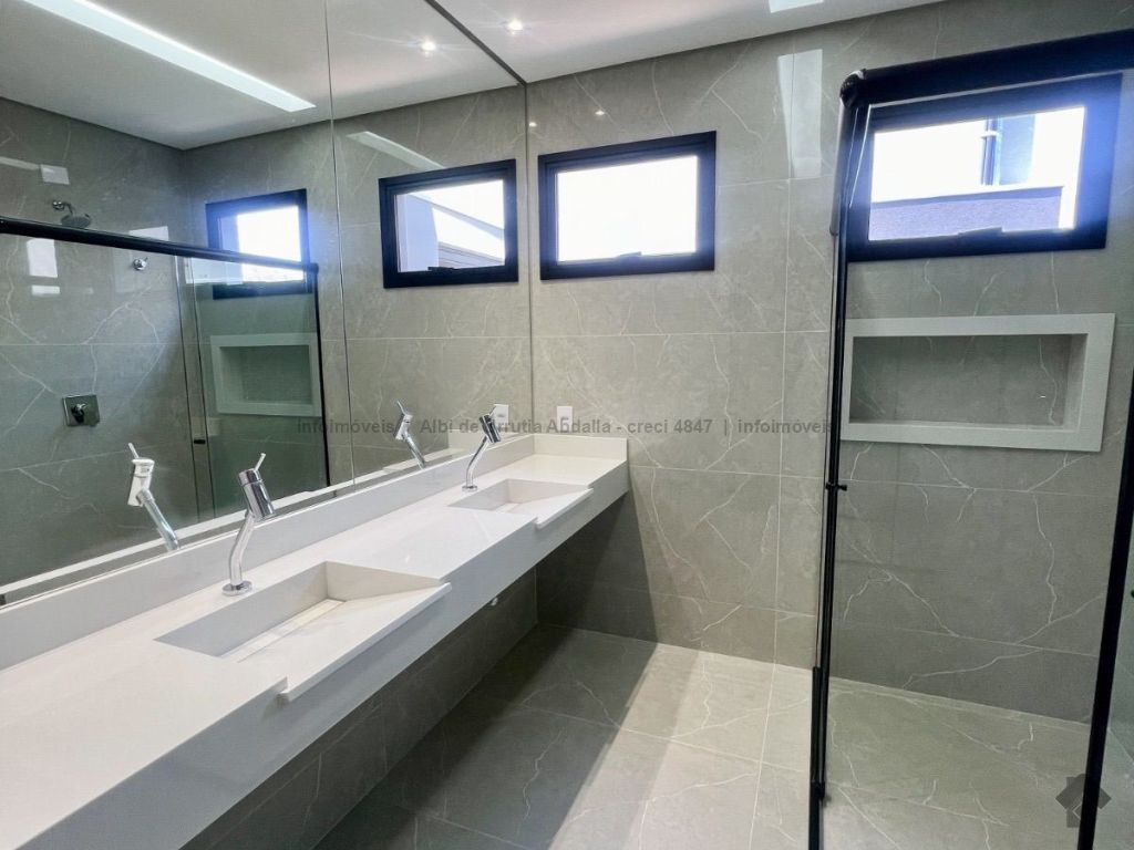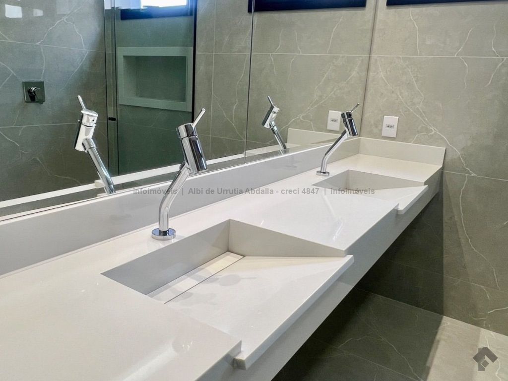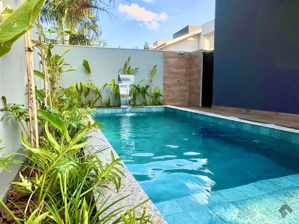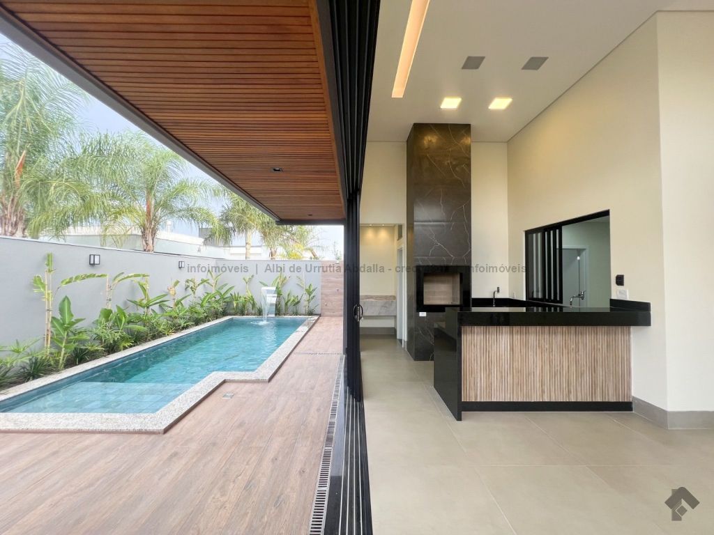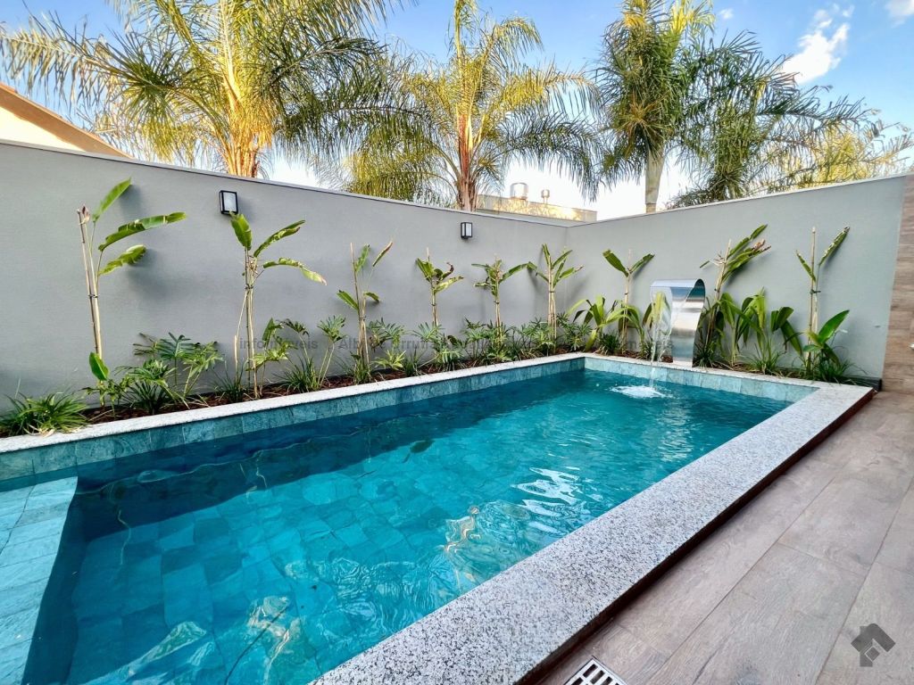 Ambientes: garagem para 2 veículos, sala de visita/TV, sala de jantar, lavabo, cozinha, área de serviço, depósito, varanda para 2 ambientes fechada com portas, churrasqueira com balcão, banheiro lazer, piscina com prainha, cascata e aquecimento, roupeiro, 2 suítes e 1 suíte com closet e banheiro com duas cubas. Espaço Gourmet com varanda com pé direito alto, balcão, pia e churrasqueira e a área de lazer completa, com jardim com paisagismo, deck e piscina com cascata. Salas e espaço gourmet com pé-direito alto, com 4,50m de altura e muito mais.