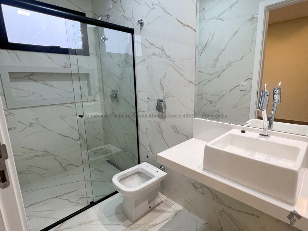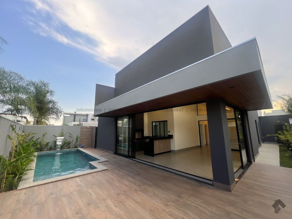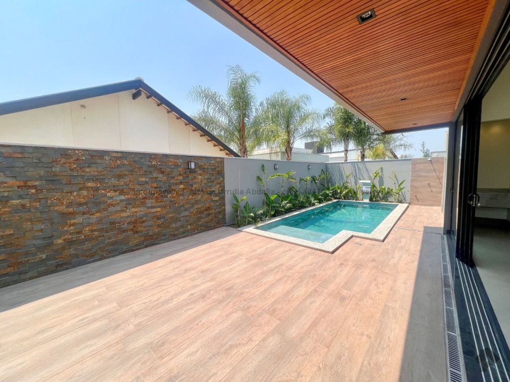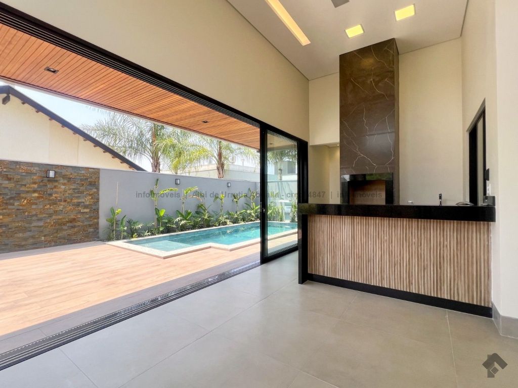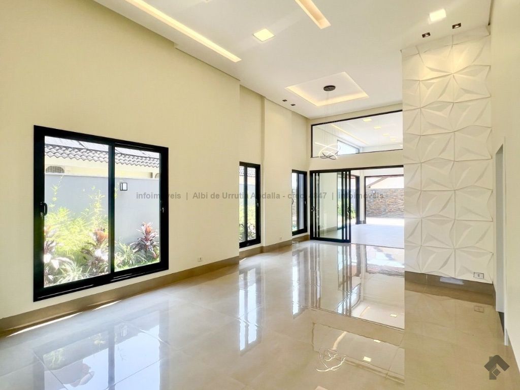 Ambientes: garagem para 2 veículos, sala de visita/TV, sala de jantar, lavabo, cozinha, área de serviço, depósito, varanda para 2 ambientes fechada com portas, churrasqueira com balcão, banheiro lazer, piscina com prainha, cascata e aquecimento, roupeiro, 2 suítes e 1 suíte com closet e banheiro com duas cubas. Espaço Gourmet com varanda com pé direito alto, balcão, pia e churrasqueira e a área de lazer completa, com jardim com paisagismo, deck e piscina com cascata. Salas e espaço gourmet com pé-direito alto, com 4,50m de altura e muito mais.